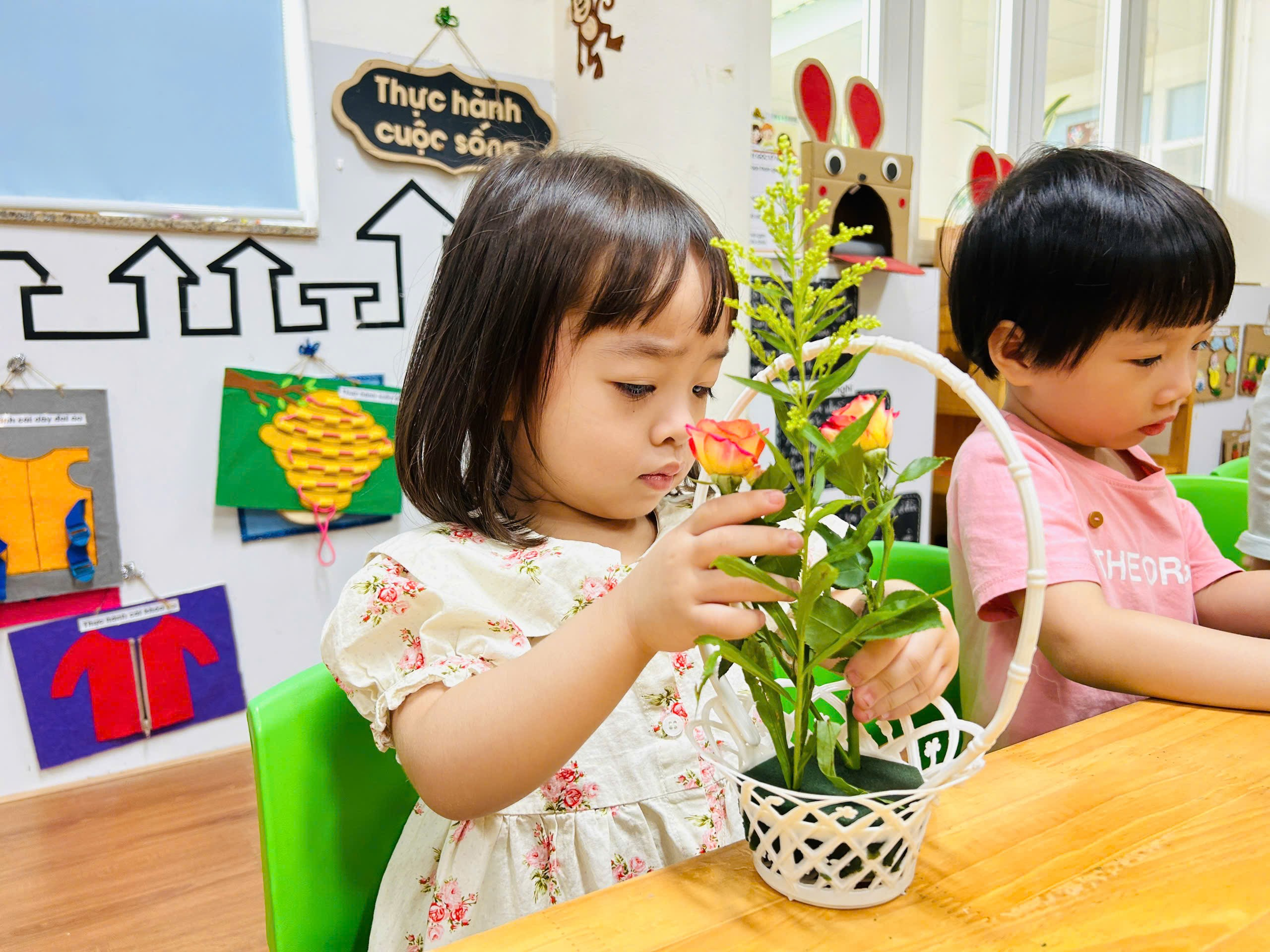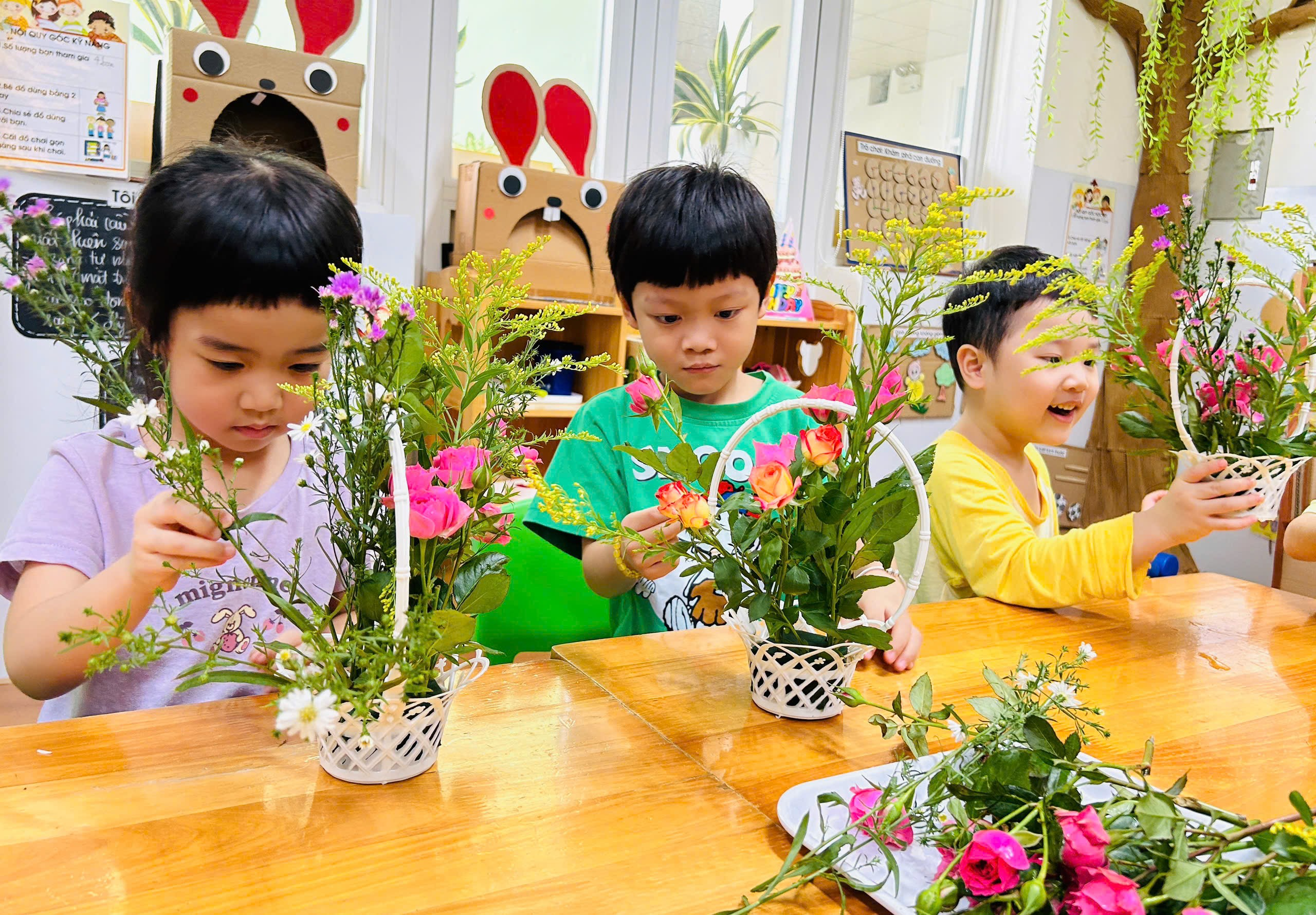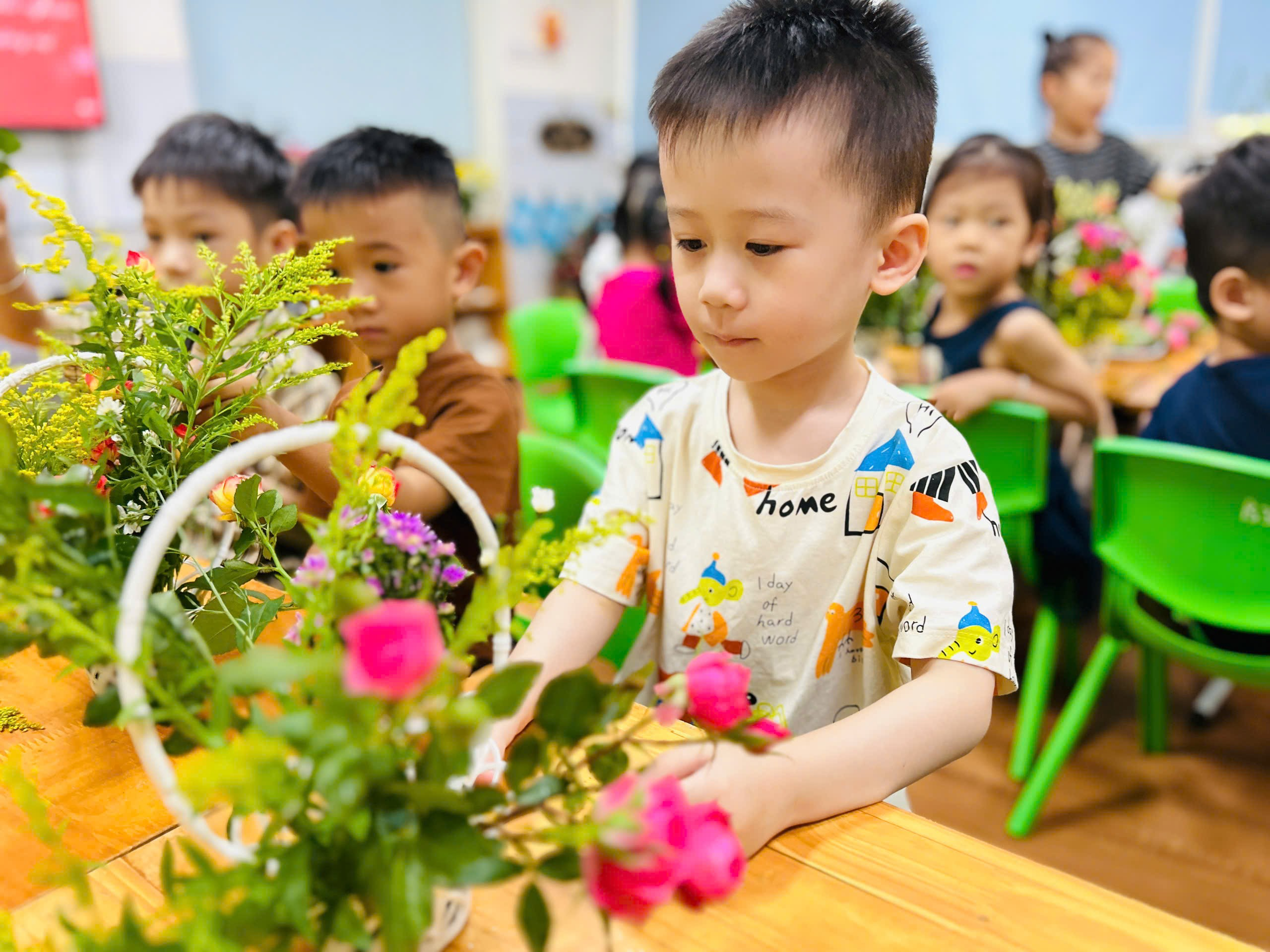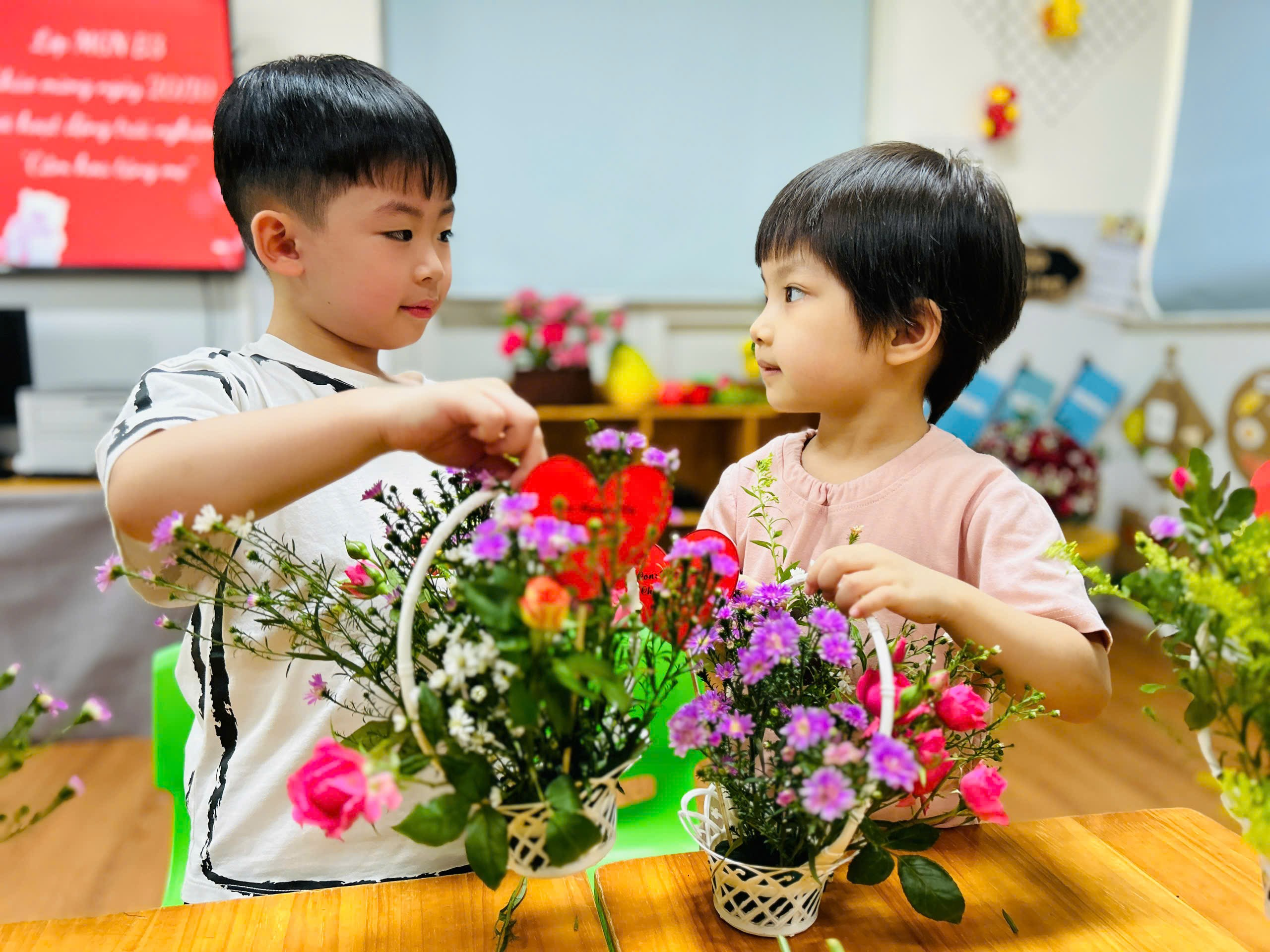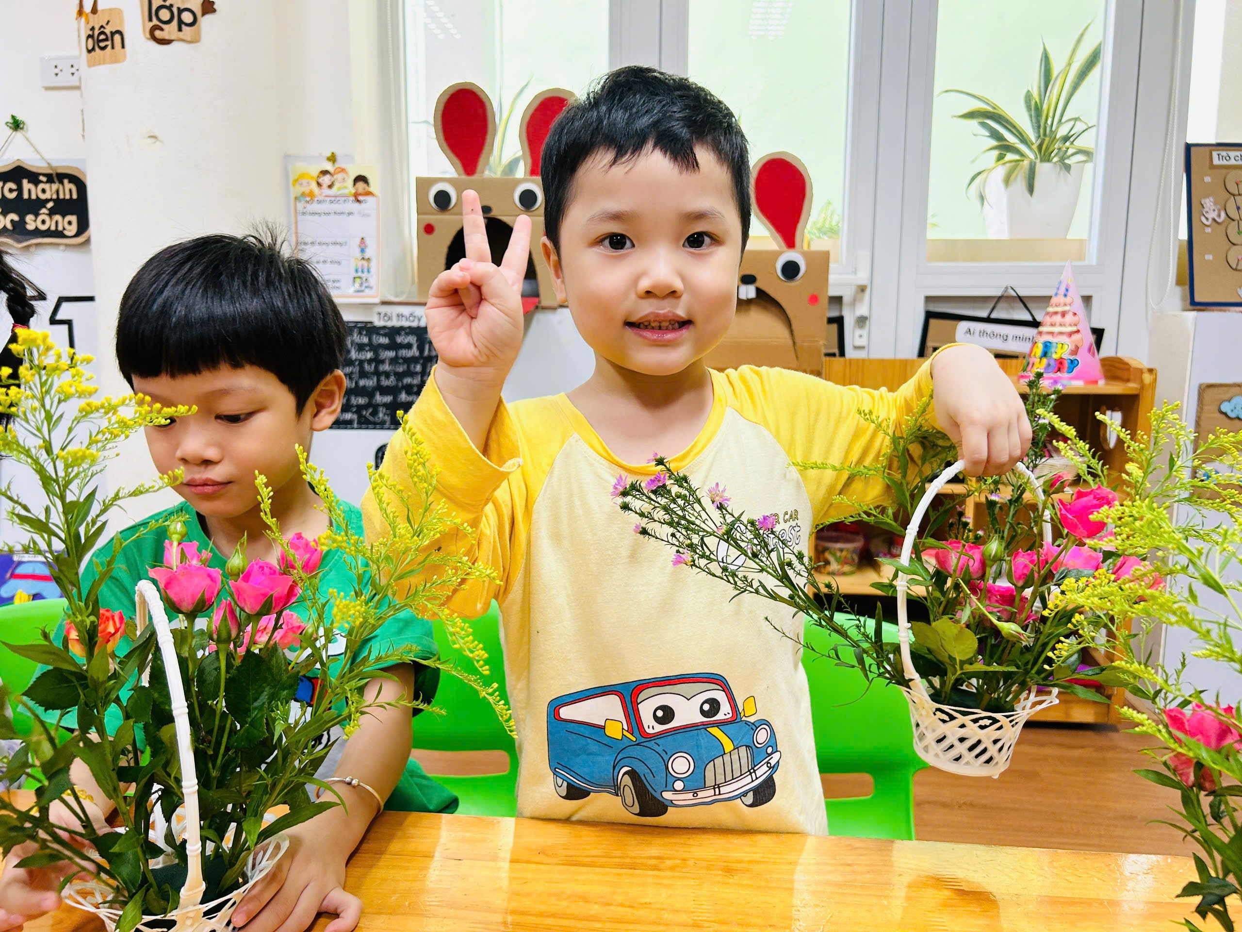Với những bàn tay nhỏ nhắn và đôi mắt lấp lánh đầy háo hức, các bé được cô giáo hướng dẫn cách tỉa lá, sắp xếp màu sắc hoa sao cho thật hài hòa. Mỗi bông hoa, mỗi nhành lá đều được các bé tỉ mỉ cắm vào giỏ với tất cả tình yêu thương dành cho mẹ, cho bà – những người phụ nữ thân yêu nhất trong gia đình.