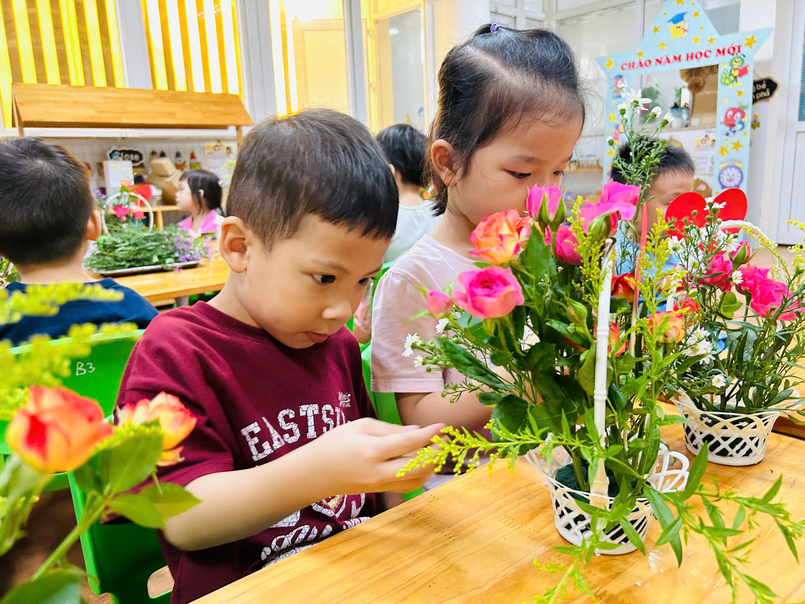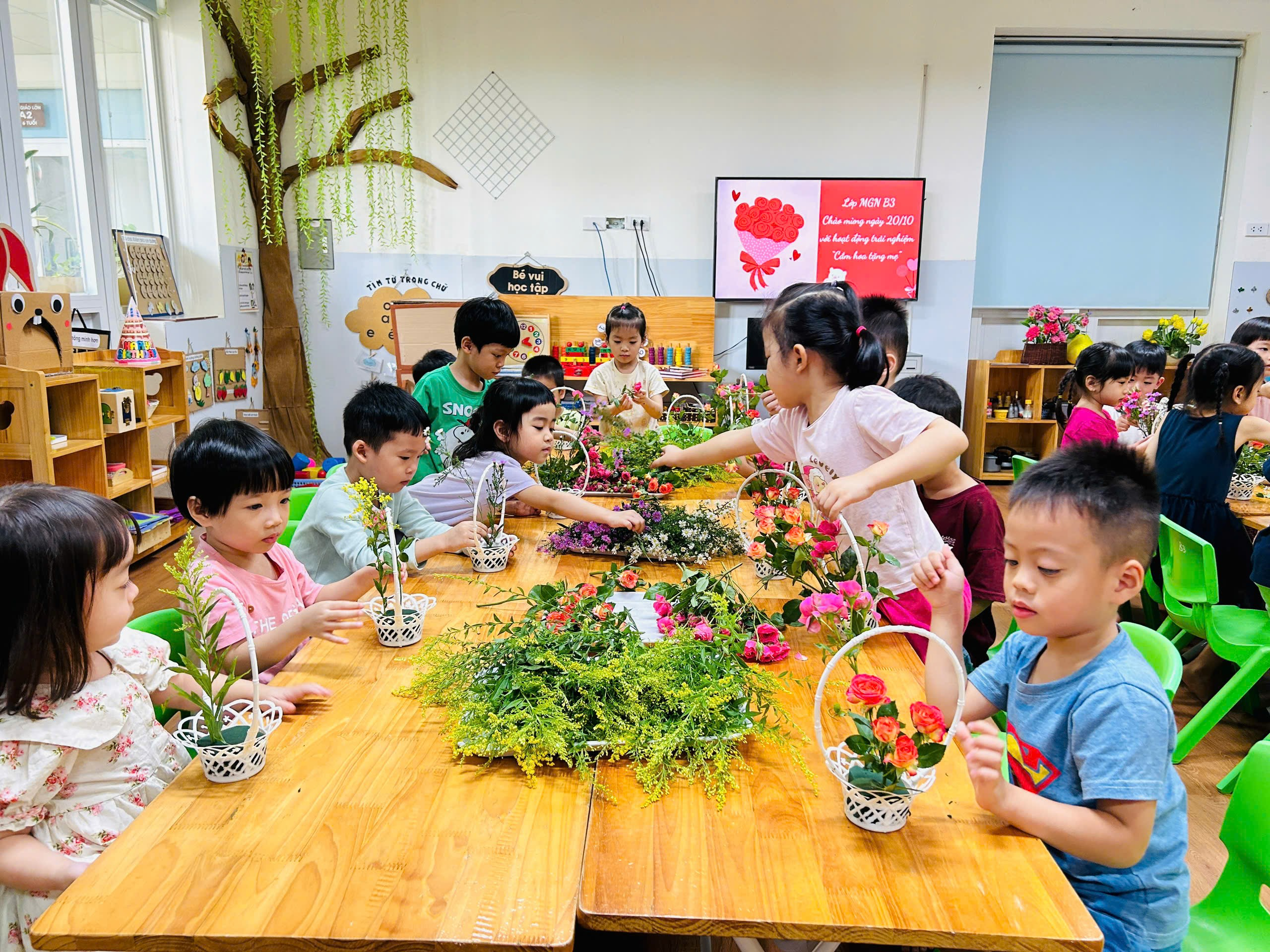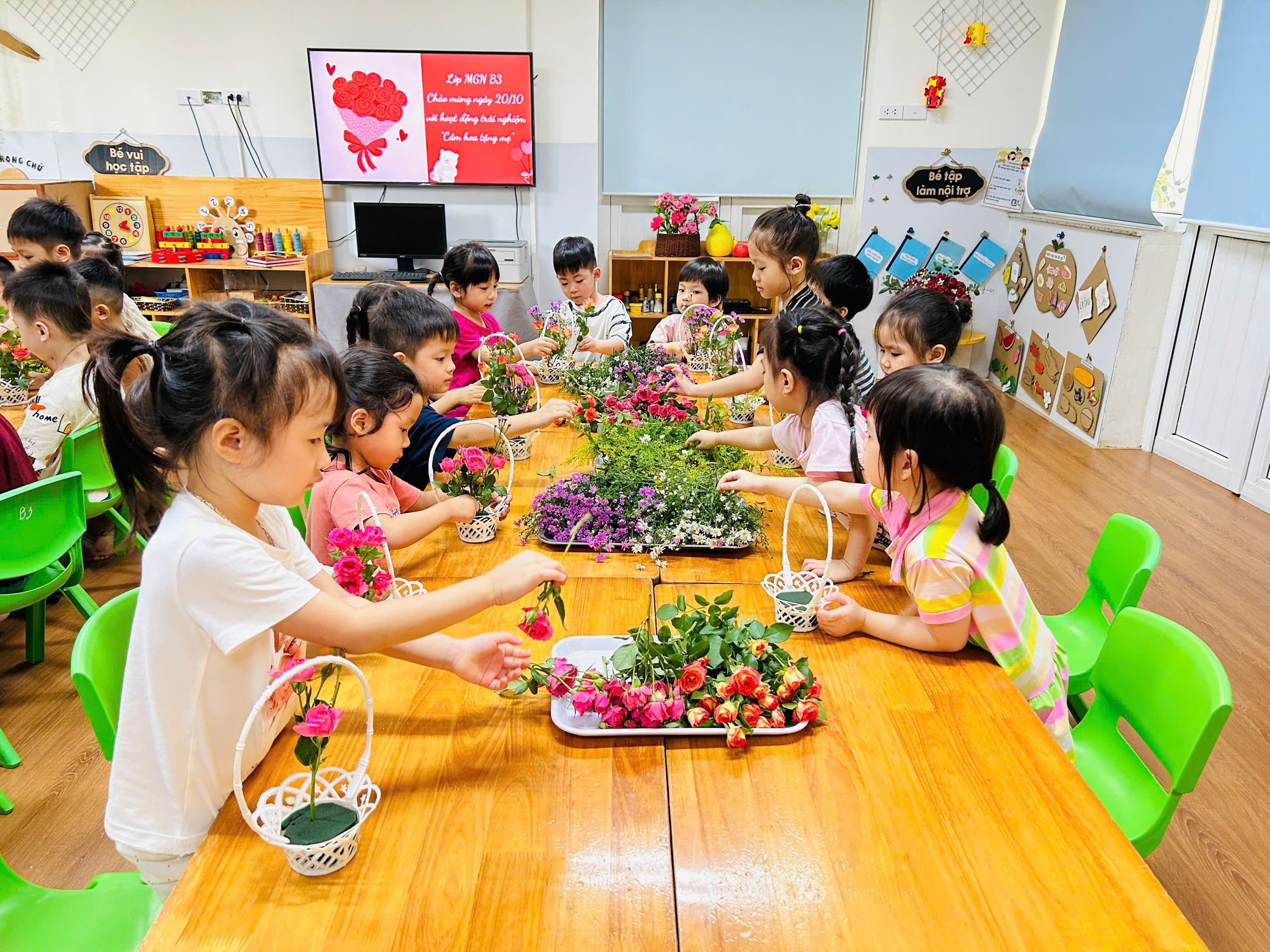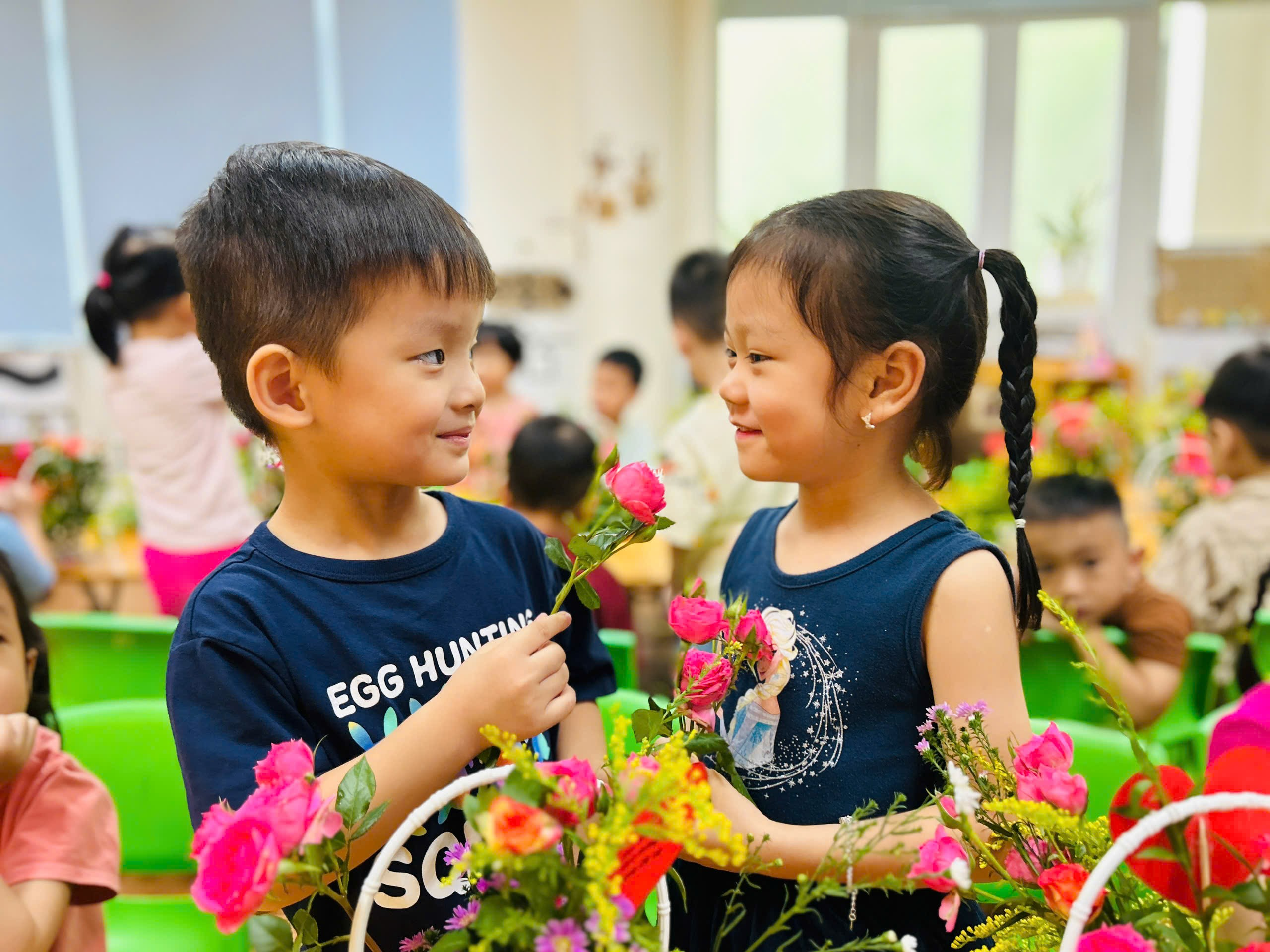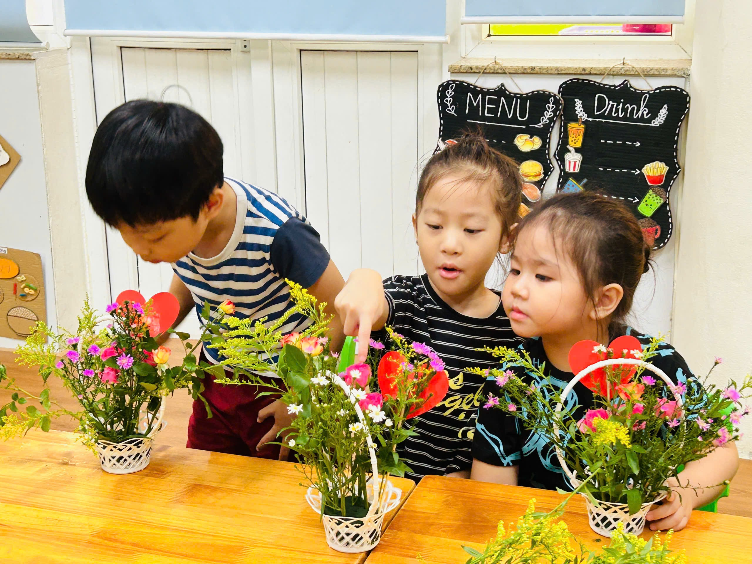 Với những bàn tay nhỏ nhắn và đôi mắt lấp lánh đầy háo hức, các bé được cô giáo hướng dẫn cách tỉa lá, sắp xếp màu sắc hoa sao cho thật hài hòa. Mỗi bông hoa, mỗi nhành lá đều được các bé tỉ mỉ cắm vào giỏ với tất cả tình yêu thương dành cho mẹ, cho bà – những người phụ nữ thân yêu nhất trong gia đình.