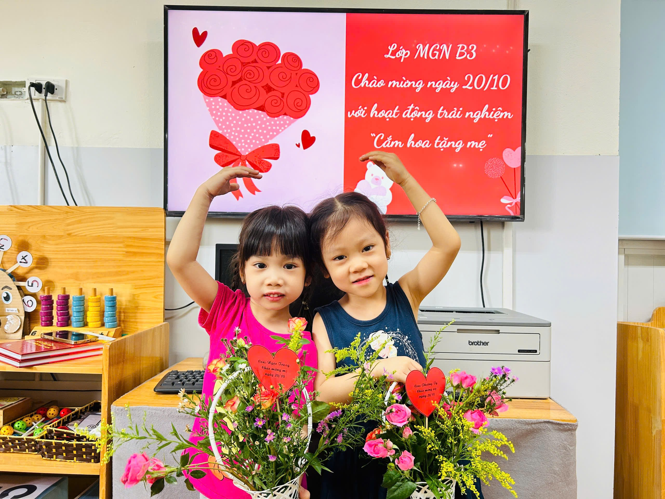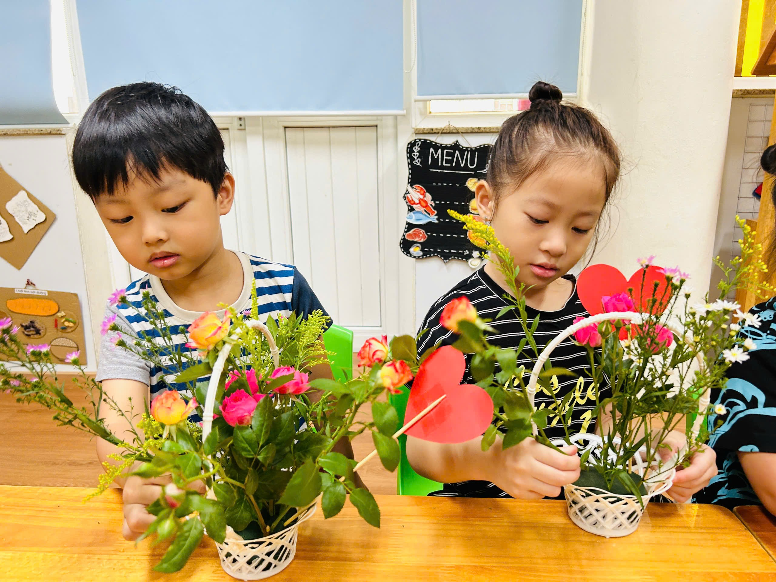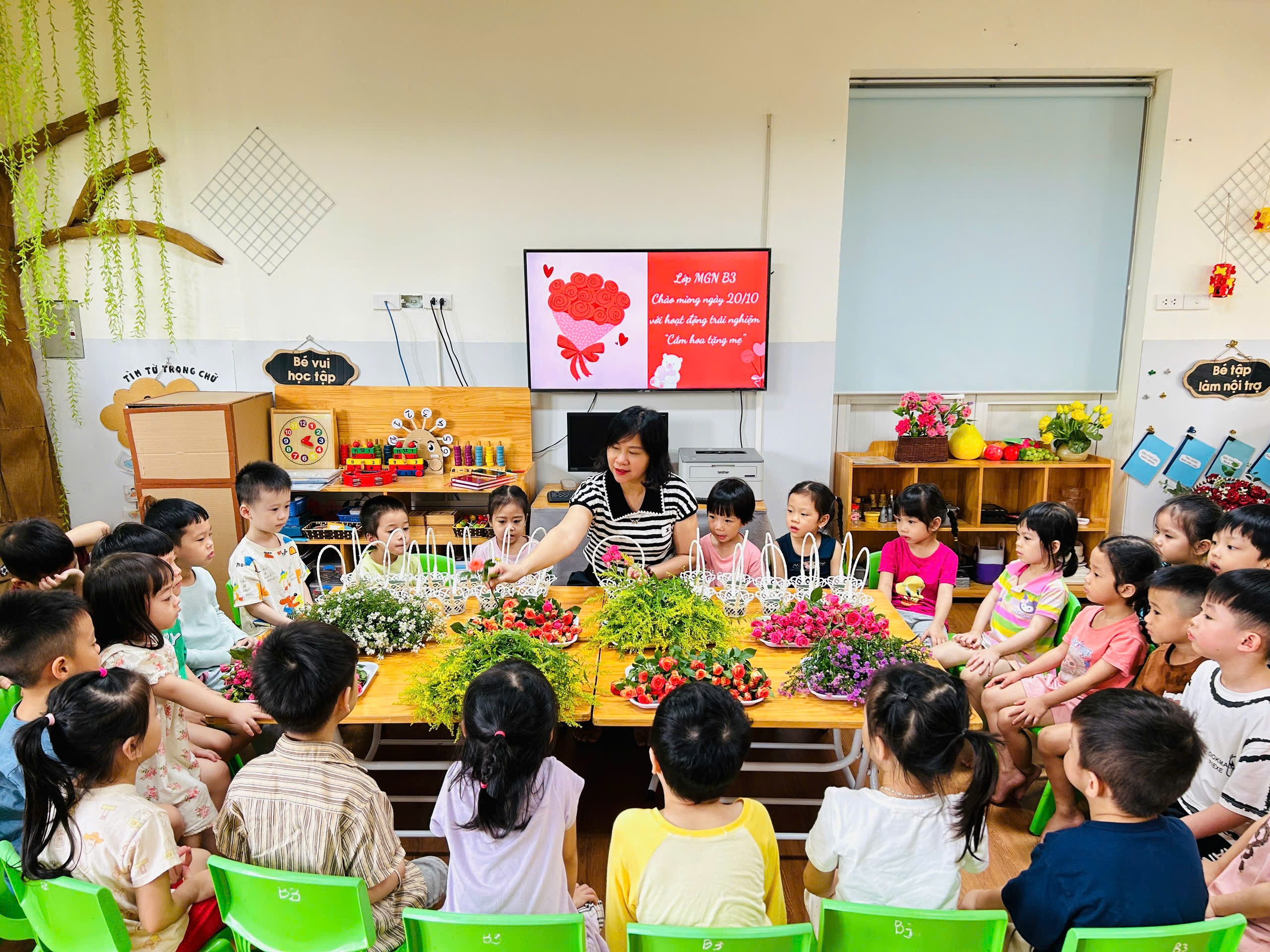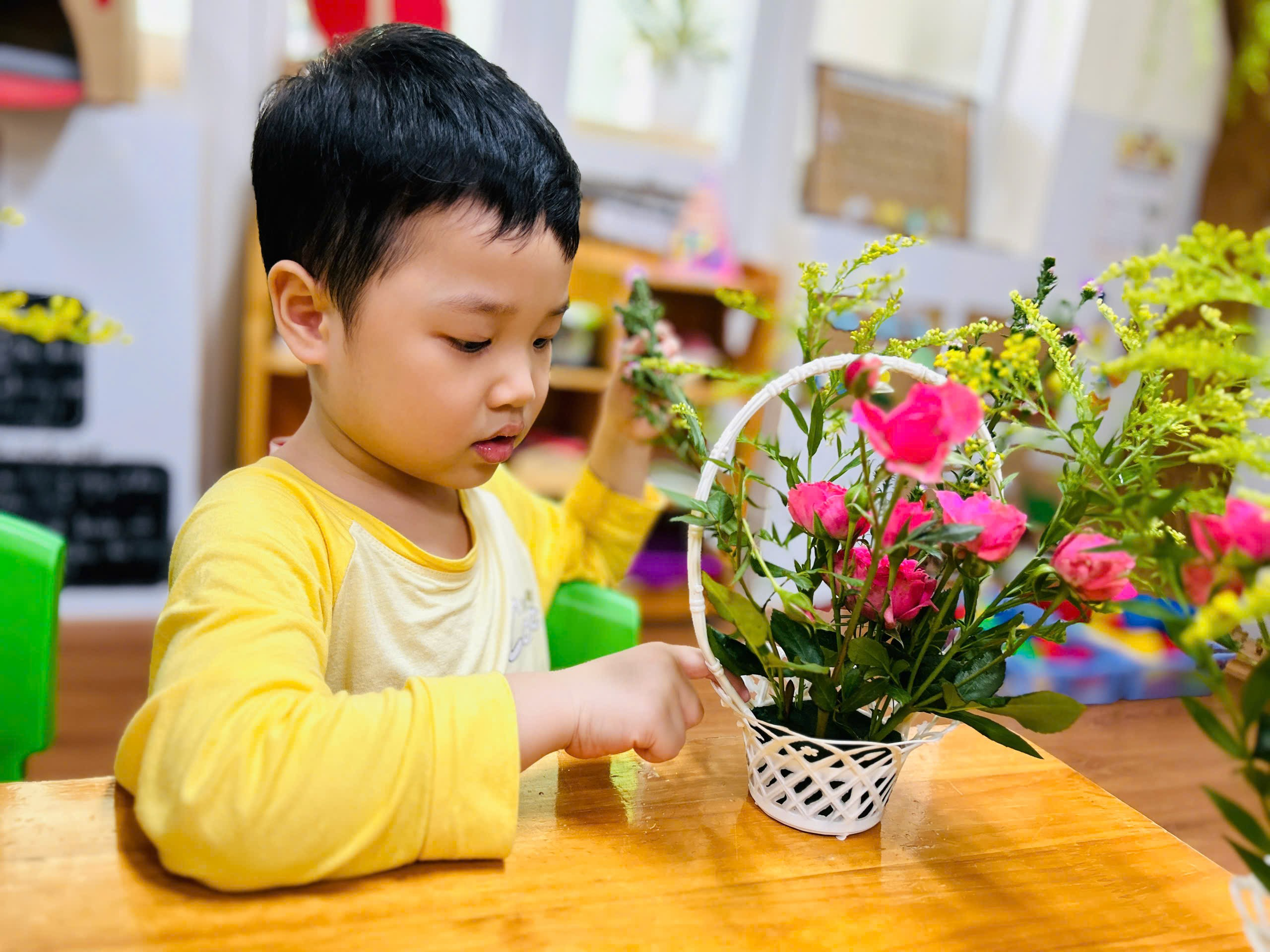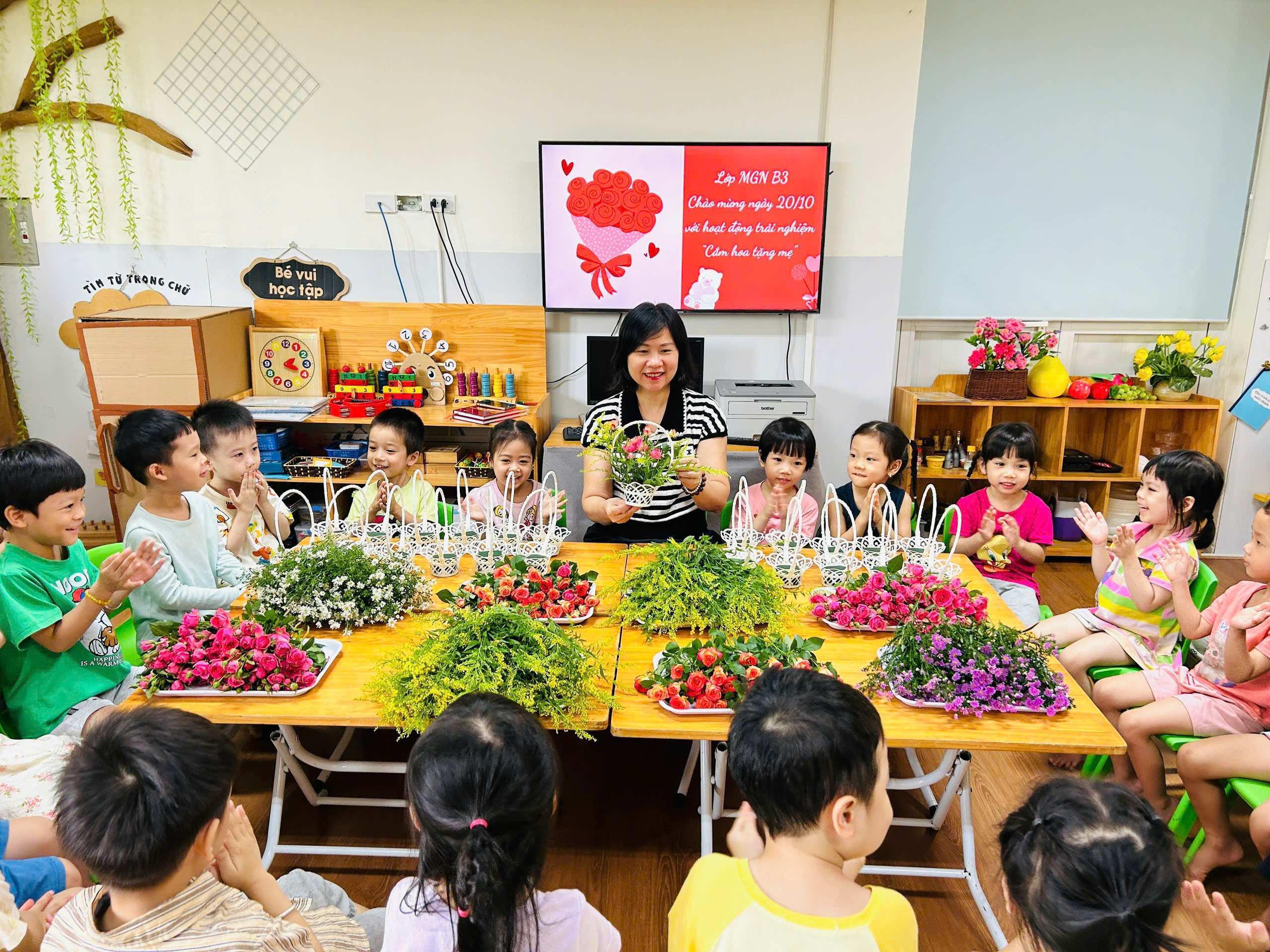 Với những bàn tay nhỏ nhắn và đôi mắt lấp lánh đầy háo hức, các bé được cô giáo hướng dẫn cách tỉa lá, sắp xếp màu sắc hoa sao cho thật hài hòa. Mỗi bông hoa, mỗi nhành lá đều được các bé tỉ mỉ cắm vào giỏ với tất cả tình yêu thương dành cho mẹ, cho bà – những người phụ nữ thân yêu nhất trong gia đình.