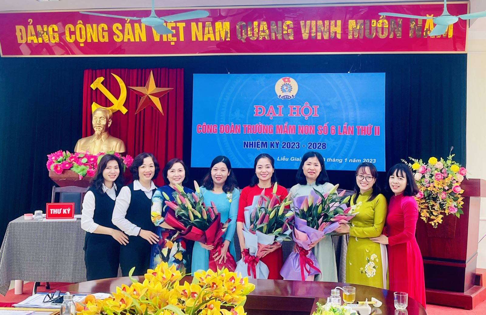 Sau thời gian làm việc khẩn trương, nghiêm túc với tinh thần trách nhiệm, hiệu quả, Đại hội Công đoàn Trường Mầm non Số 6, nhiệm kỳ 2023- 2028 đã thành công tốt đẹp. Đại hội đã bầu 03 đồng chí vào Ban Chấp hành khóa mới và bầu đoàn đại biểu đi dự Đại hội Liên đoàn Lao động quận Ba Đình trong thời gian tới./.