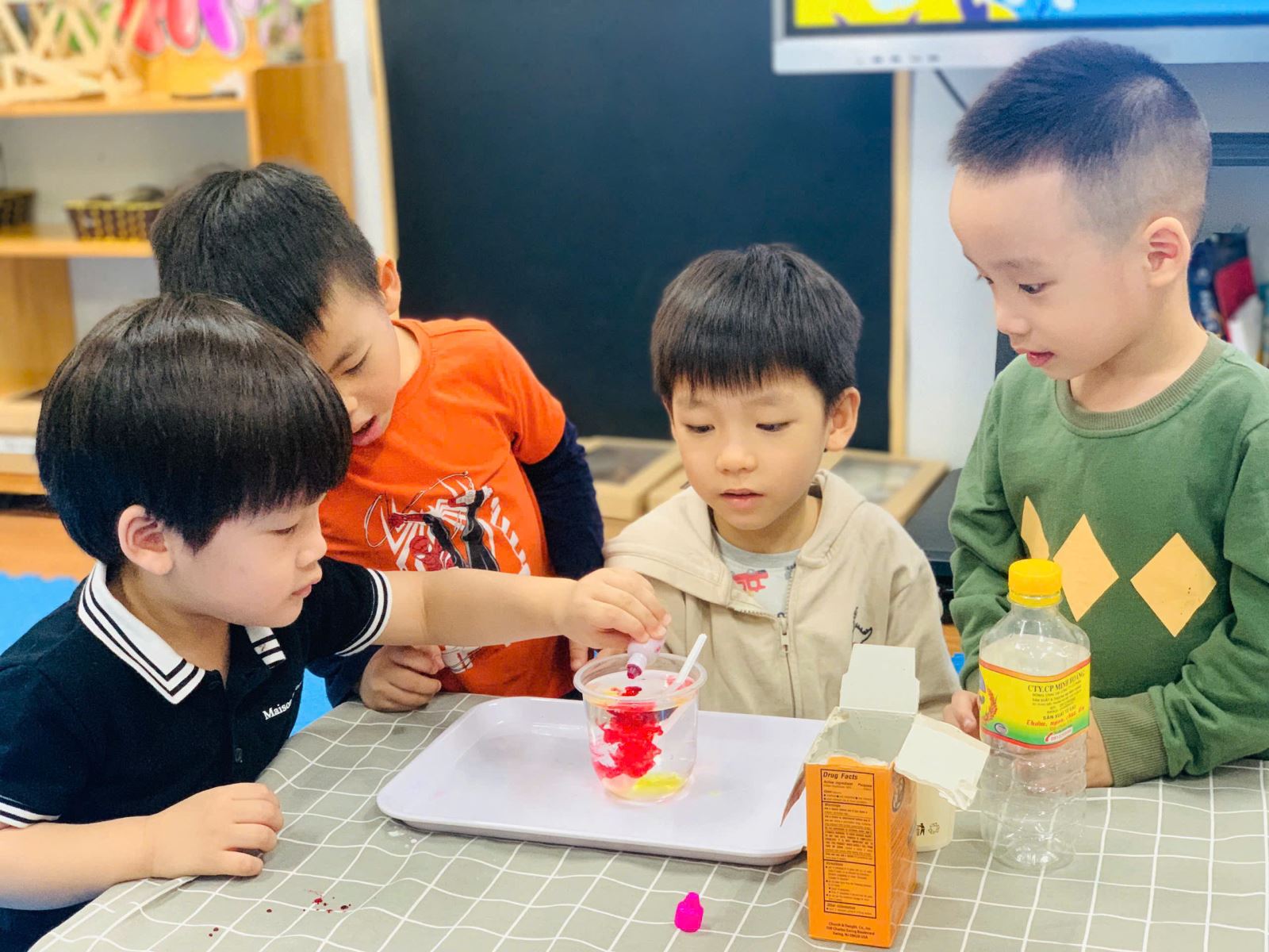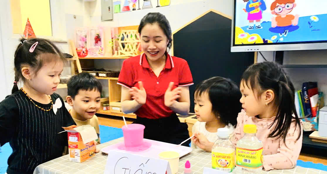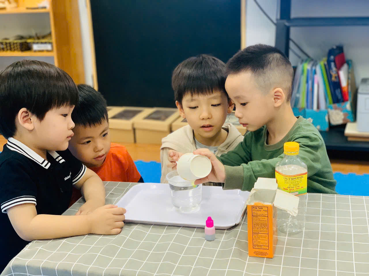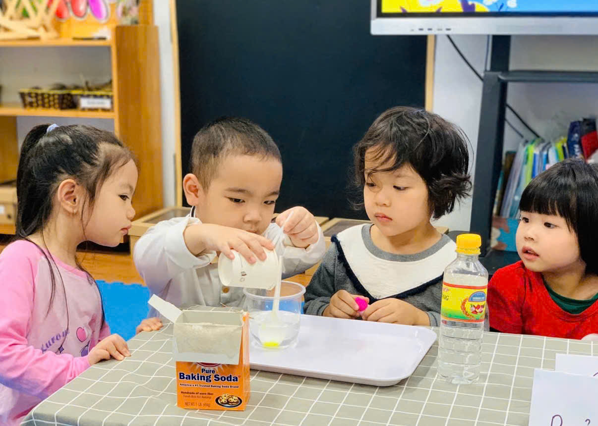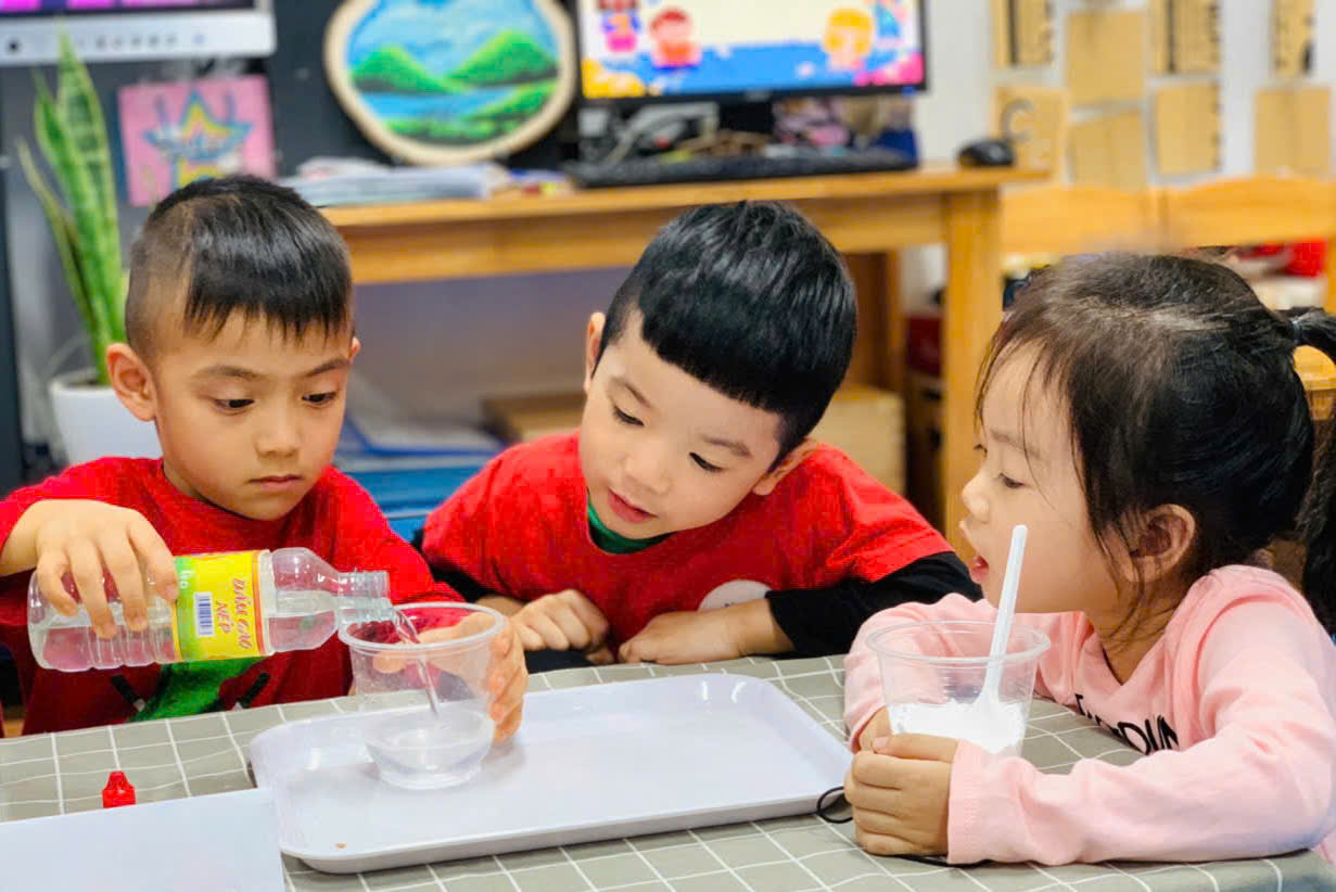 Các bạn nhỏ chăm chú thực hiện các thao tác thí nghiệm