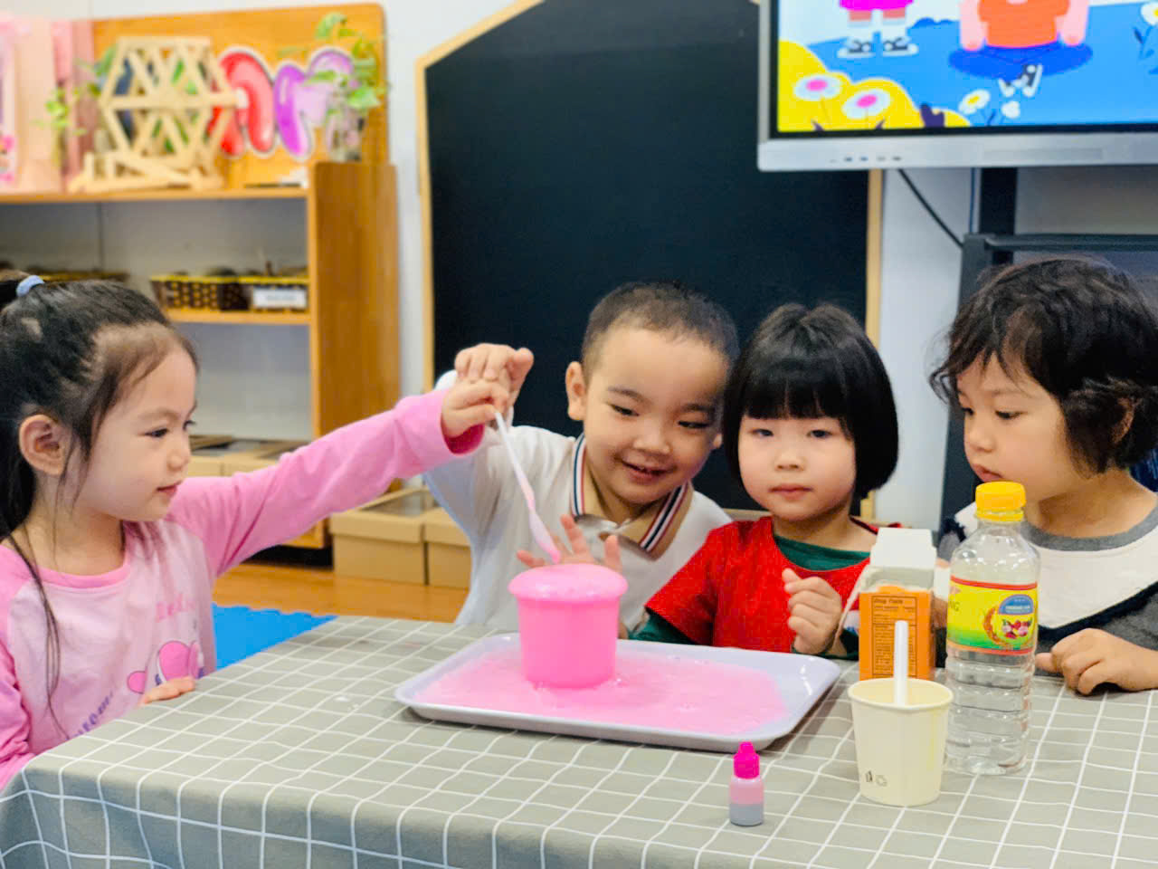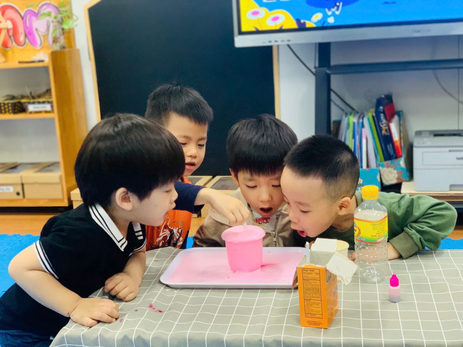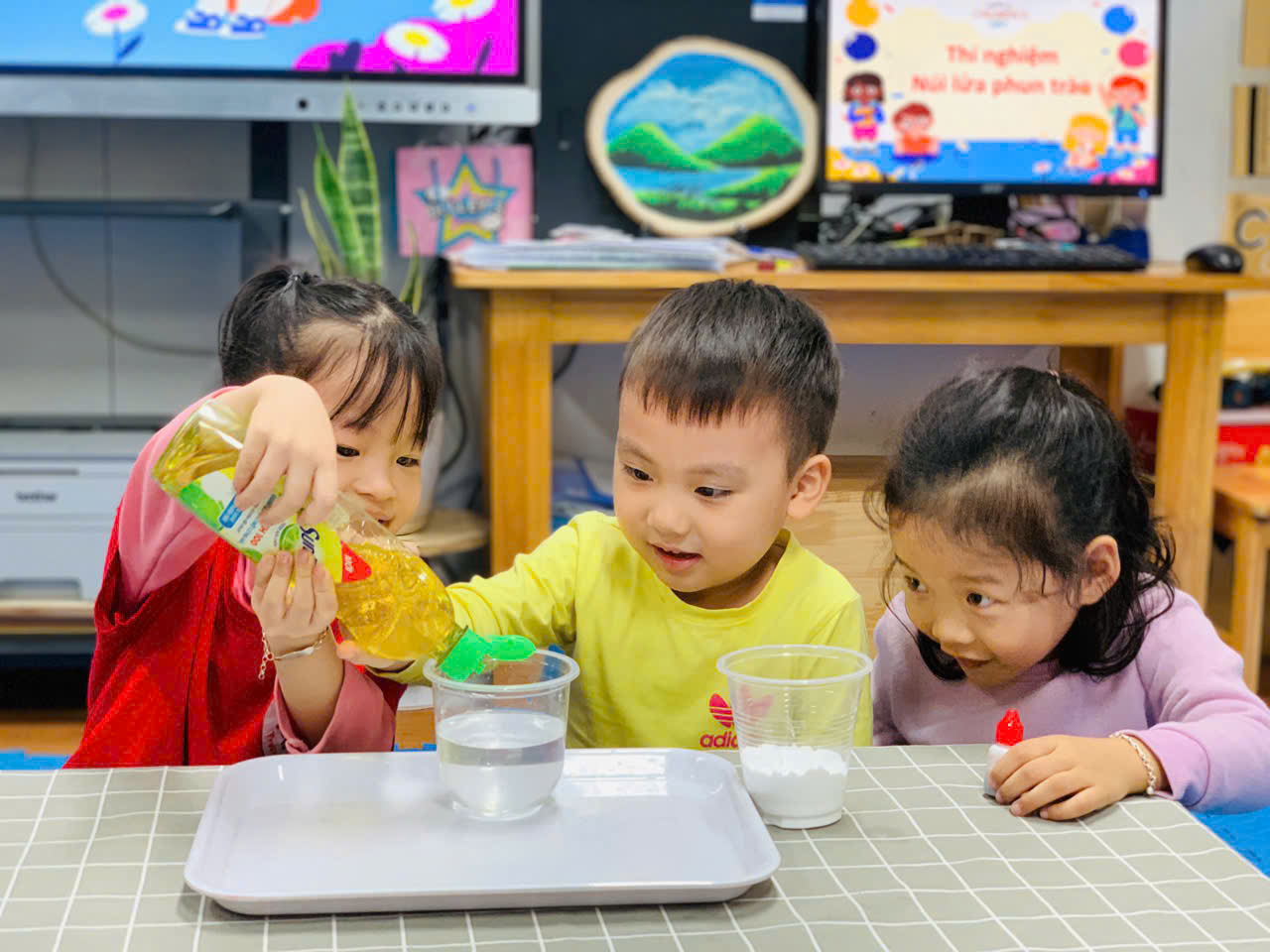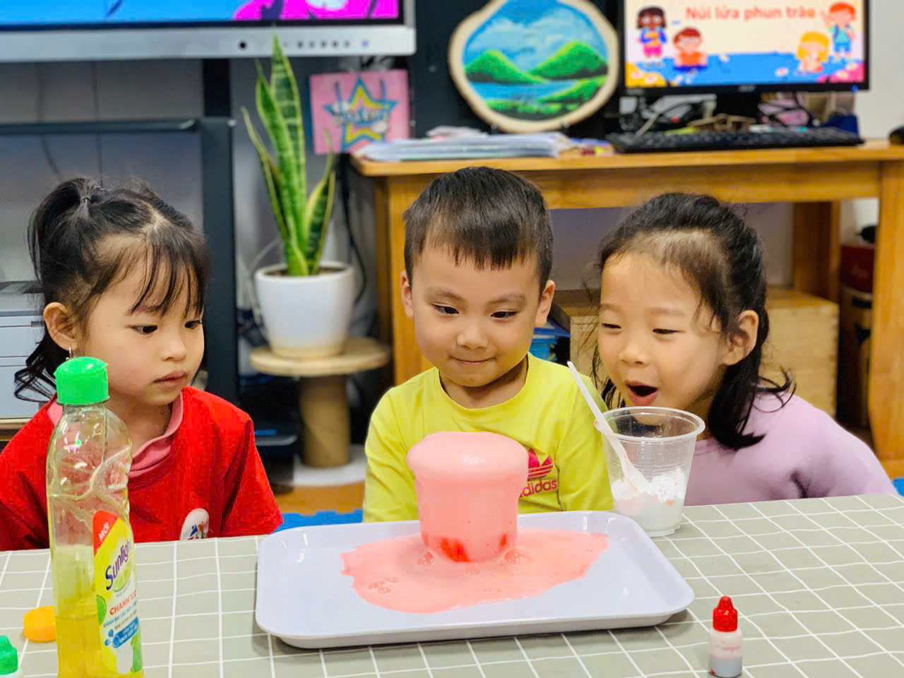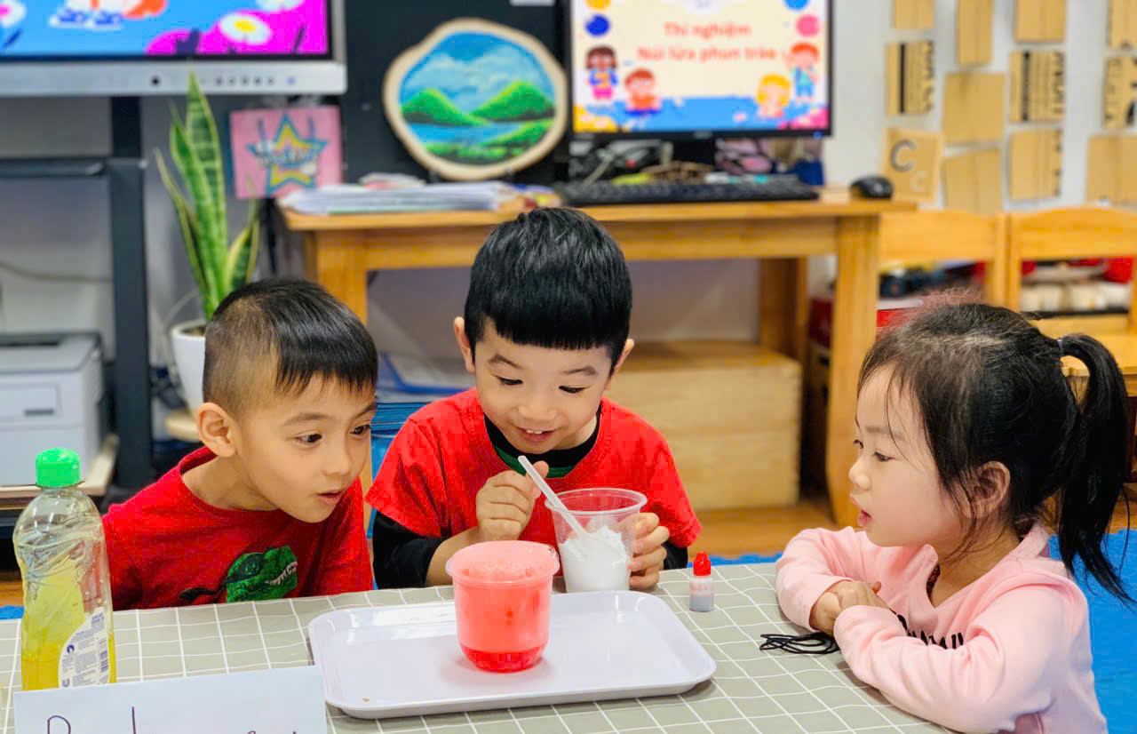 Các bé lớp B2 thực hành thí nghiệm "Núi lửa phun trào"