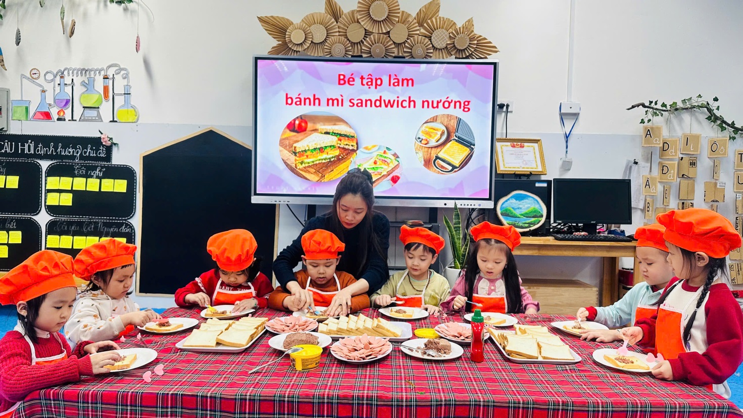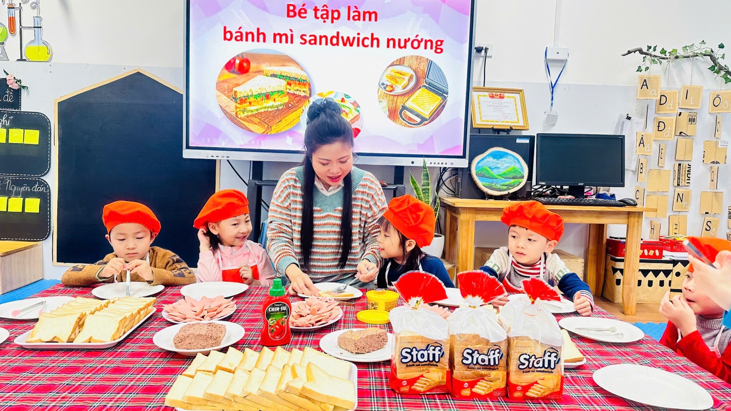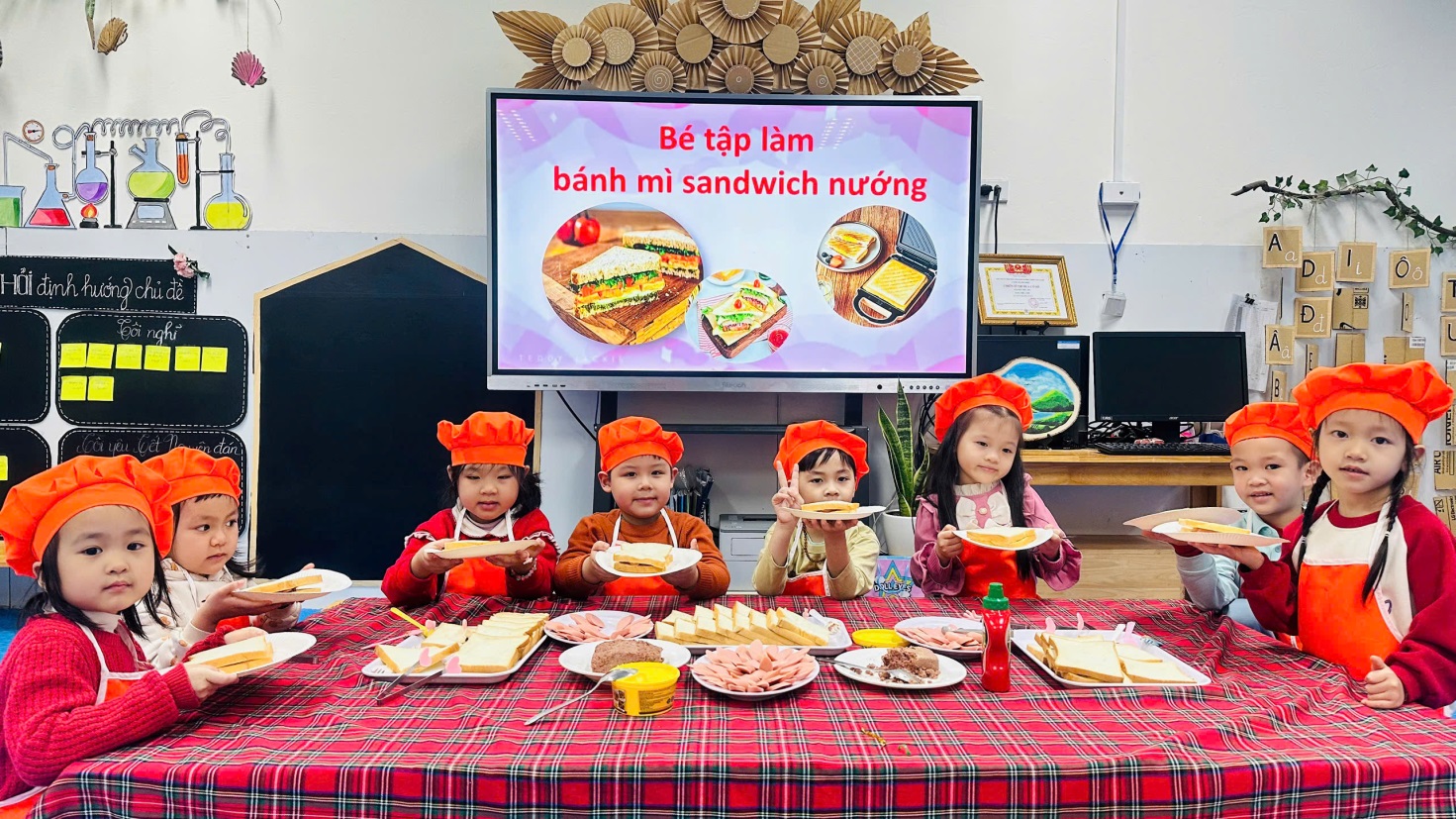 Theo đánh giá của các nhà dinh dưỡng học, bữa sáng là bữa ăn quan trọng nhất trong ngày. Nó sẽ giúp chúng ta bù đắp lại phần năng lượng đã tiêu hao sau một đêm cũng như nạp thêm đủ năng lượng để bắt đầu những hoạt động trong ngày mới. Chính vì vậy, việc chế biến bữa ăn sáng đầy đủ dinh dưỡng và năng lượng cần thiết là điều mà chúng ta phải thật sự lưu tâm. Hôm nay, các bé lớp mẫu giáo nhỡ B2 được các cô giáo hướng dẫn cách làm bánh mì sandwich nướng- một món ăn sáng ngon, đầy đủ dinh dưỡng cho bé và bố mẹ cùng thưởng thức.