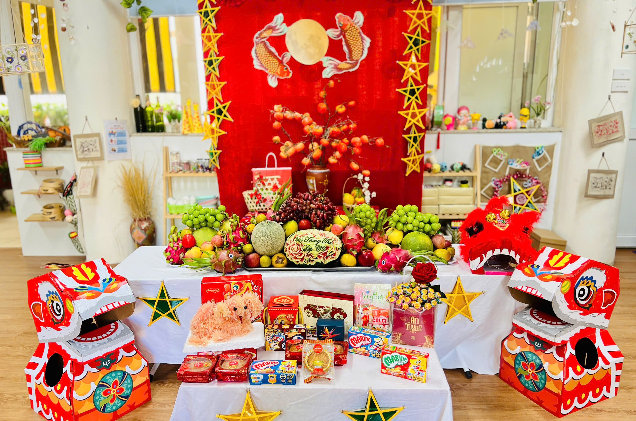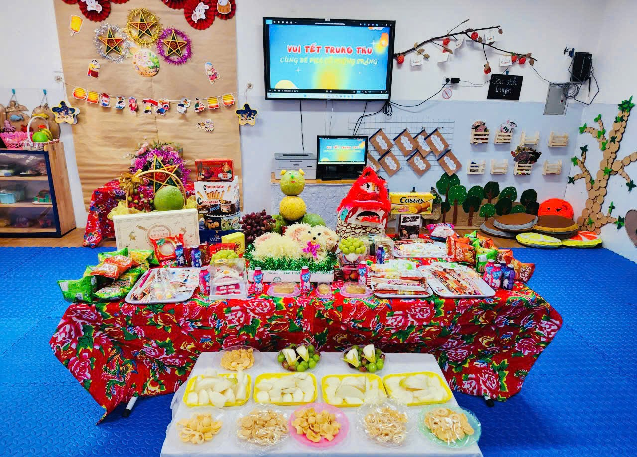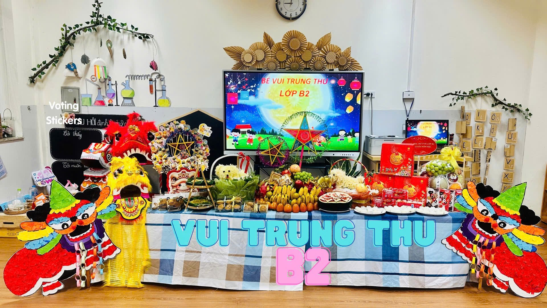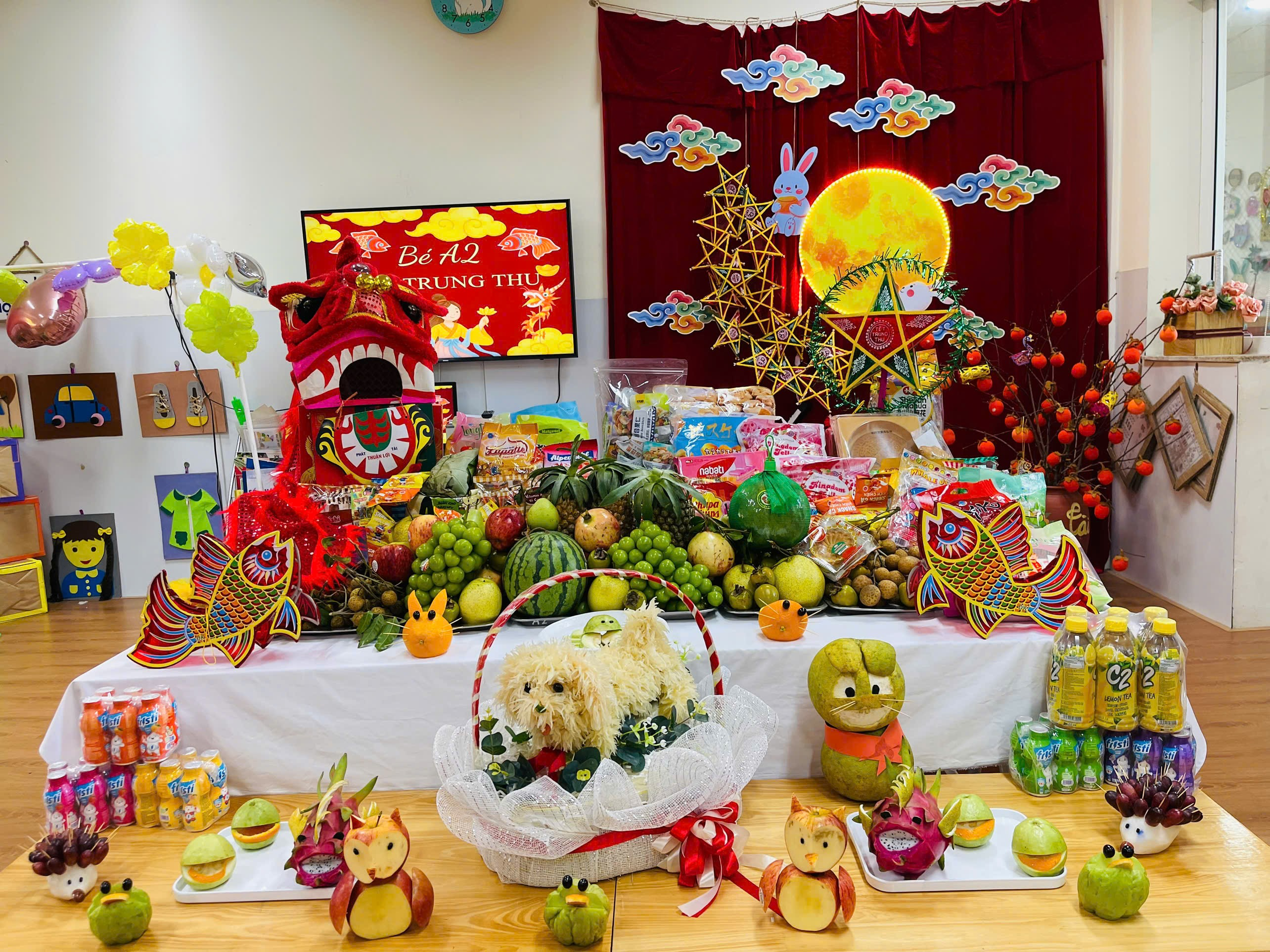 Ngay từ sáng sớm, các lớp học trong trường đã rực rỡ với những mâm ngũ quả, đèn ông sao, đèn lồng, mâm cỗ Trung thu được các cô giáo và phụ huynh chuẩn bị công phu, đẹp mắt. Mỗi lớp mang đến một sắc màu riêng, vừa truyền thống vừa sáng tạo, tạo nên không gian lễ hội ấm áp, gần gũi.