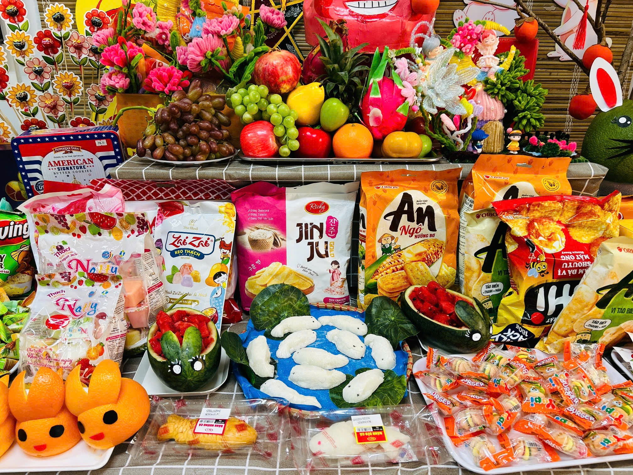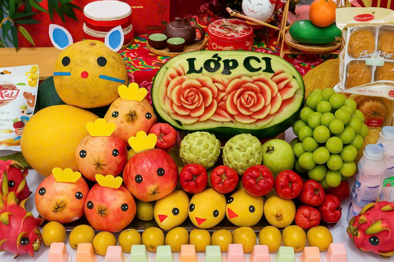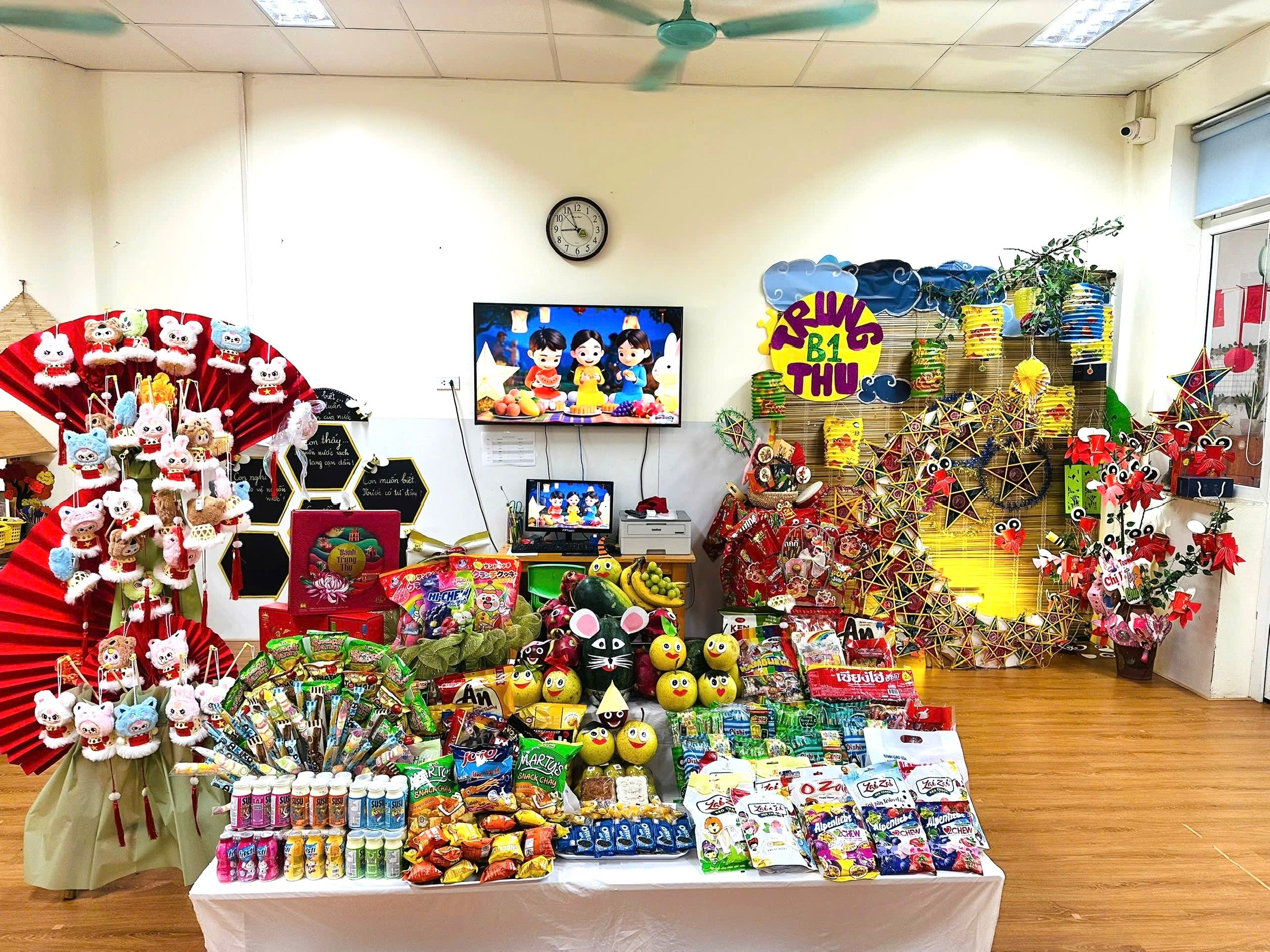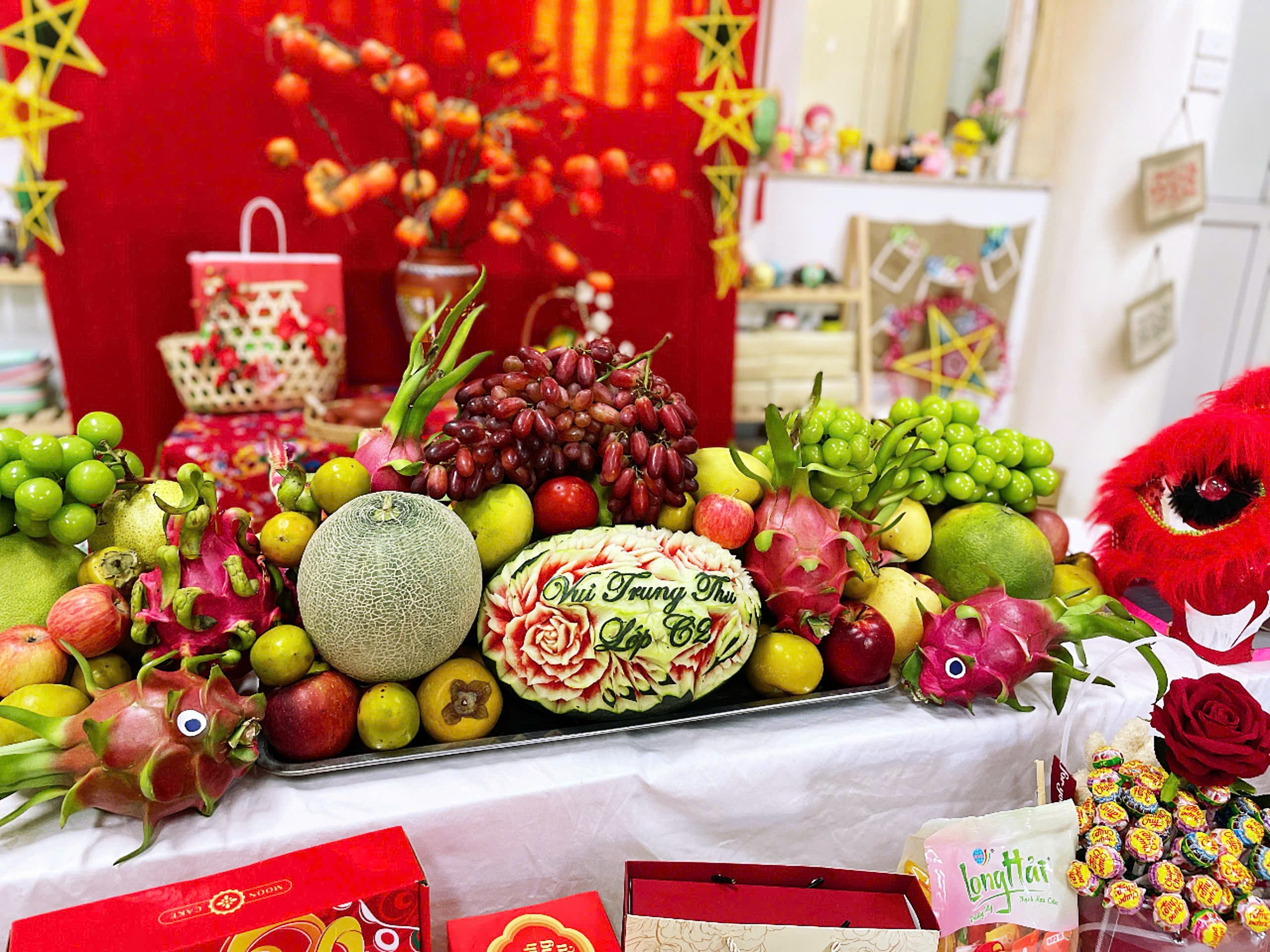 Ngay từ sáng sớm, các lớp học trong trường đã rực rỡ với những mâm ngũ quả, đèn ông sao, đèn lồng, mâm cỗ Trung thu được các cô giáo và phụ huynh chuẩn bị công phu, đẹp mắt. Mỗi lớp mang đến một sắc màu riêng, vừa truyền thống vừa sáng tạo, tạo nên không gian lễ hội ấm áp, gần gũi.