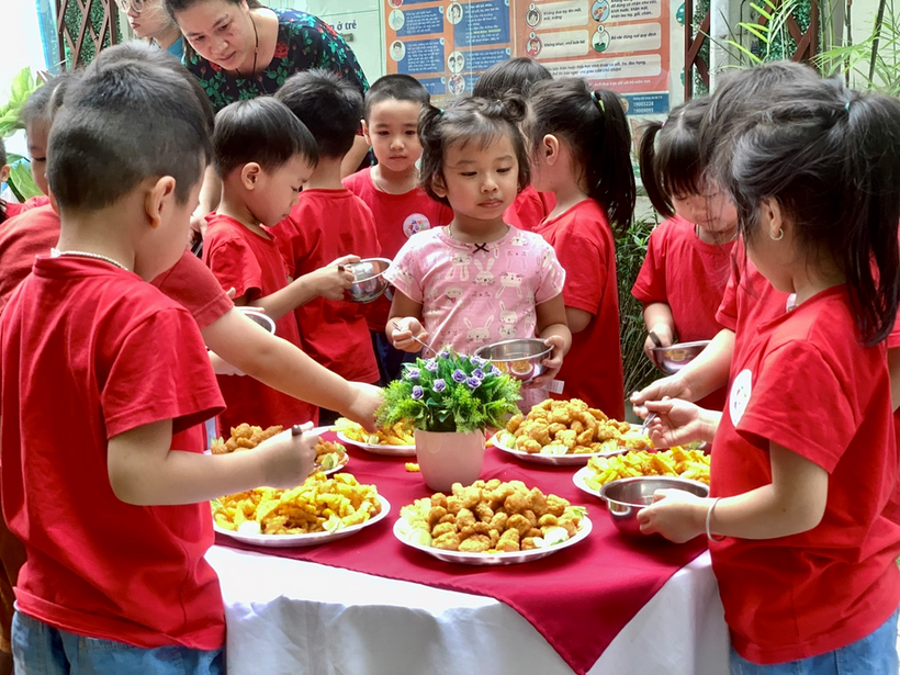 Các bé trao đổi thức ăn mình vừa chọn được.