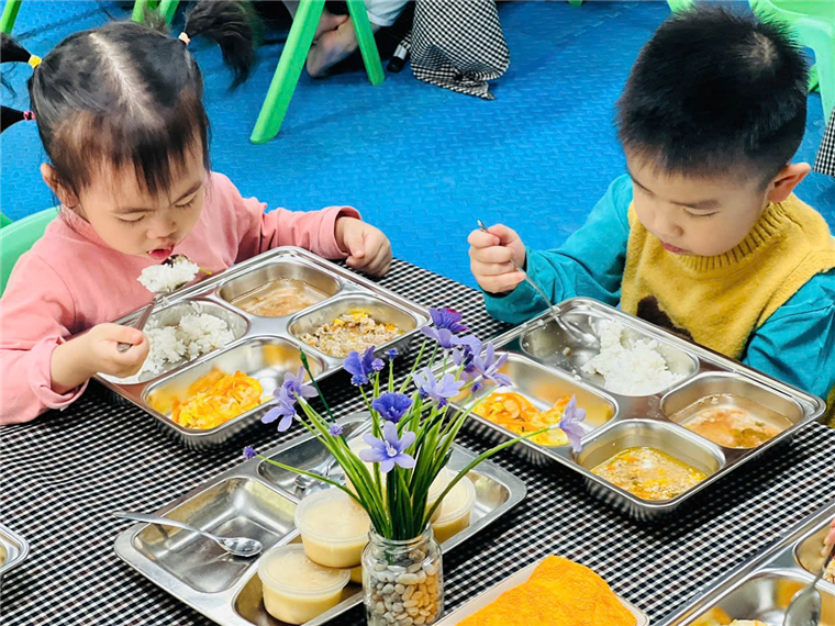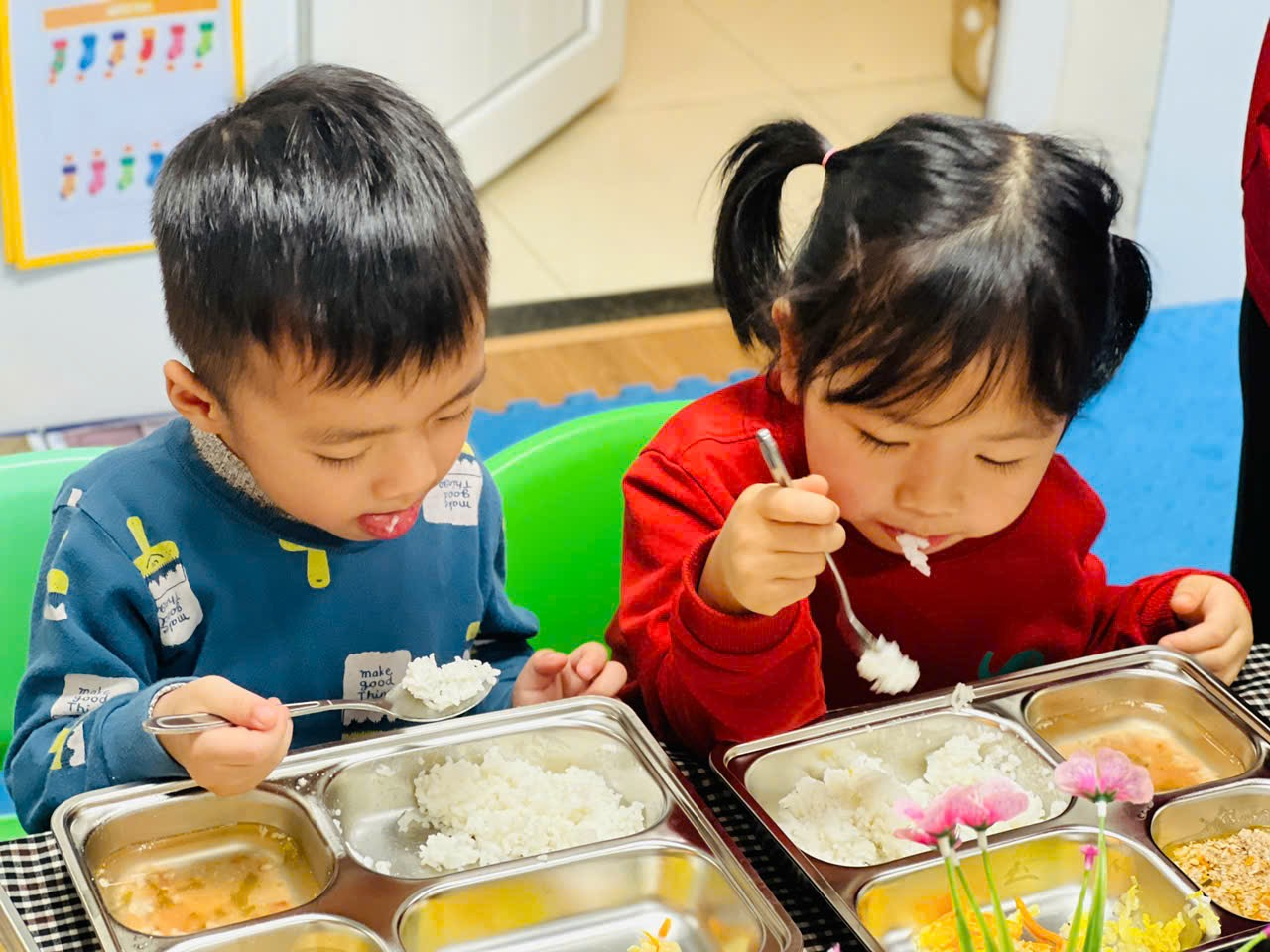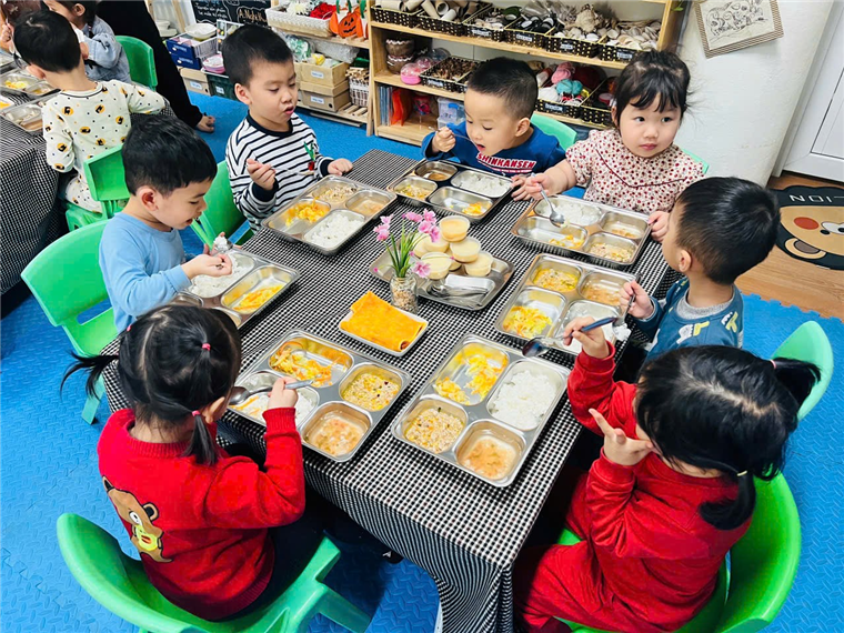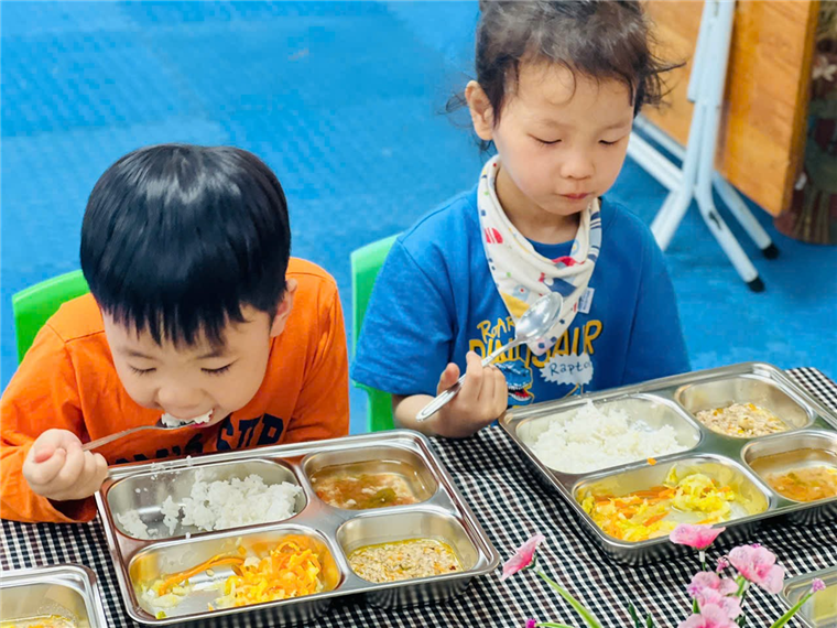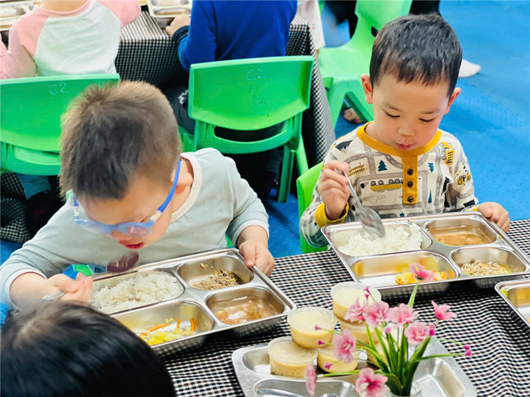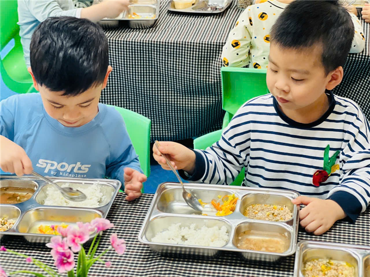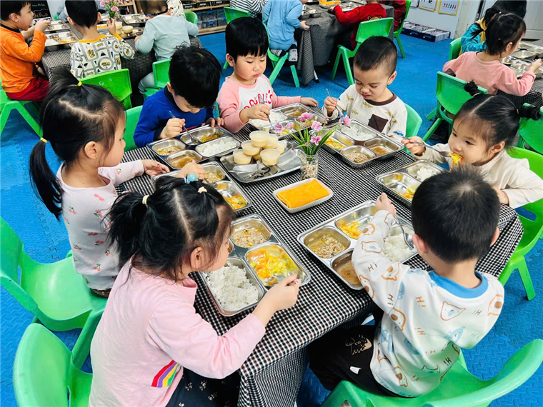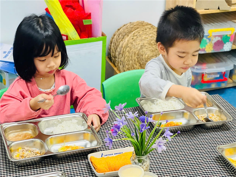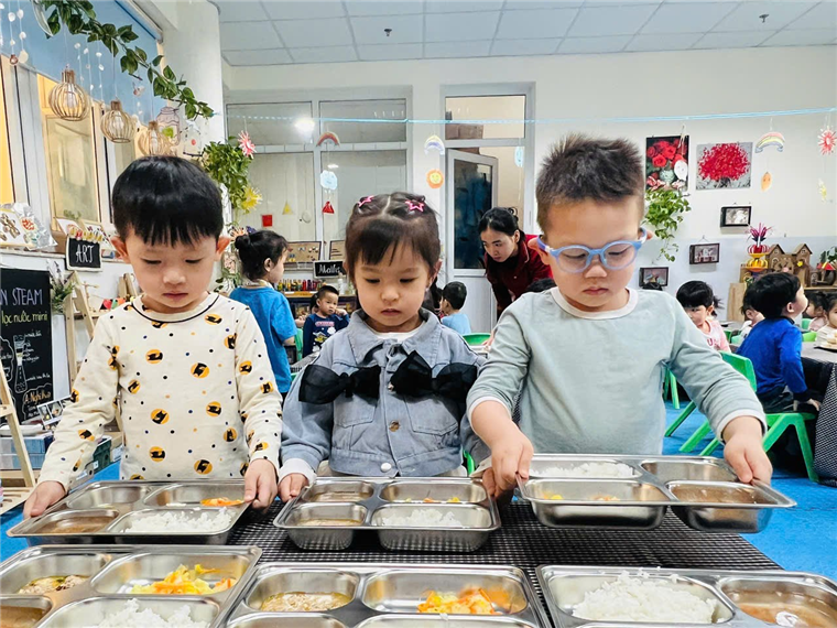 Các bạn nhỏ ngồi ăn theo bàn, không chen lấn, không tranh giành.
