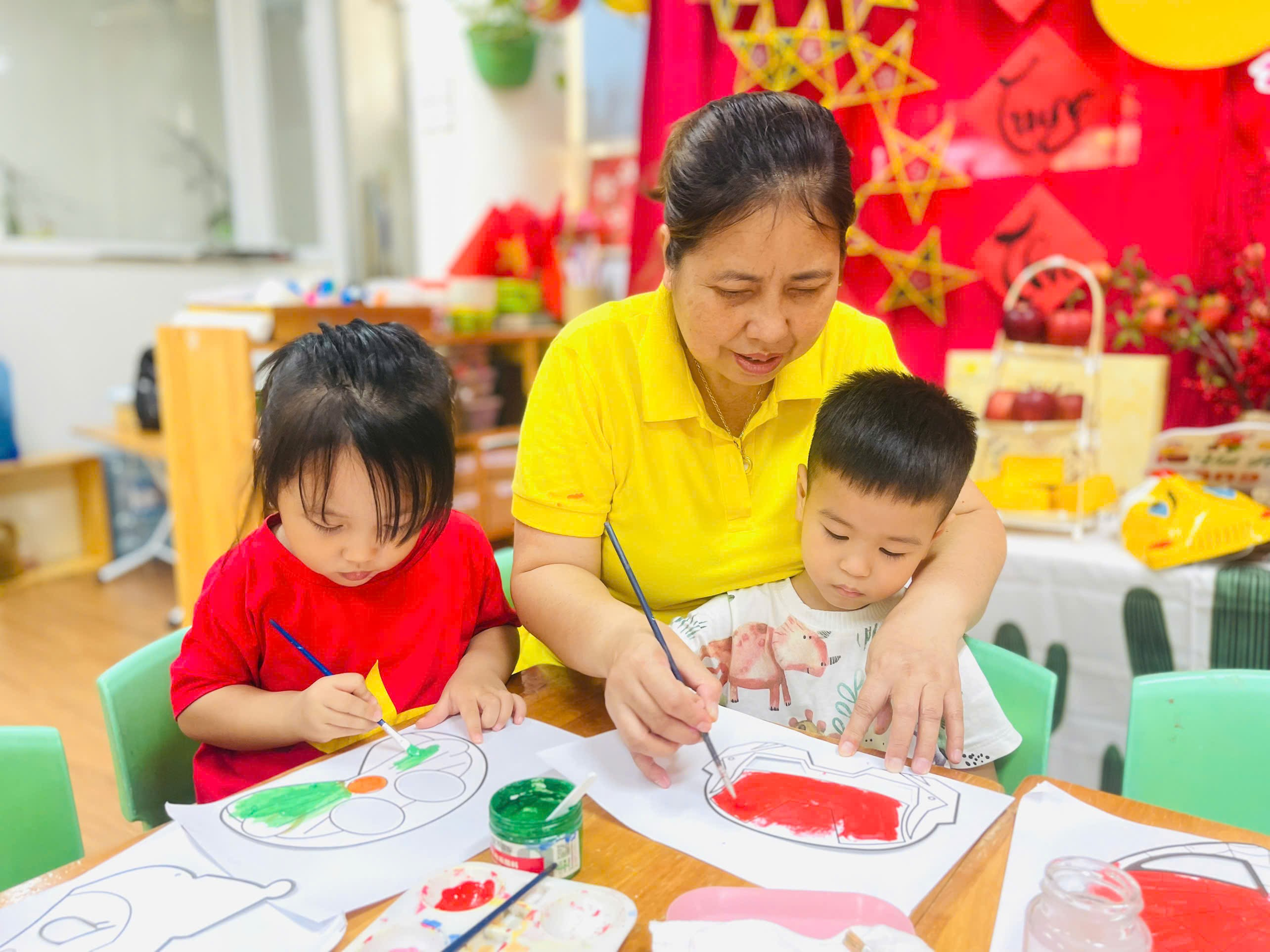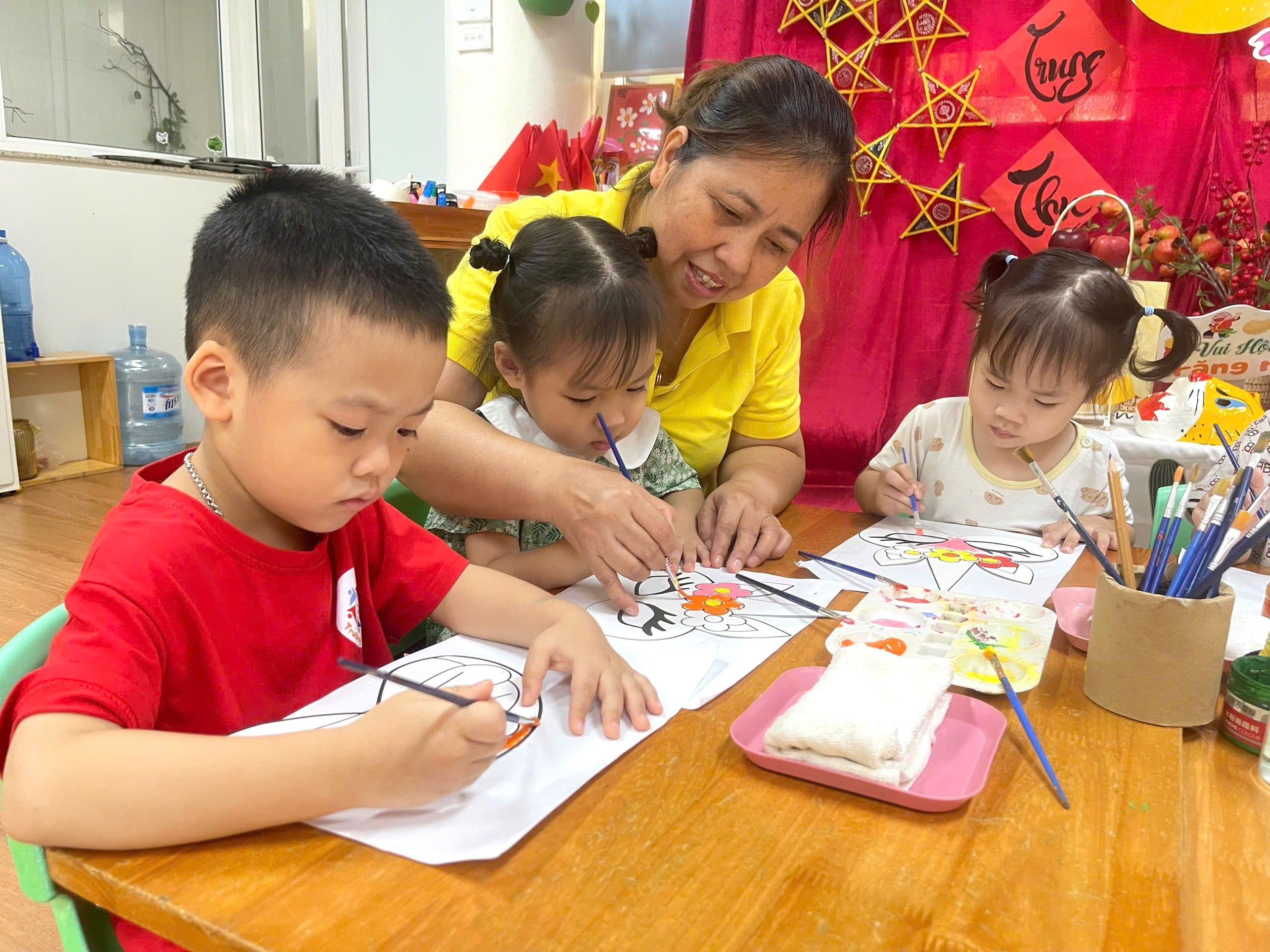 Cô giáo cầm tay hướng dẫn trẻ tô màu