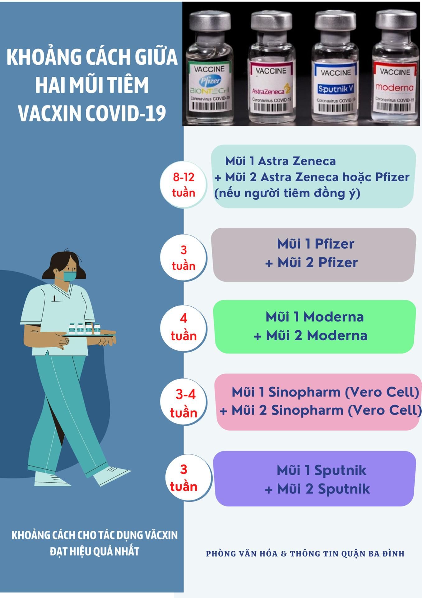 Theo Bộ Y tế và khuyến cáo của nhà sản xuất, khoảng cách giữa 2 mũi tiêm của các loại vaccine là khác nhau để đạt hiệu quả cao nhất. Cụ thể: Vaccine AstraZeneca: từ 8 - 12 tuần; vaccine Sputnik V: 3 tuần; vaccine Pfizer: 3 tuần; vaccine của Sinopharm: 3 - 4 tuần và vaccine Moderna là 28 ngày.