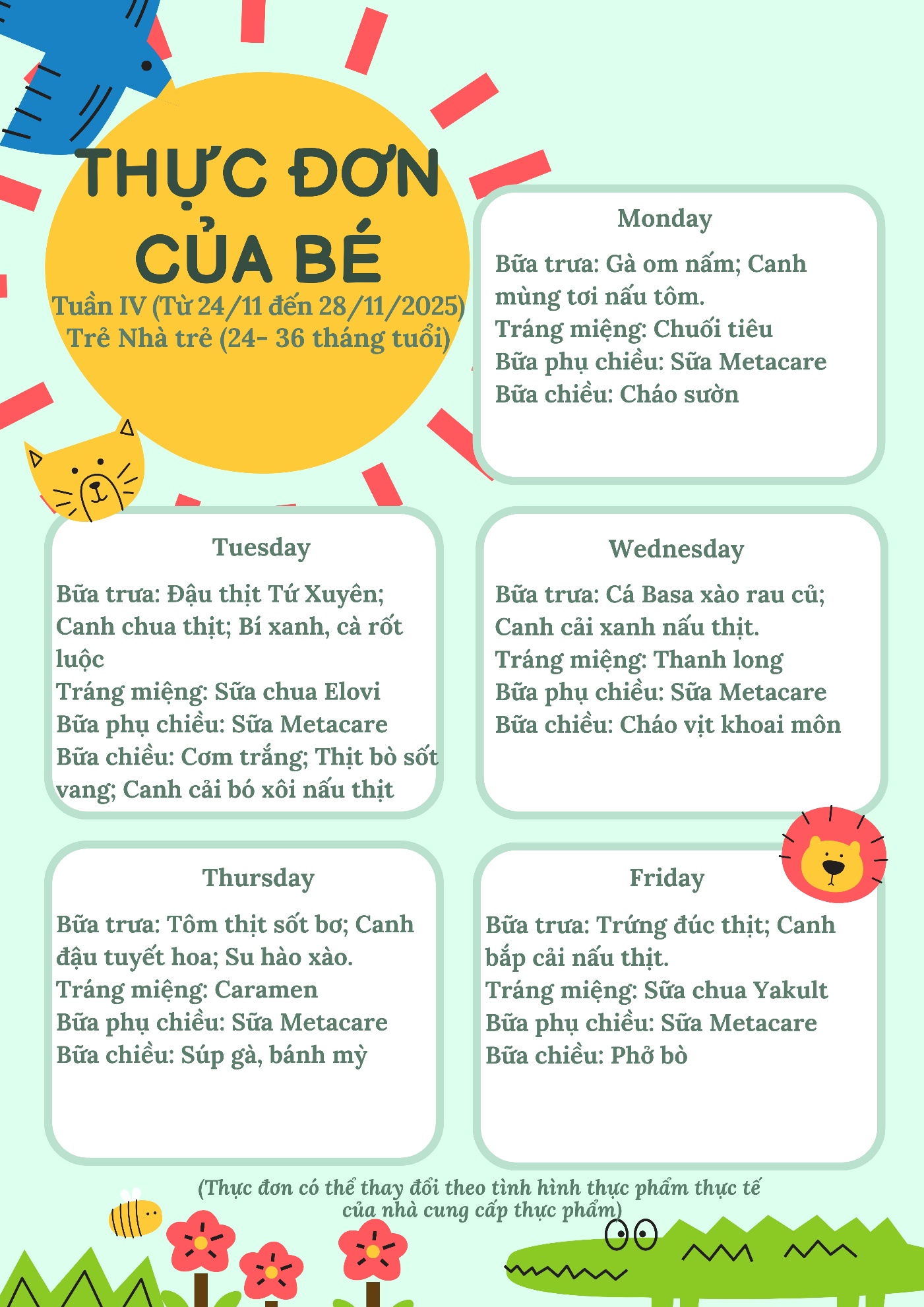 Thực đơn tuần IV tháng 11/2025 của trẻ Nhà trẻ (trẻ 24-36 tháng tuổi)