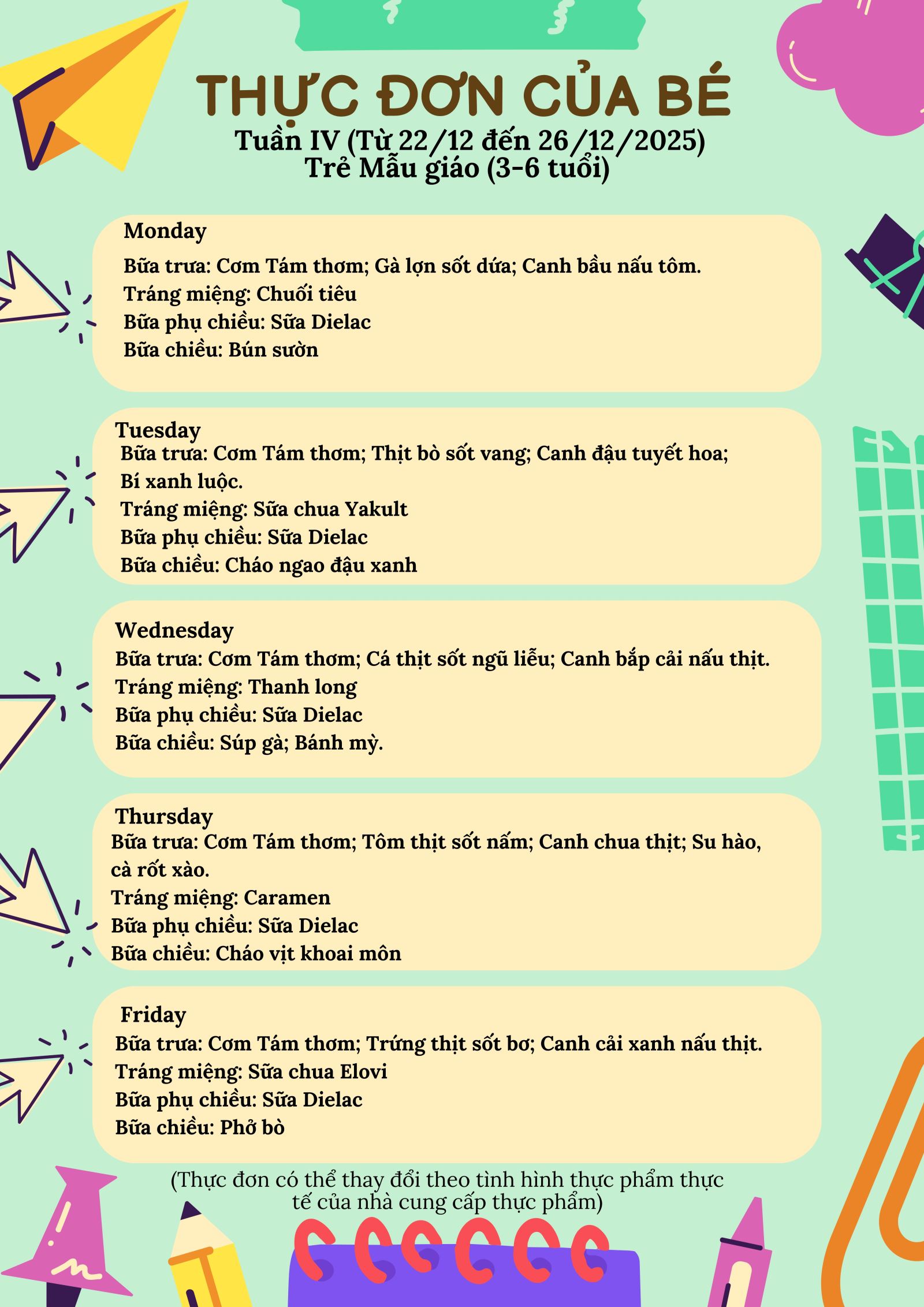 Thực đơn tuần IV tháng 12/2025 của trẻ Mẫu giáo (trẻ 3-6 tuổi)