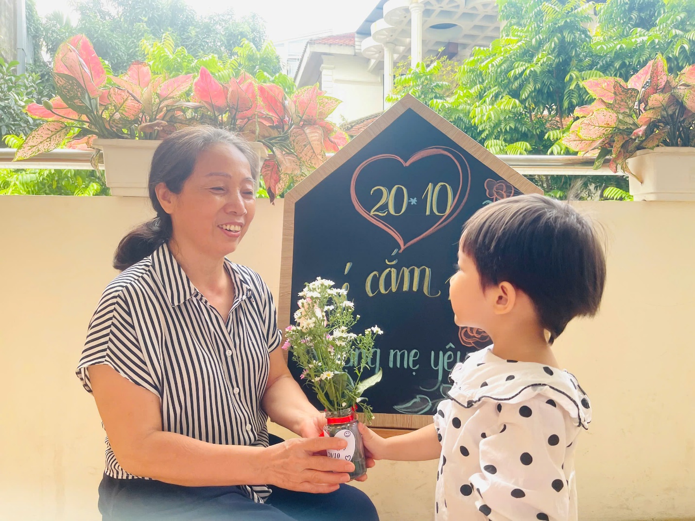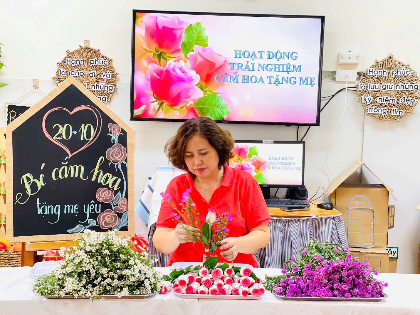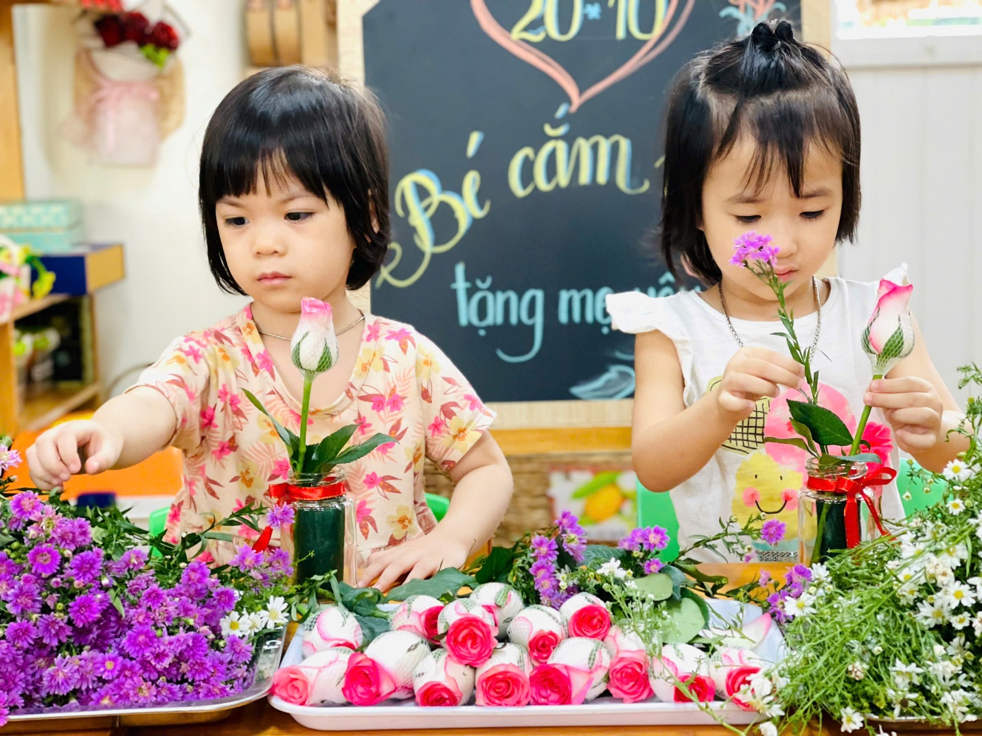 Để giúp các con có buổi trải nghiệm thật ý nghĩa, cô giáo đã chuẩn bị rất nhiều các nguyên vật liệu khác nhau như: Hoa hồng, hoa thạch thảo, xốp, lọ hoa, dây ruy băng,… Với đôi bàn tay nhỏ bé nhưng các con đã khéo léo, cùng với cô giáo và các bạn cắm những bông hoa tươi thắm tạo thành lọ hoa rực rỡ sắc màu để tặng bà tặng mẹ. Thông qua buổi trải nghiệm giúp các con biết được ý nghĩa của ngày 20/10 mà qua đó còn bồi dưỡng cảm xúc và tình cảm xã hội cho các con giúp các con biết thể hiện sự quan tâm, yêu quý, kính trọng của trẻ với bà và mẹ nhân ngày 20/10.