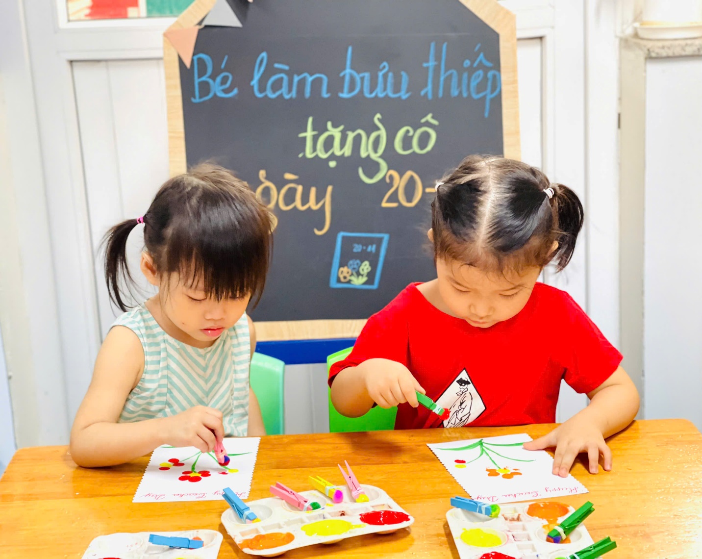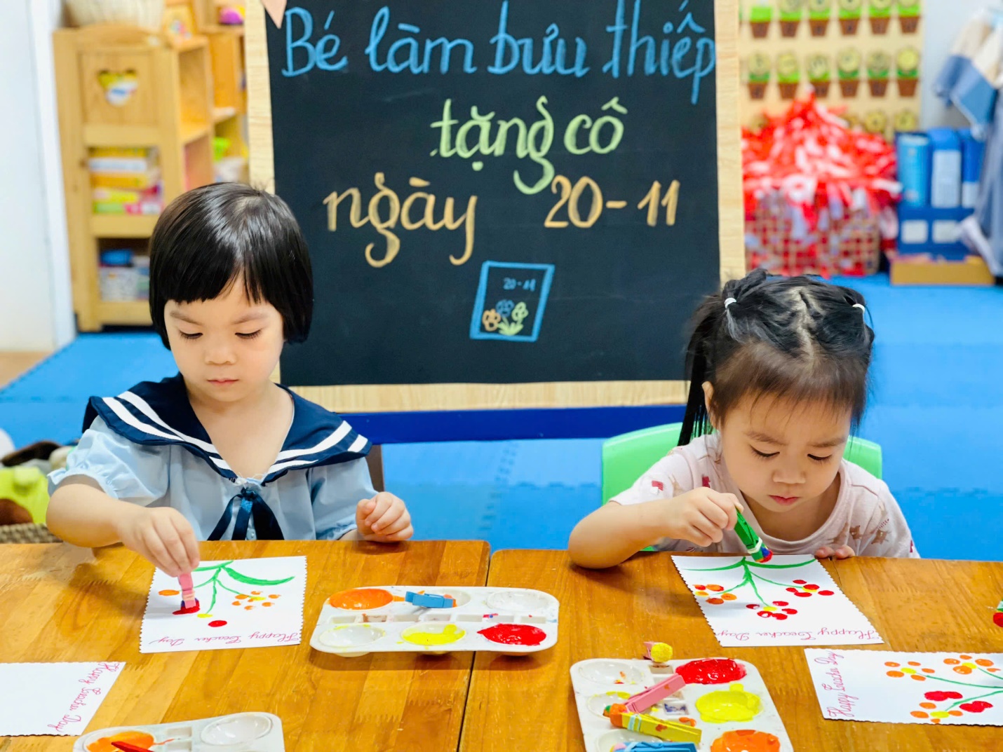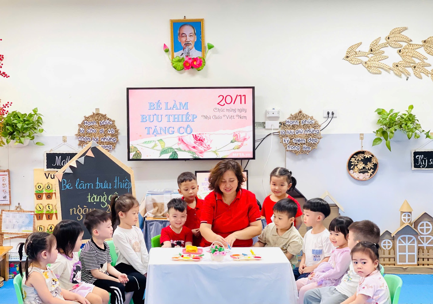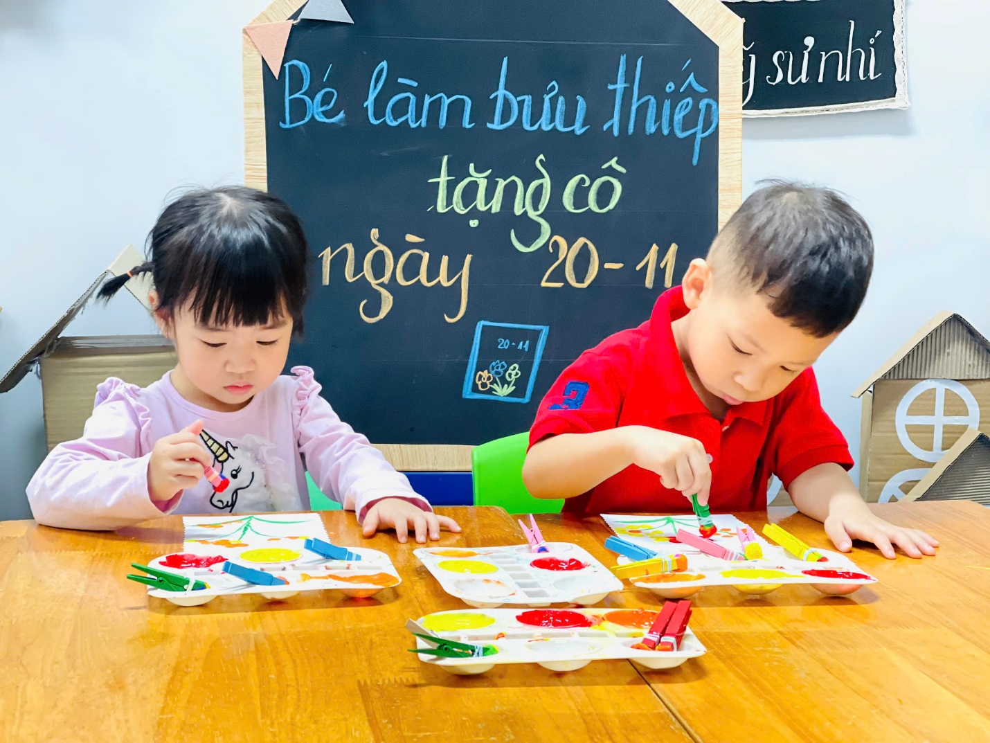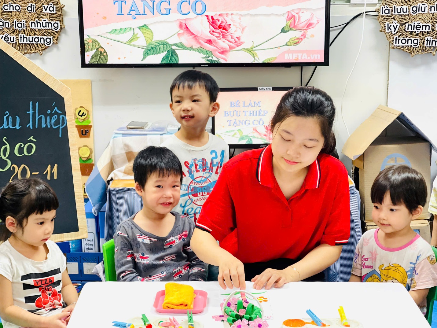 Hôm nay các bạn nhỏ lớp C3 đã làm tấm bưu thiếp thật đẹp để tặng các cô nhân ngày 20 – 11. Các con rất vui, thích thú, hào hứng tham gia. Qua đây cũng giúp các con biết cách bày tỏ tình cảm, bày tỏ lòng biết ơn của mình đối với cô giáo.
