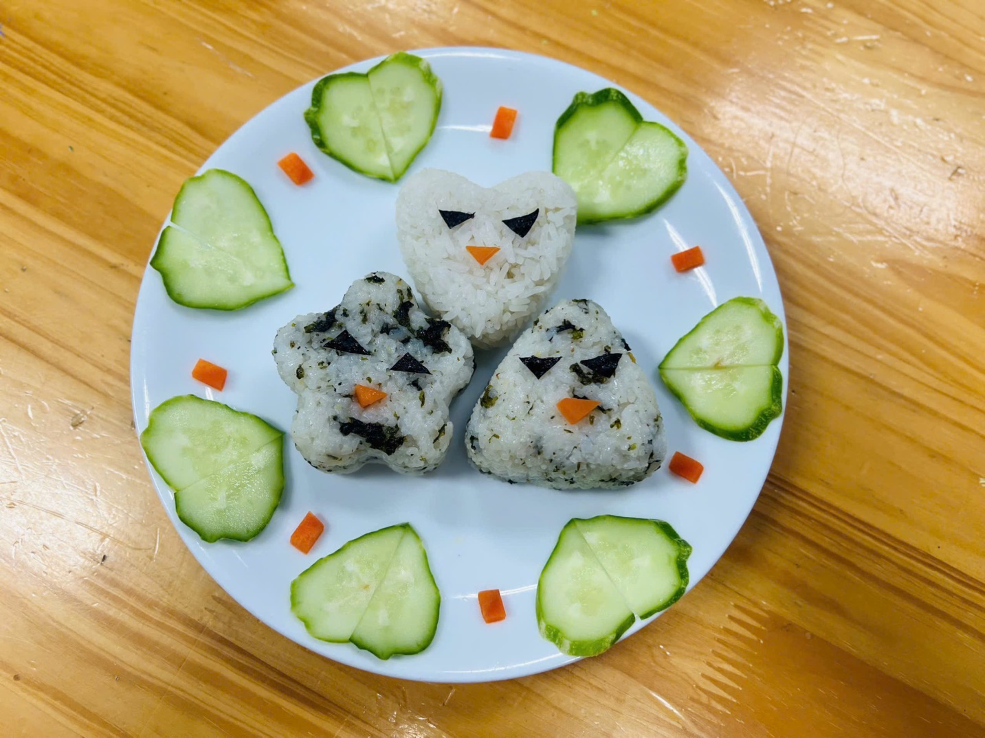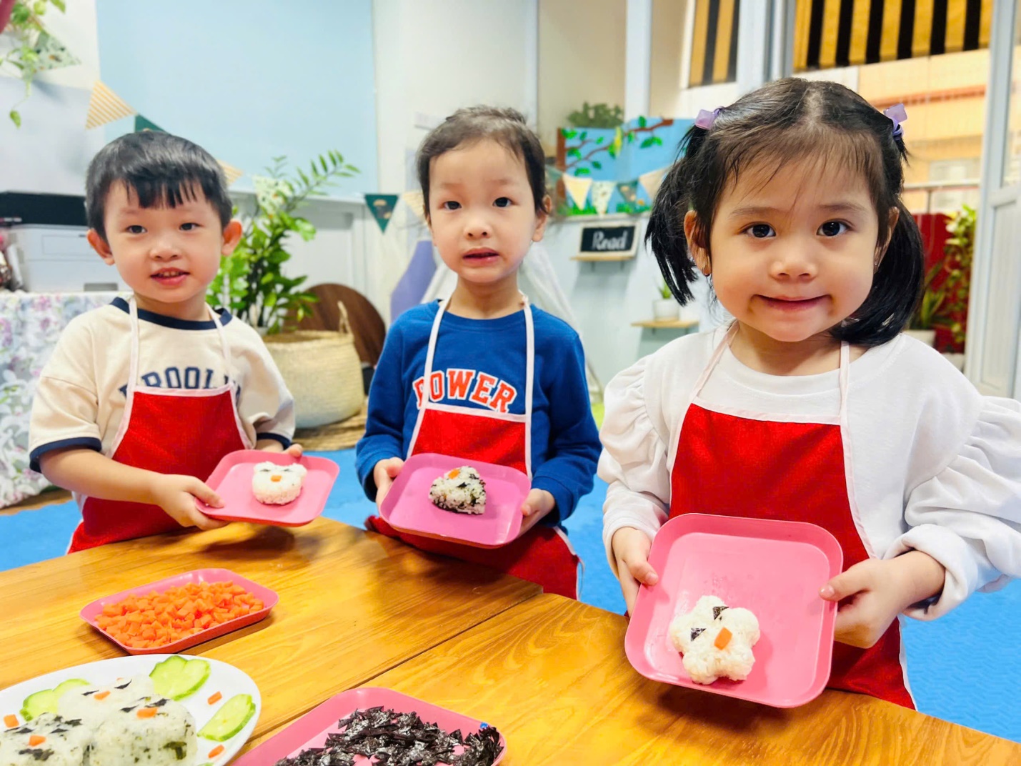 Từ những nguyên liệu quen thuộc như cơm trắng, rau củ quả sắc màu, các bé đã tạo ra hộp cơm Bento đẹp mắt với những hình ảnh dễ thương, bạn nào cũng rất hào hứng và thích thú với thành quả của mình.