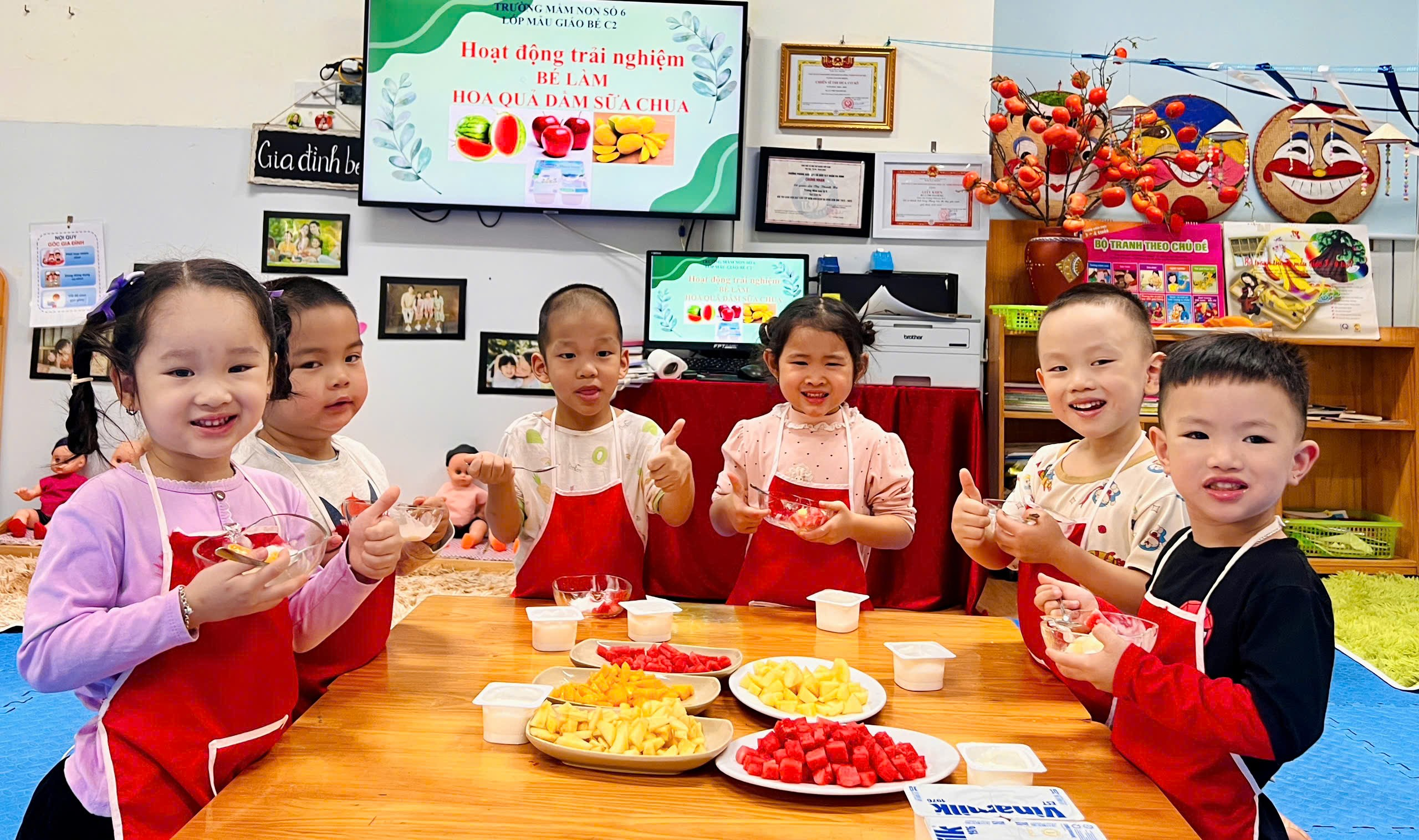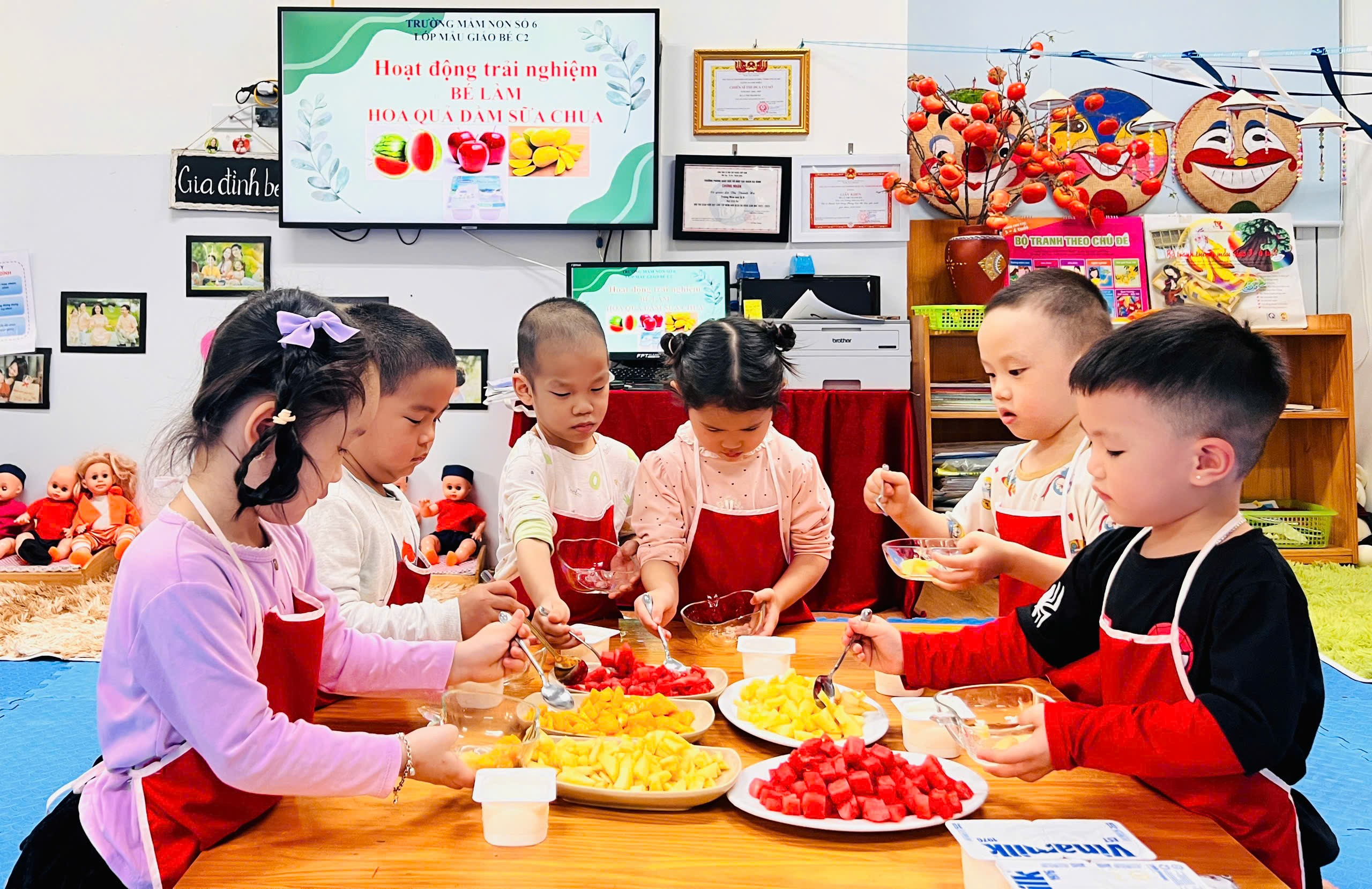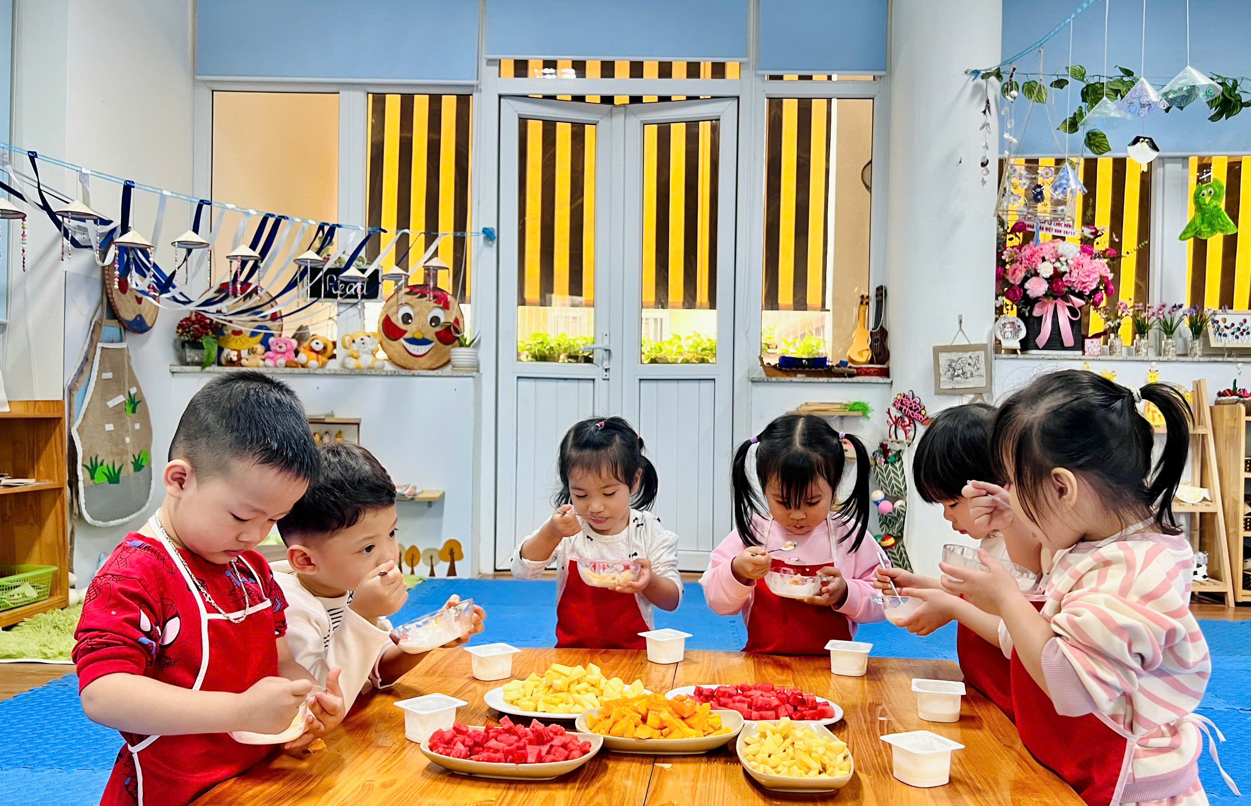 Nhằm tạo cơ hội cho trẻ được khám phá thế giới thực phẩm lành mạnh, rèn luyện các kỹ năng tự phục vụ và hình thành thói quen ăn uống khoa học, hôm nay lớp chúng mình đã tổ chức hoạt động trải nghiệm vô cùng hấp dẫn mang tên “Bé làm hoa quả dầm sữa chua”.