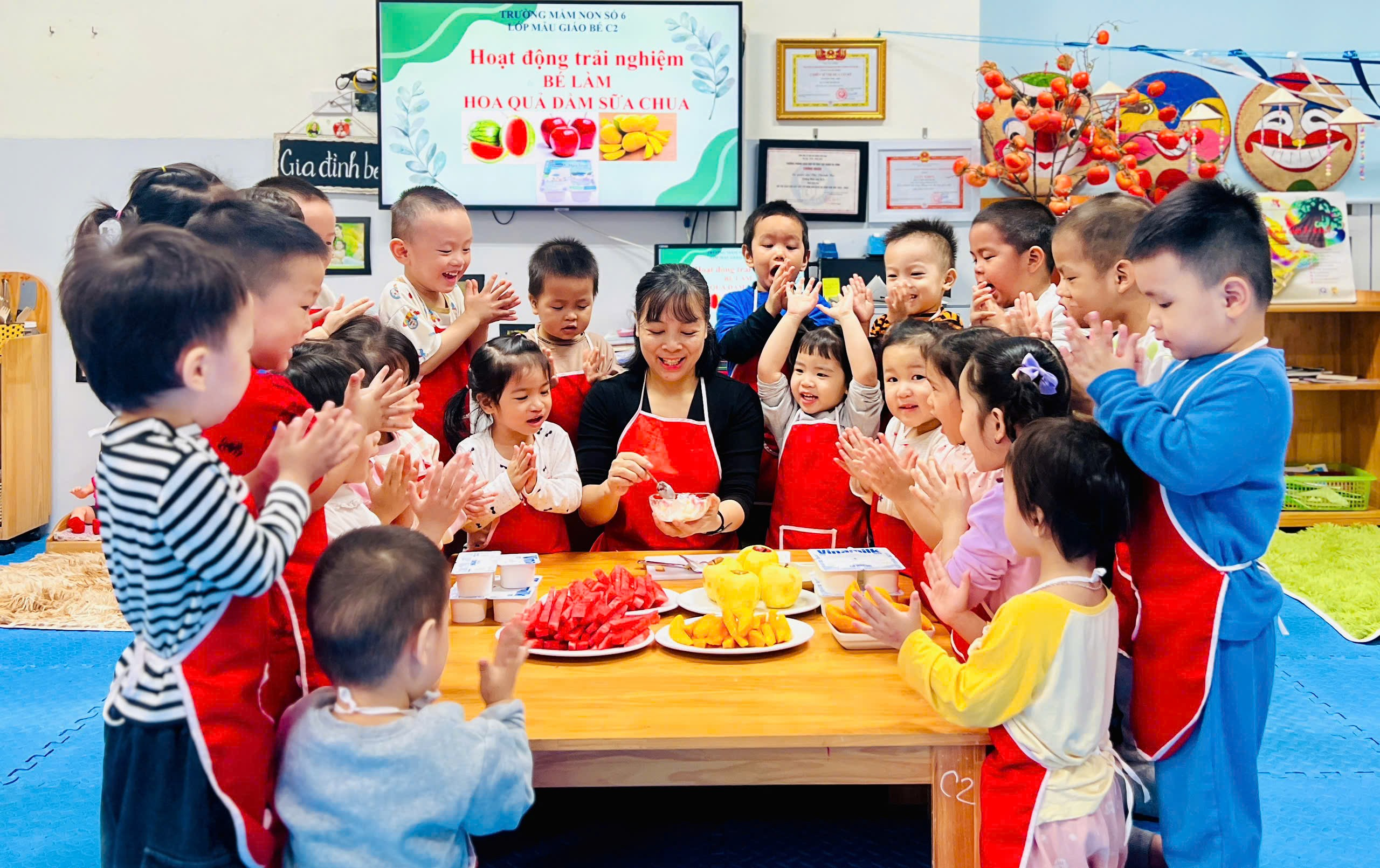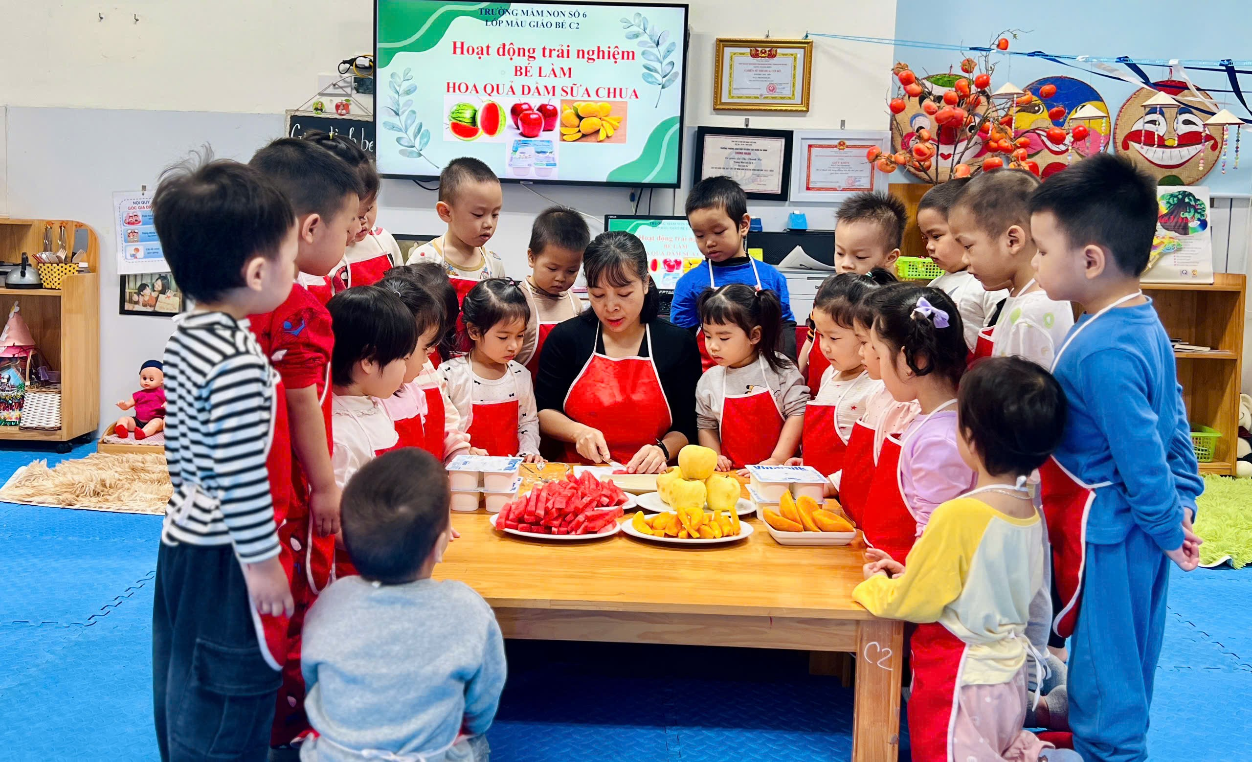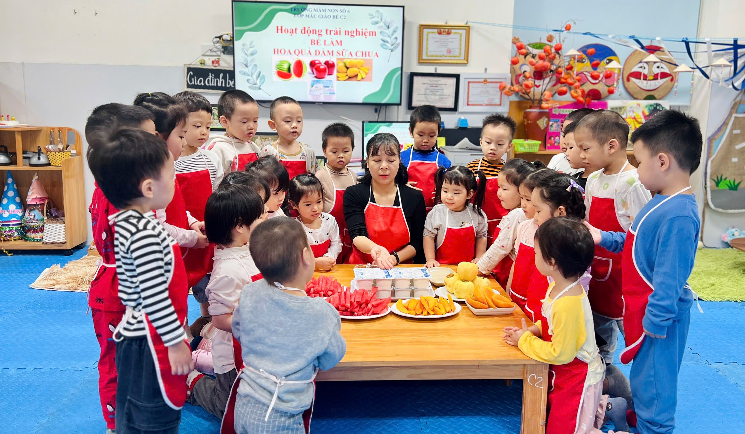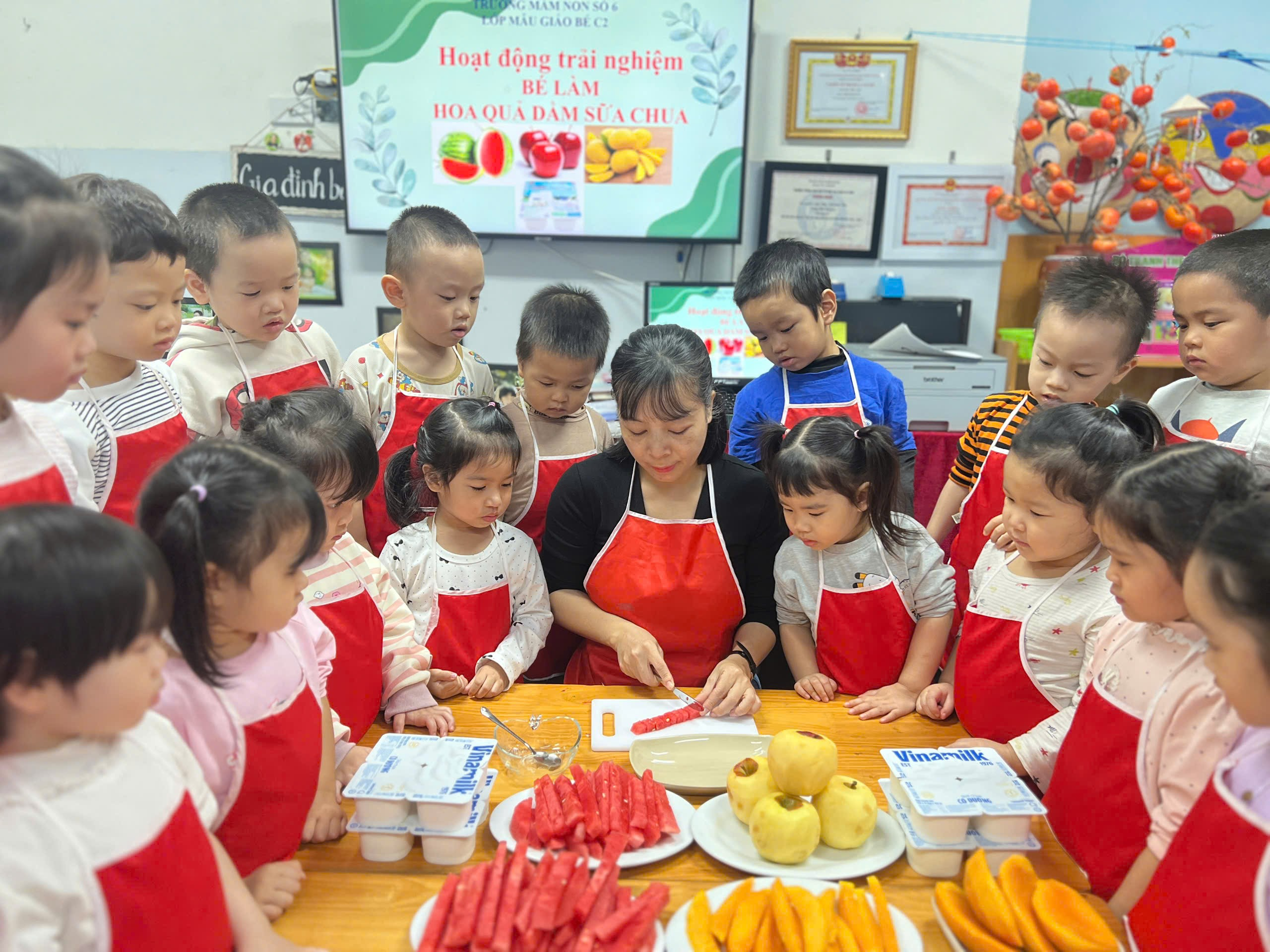 Nhằm tạo cơ hội cho trẻ được khám phá thế giới thực phẩm lành mạnh, rèn luyện các kỹ năng tự phục vụ và hình thành thói quen ăn uống khoa học, hôm nay lớp chúng mình đã tổ chức hoạt động trải nghiệm vô cùng hấp dẫn mang tên “Bé làm hoa quả dầm sữa chua”.