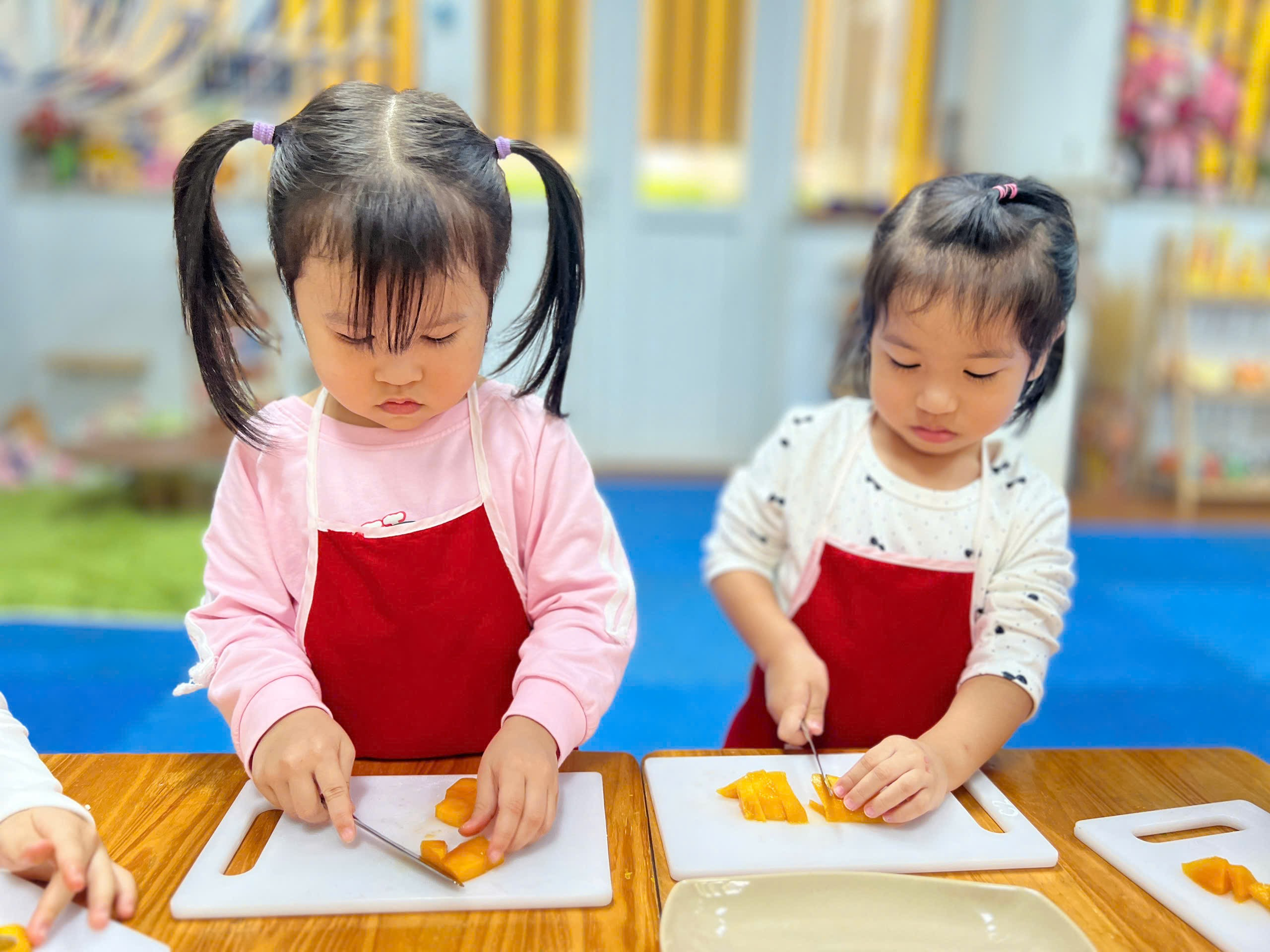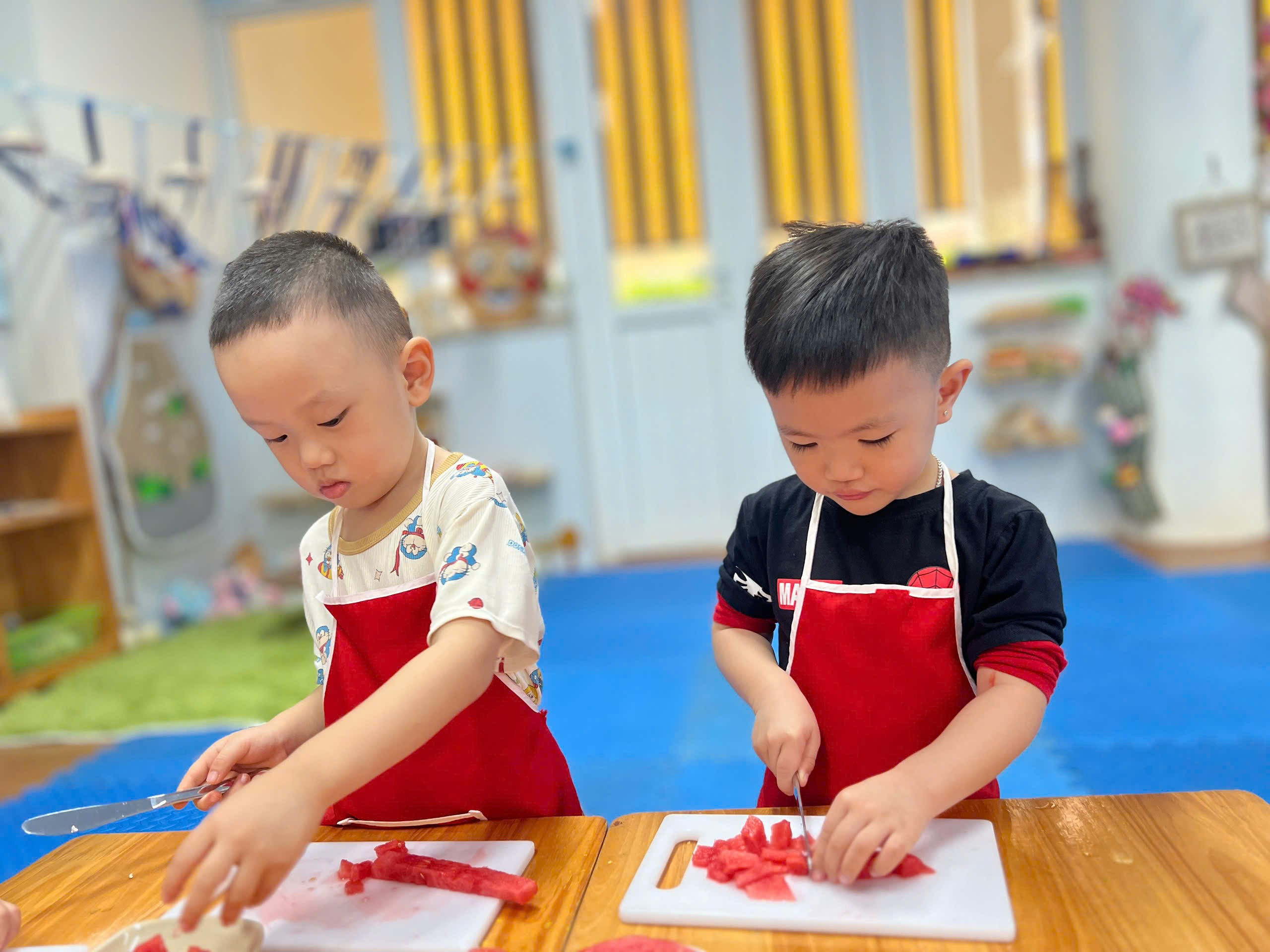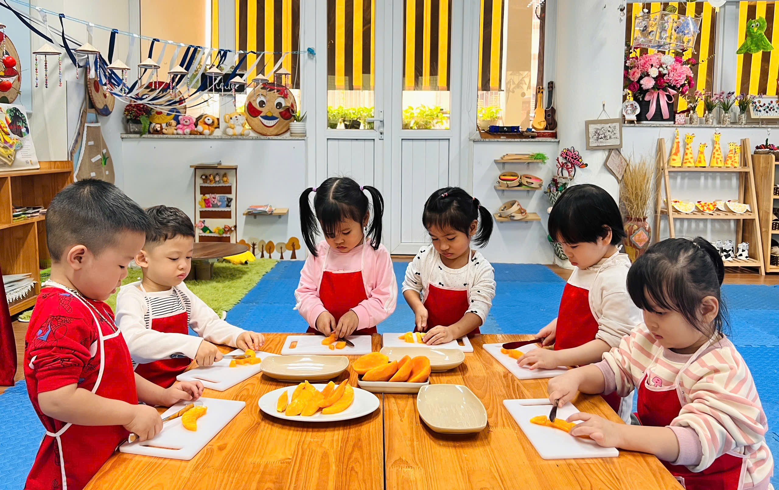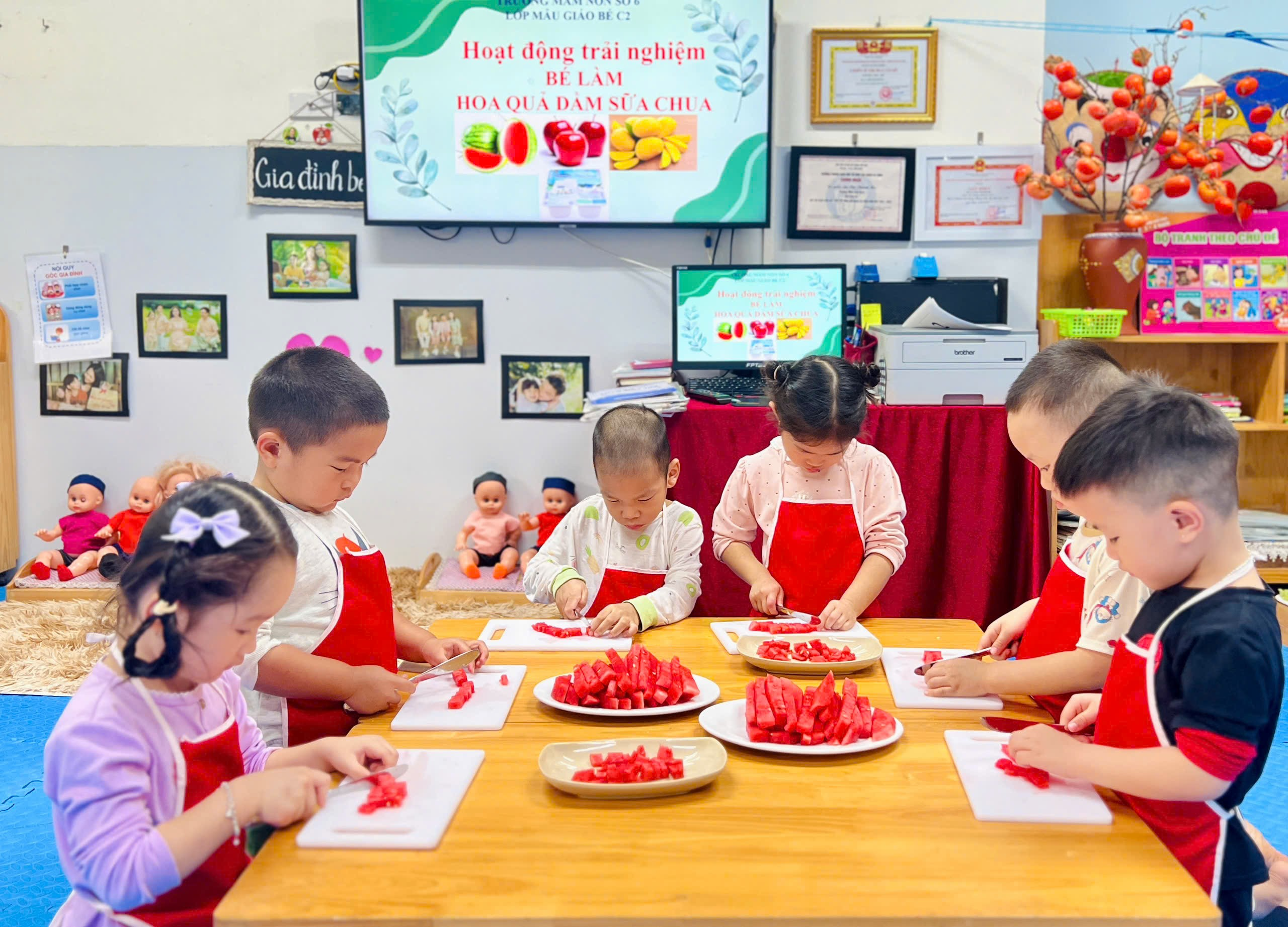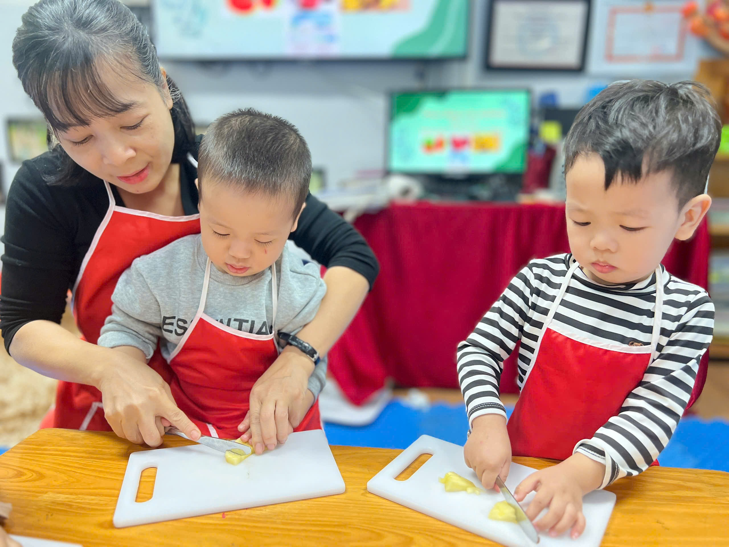 Các con chăm chú quan sát, sau đó mạnh dạn thực hành. Dưới sự hỗ trợ của cô, từng bạn đã tự tay cắt được những miếng dưa hấu đỏ mọng, xoài vàng óng, táo giòn ngọt. Nhiều bé tỏ ra vô cùng thích thú khi thấy thành quả từ đôi bàn tay nhỏ xinh của mình.