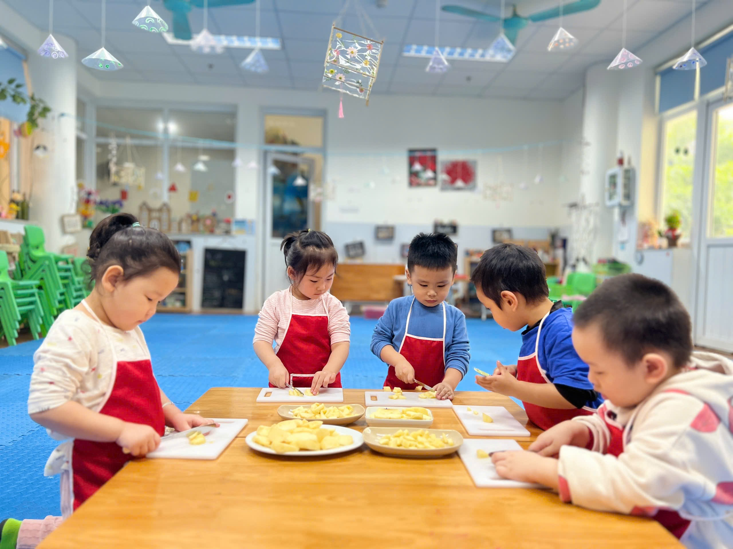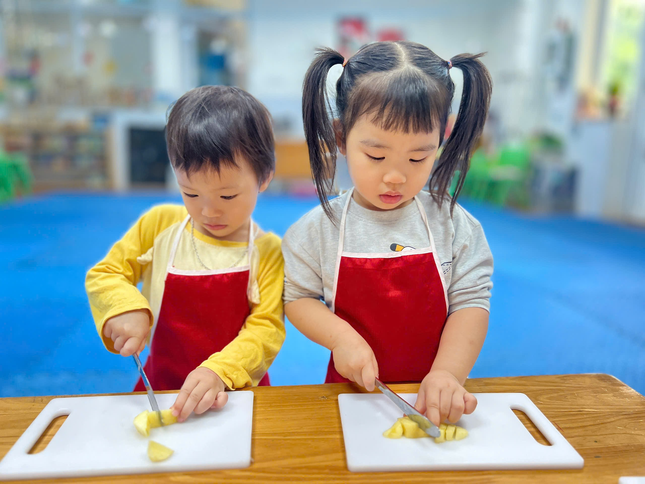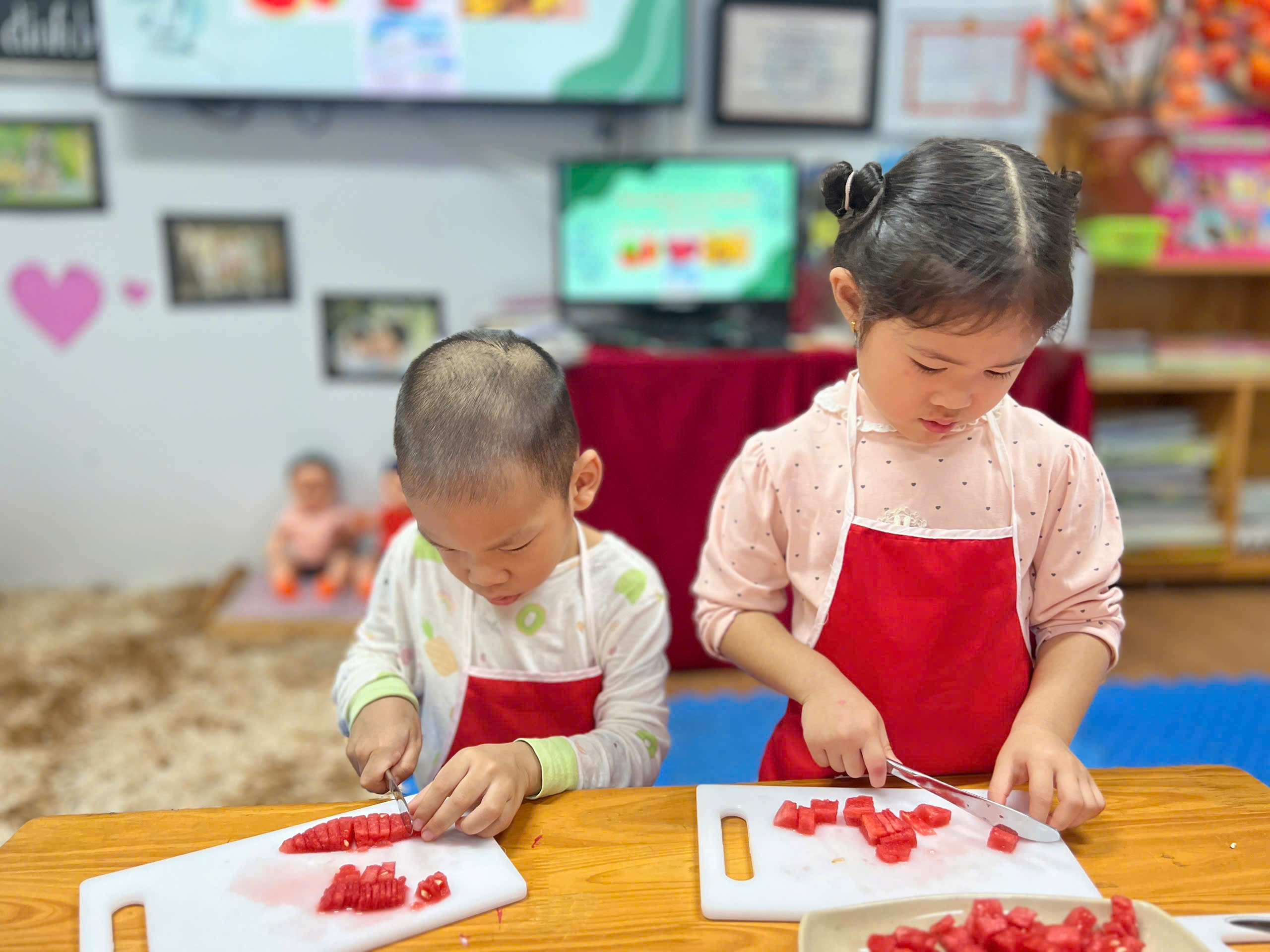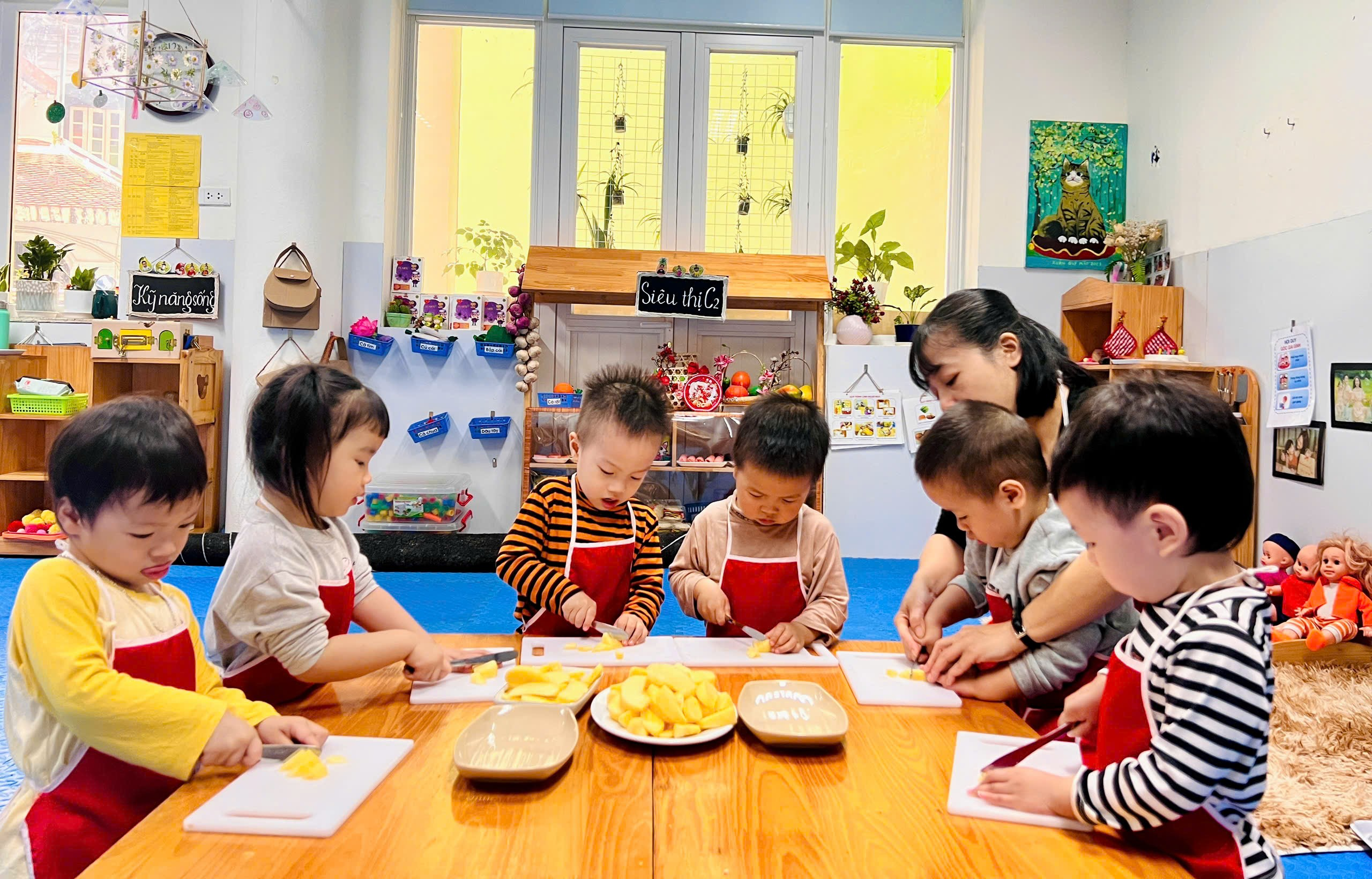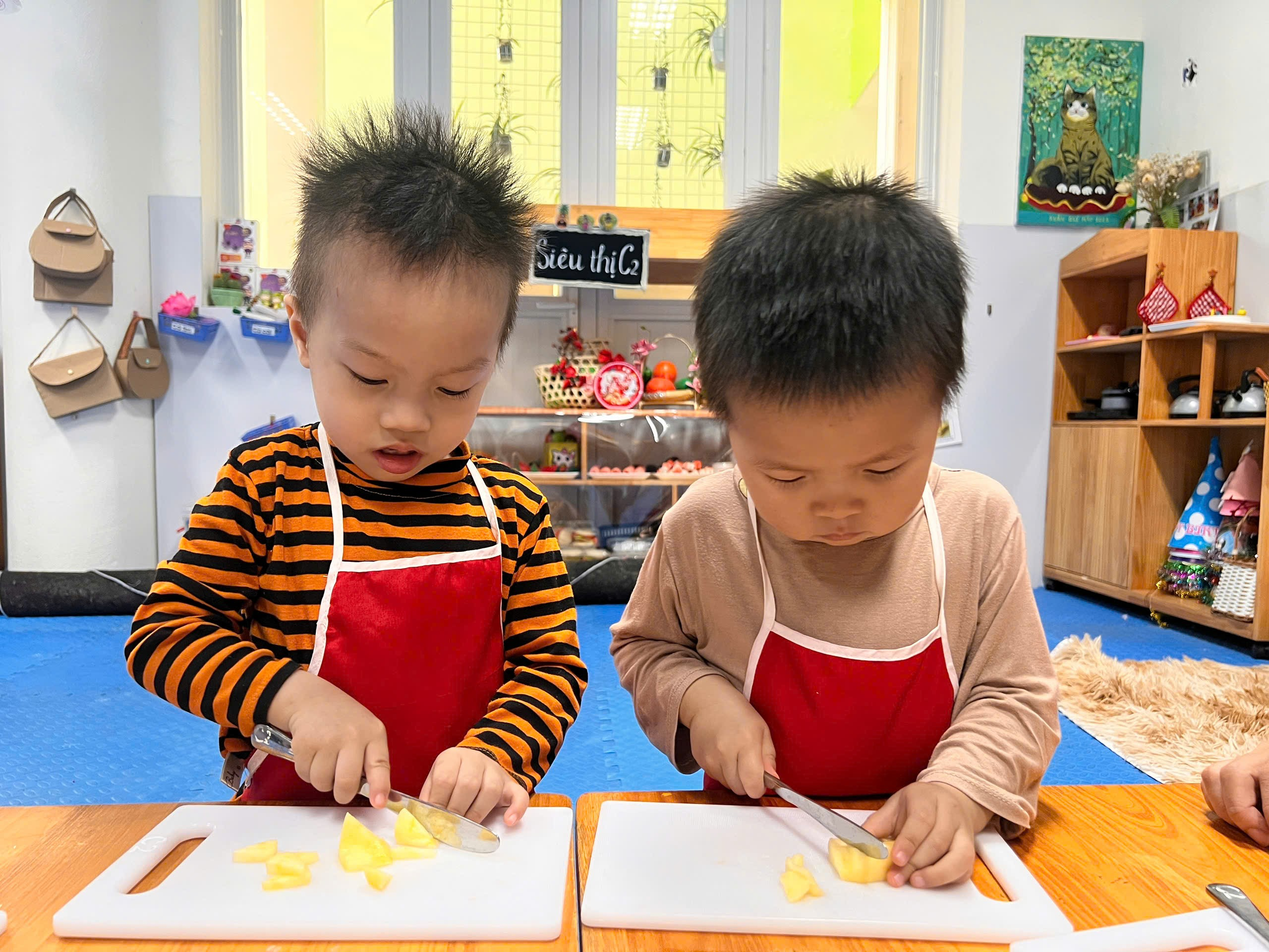 Các con chăm chú quan sát, sau đó mạnh dạn thực hành. Dưới sự hỗ trợ của cô, từng bạn đã tự tay cắt được những miếng dưa hấu đỏ mọng, xoài vàng óng, táo giòn ngọt. Nhiều bé tỏ ra vô cùng thích thú khi thấy thành quả từ đôi bàn tay nhỏ xinh của mình.