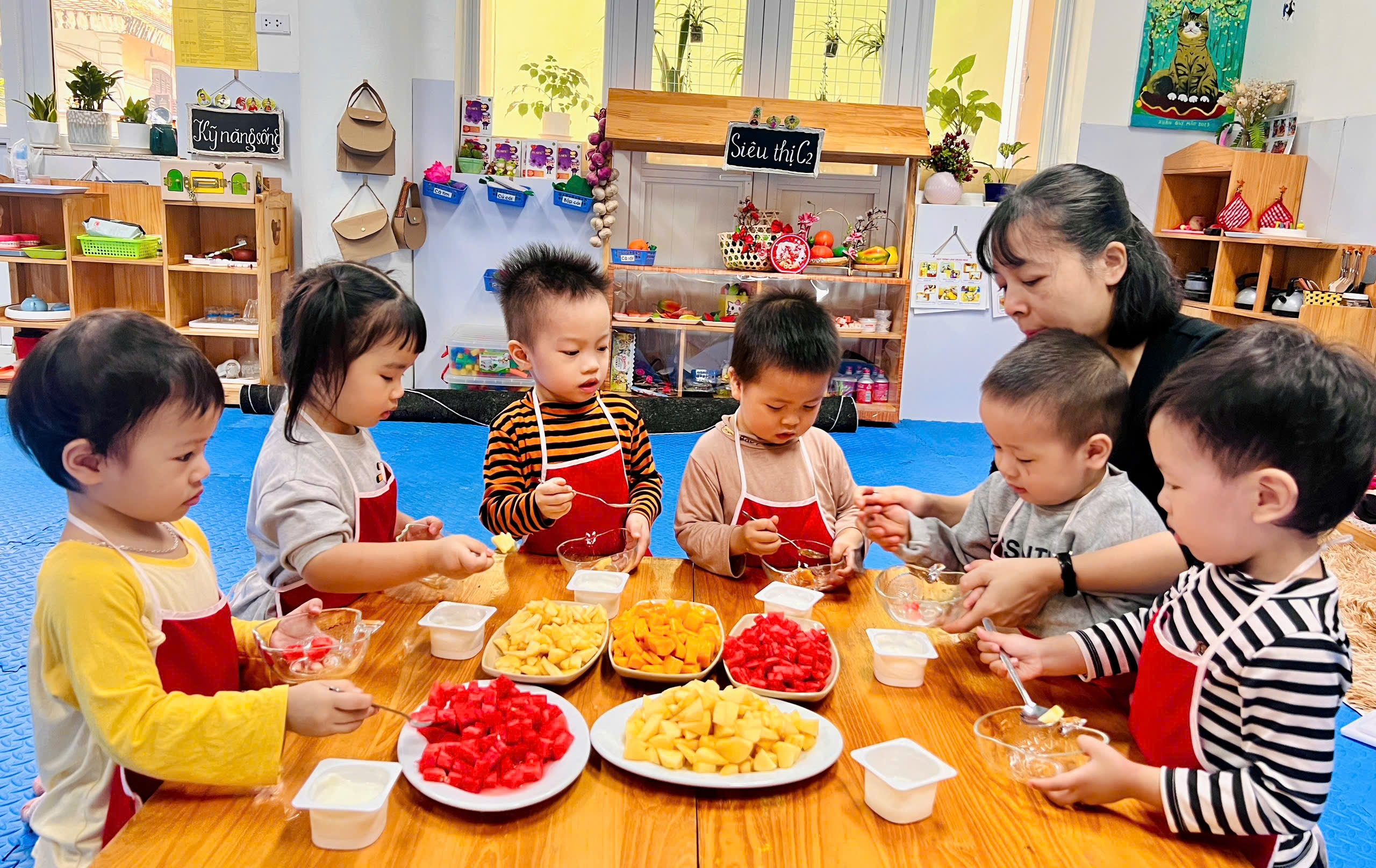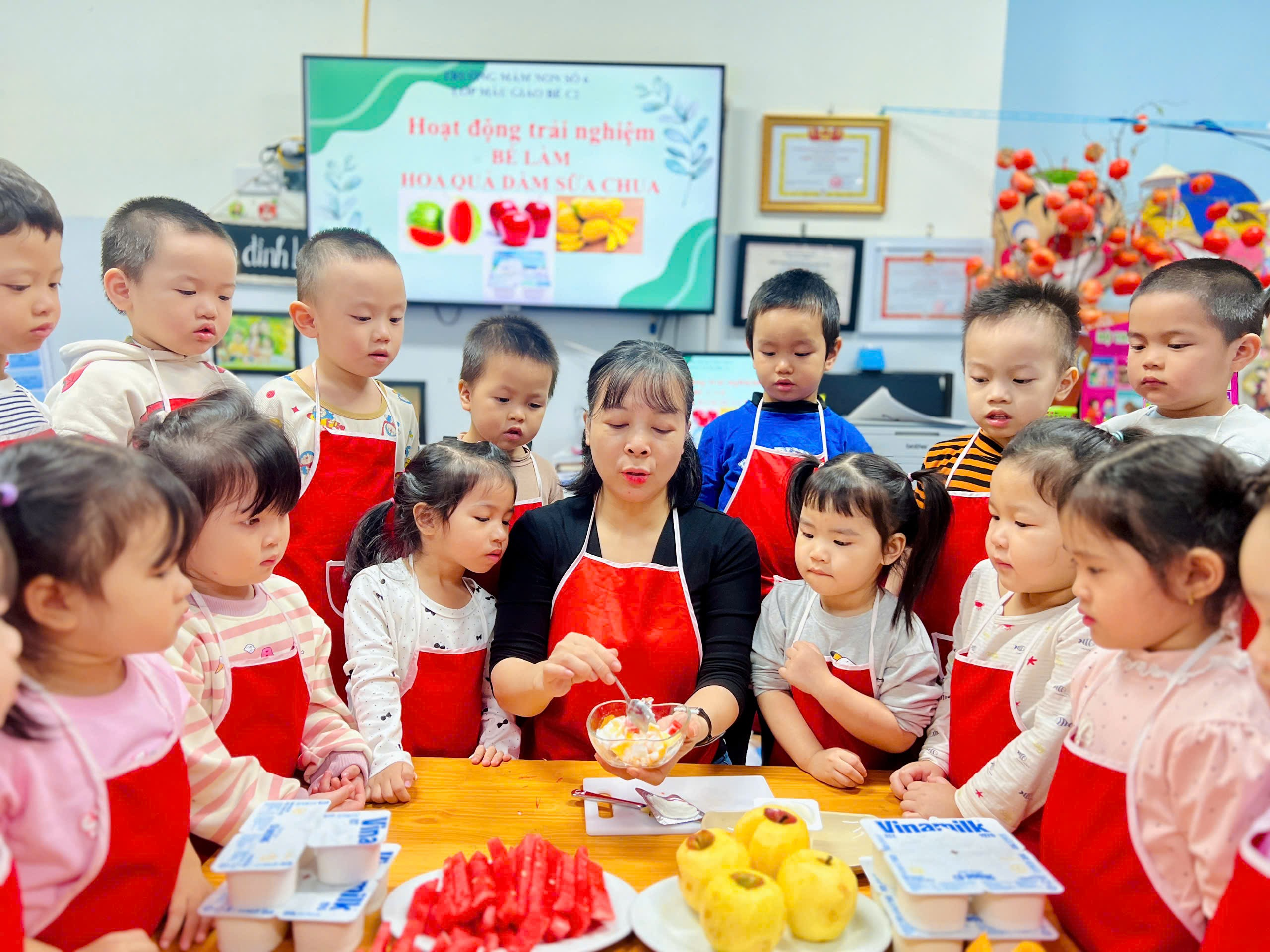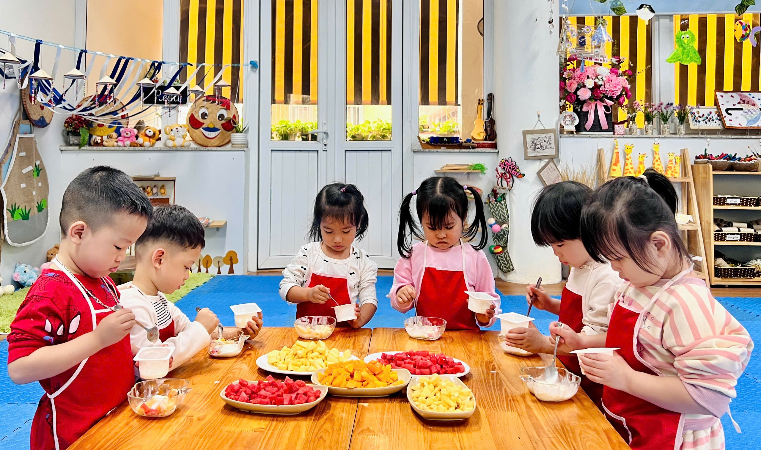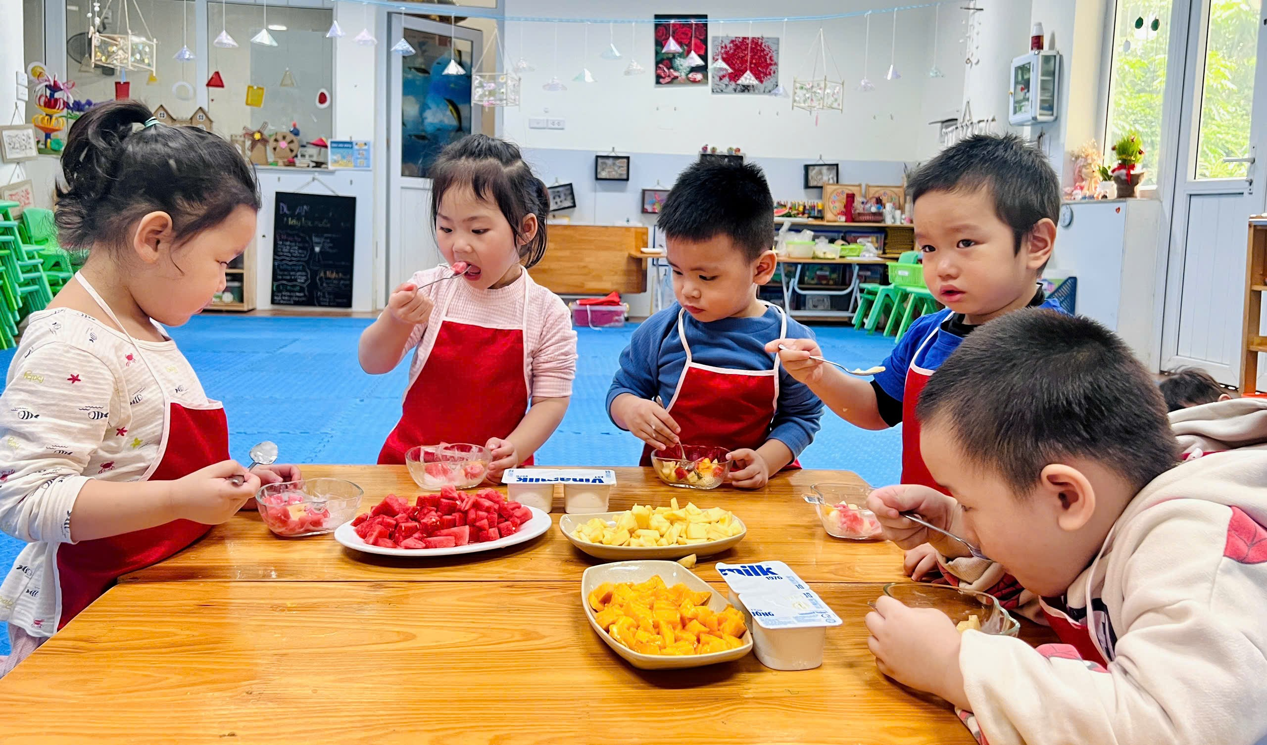 Khi trái cây đã được chuẩn bị đầy đủ, cô phát cho mỗi bạn một hộp sữa chua. Các bé cẩn thận đổ sữa chua vào bát hoa quả rồi dùng thìa đảo nhẹ tay. Có bạn thích trộn đều, có bạn lại giữ nguyên từng lớp màu để món ăn trông thật đẹp mắt.