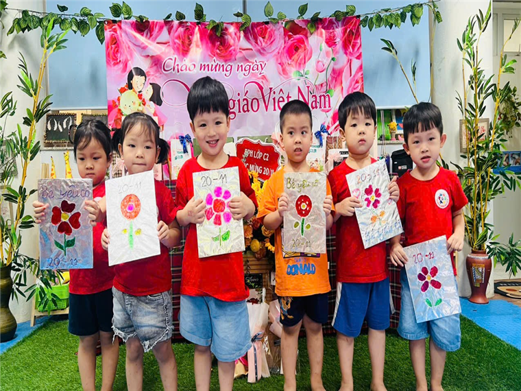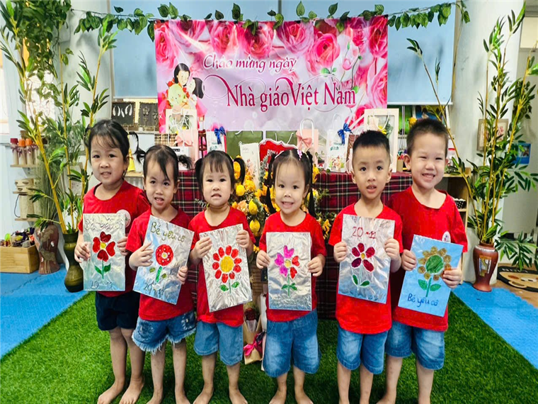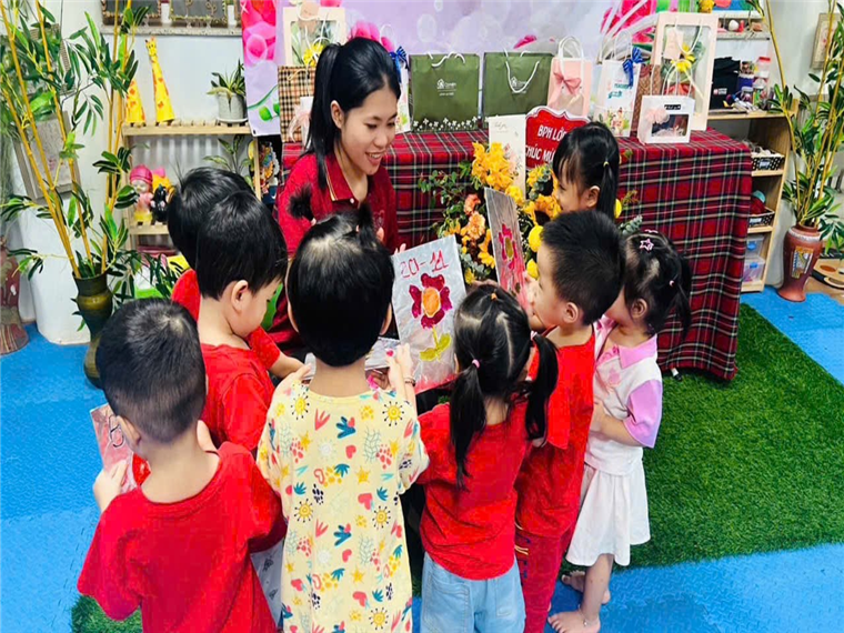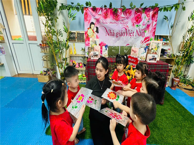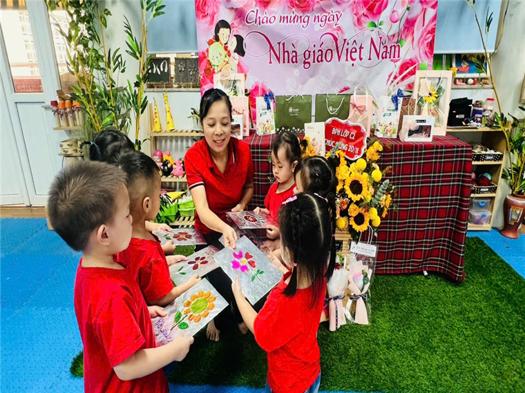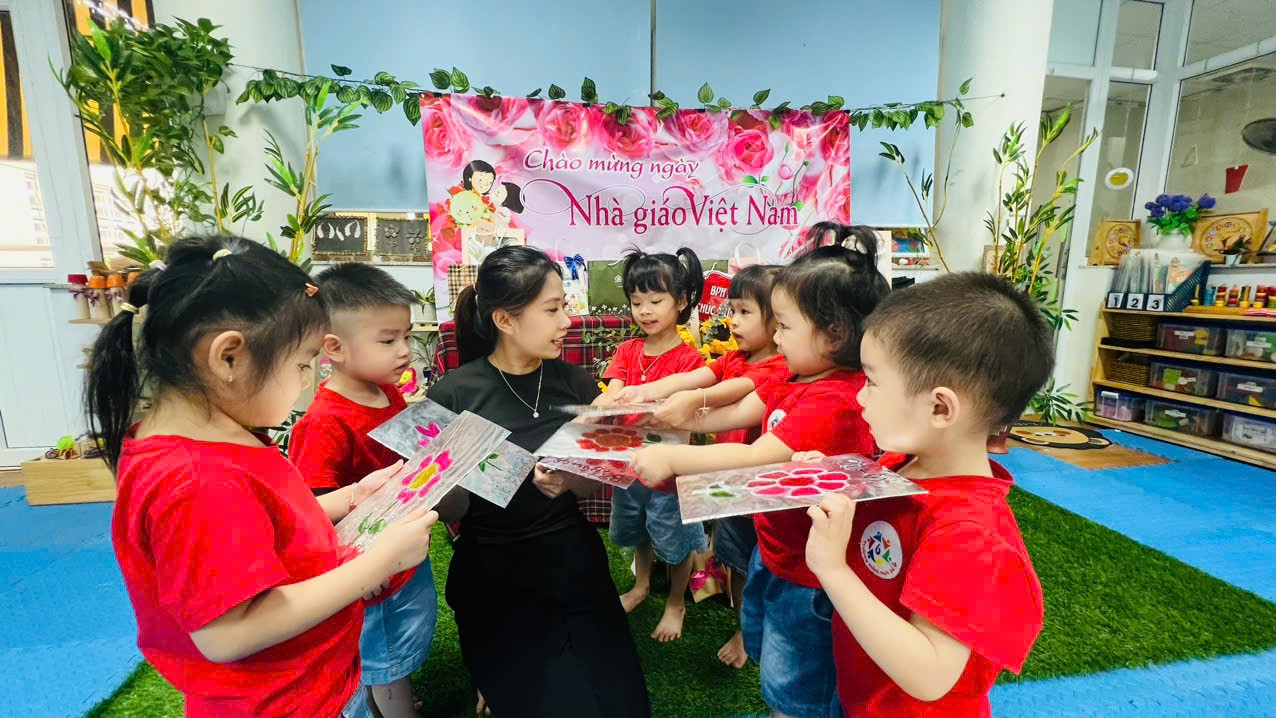Đối với cô giáo, những món quà nhỏ ngộ nghĩnh và những lời chúc ngọt ngào là nguồn động viên rất lớn tiếp thêm động lực cho các cô chăm sóc dạy dỗ các con. Mỗi bức tranh bé làm là một minh chứng cho tình yêu thương, sự quan tâm và lòng biết ơn mà các bạn nhỏ dành tặng cô. Khi tất cả các bức tranh đã hoàn thành, các bé sẽ có cơ hội trao tặng trực tiếp cho cô giáo. Đây là một khoảnh khắc đầy xúc động, những món quà nhỏ bé được trao đi cùng những lời chúc tốt đẹp. Cô giáo rất vui khi đón nhận tình cảm chân thành và lòng biết ơn từ các học trò yêu quý của mình. Sau đây là một số hình ảnh của hoạt động đầy ý nghĩa này:
