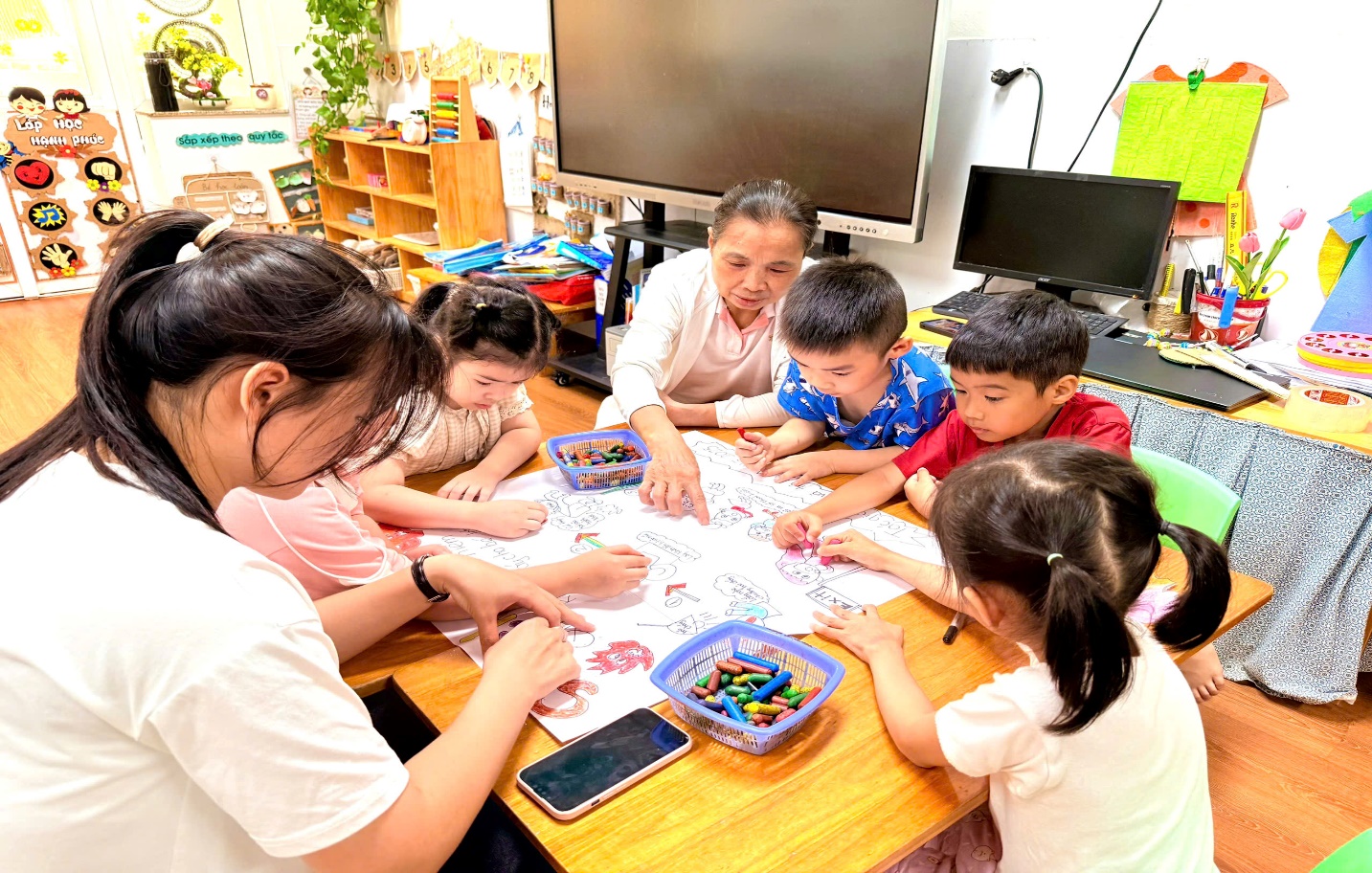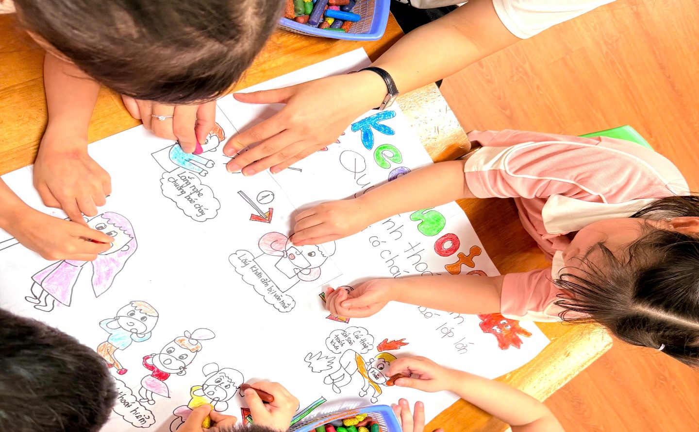 Cùng cô vẽ trang trí bảng biểu nội quy và kỹ năng thoát hiểm treo ở góc cứu hỏa của lớp