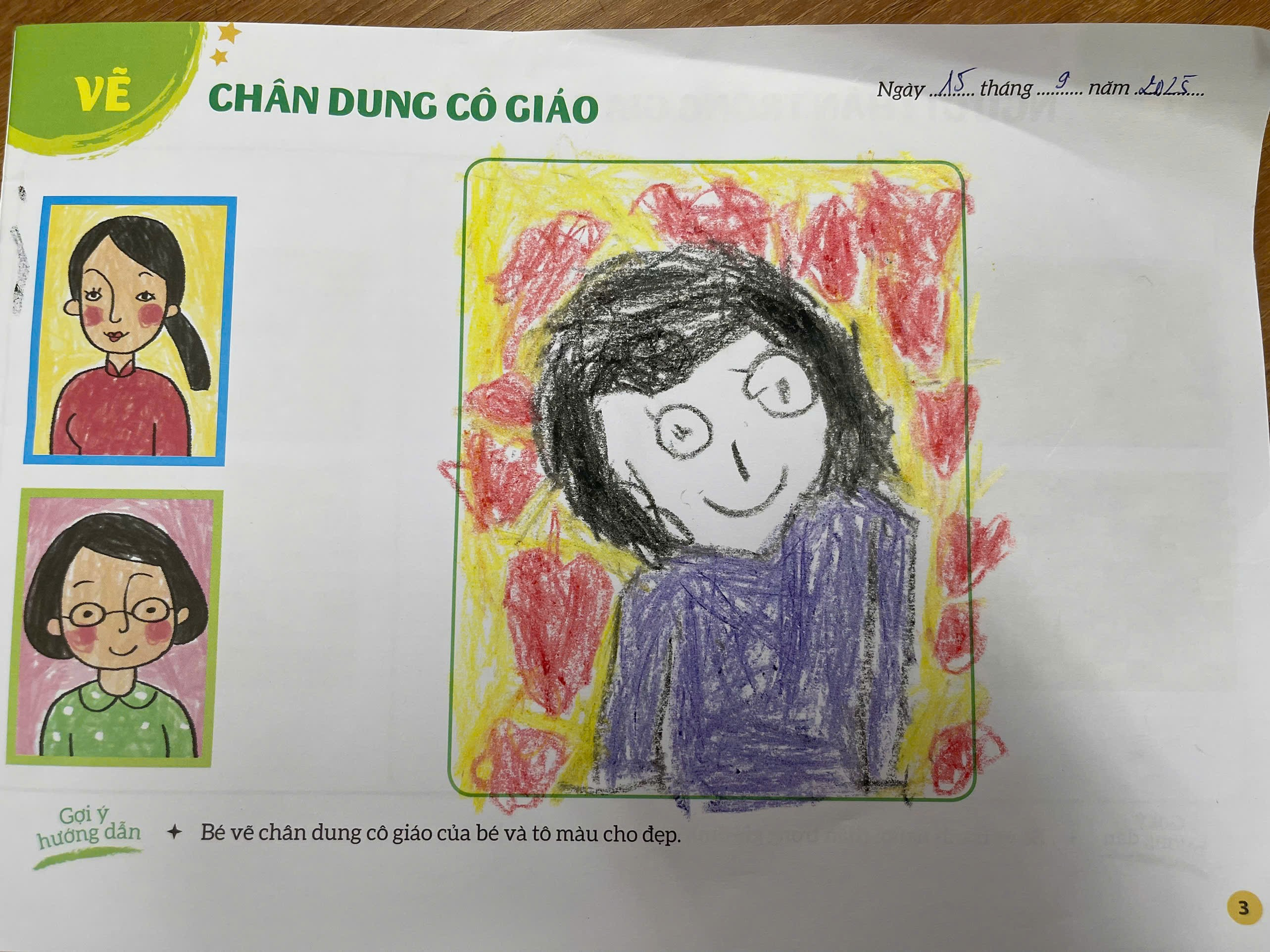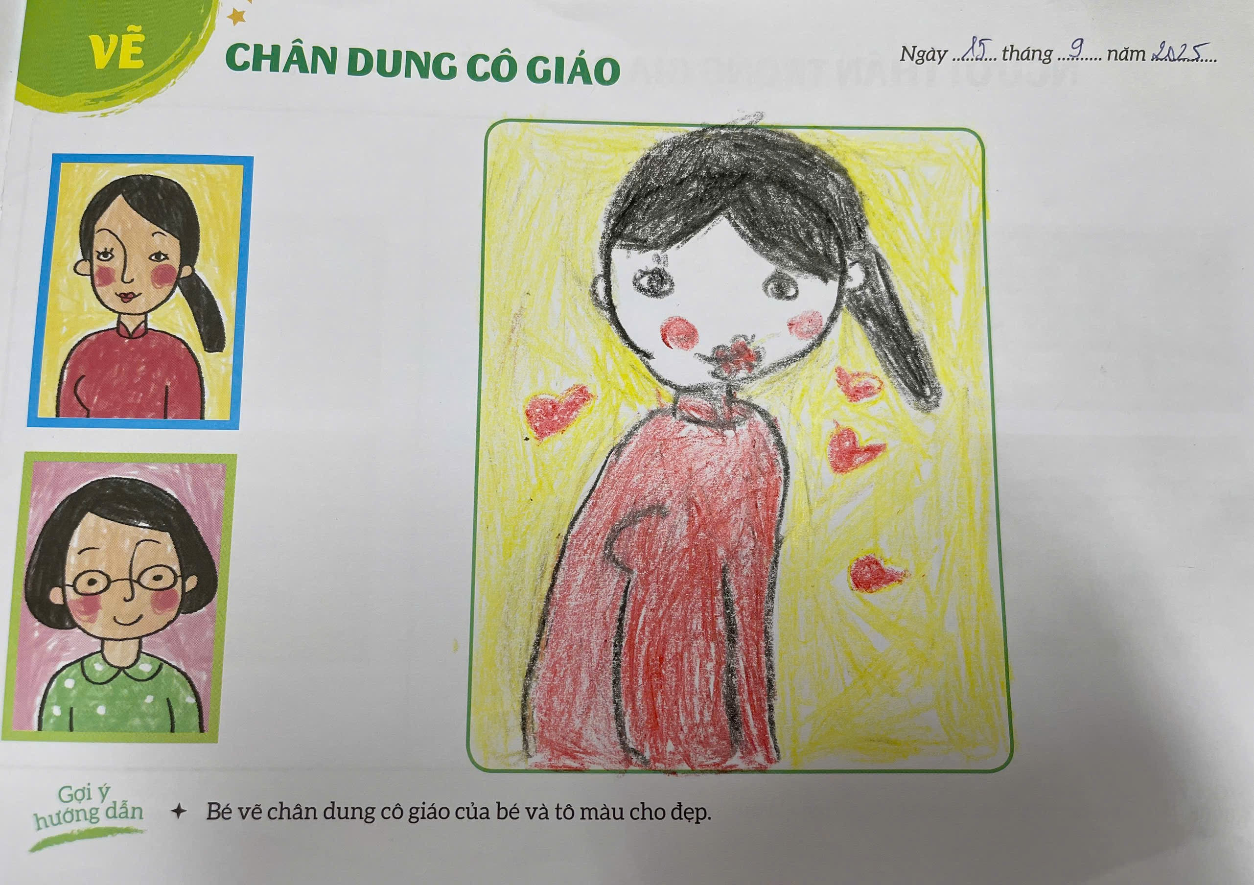 Mỗi bức vẽ là một câu chuyện ngây thơ, hồn nhiên: có bạn vẽ nụ cười thật tươi của cô, có bạn chú ý đến mái tóc, có bạn lại ấn tượng với cả chiếc áo đồng phục cô mặc hàng ngày,…. Dù đường nét còn vụng về, nhưng trong đó chứa đựng tất cả tình cảm trong sáng mà các con dành cho cô giáo của mình 💕.