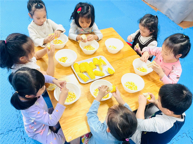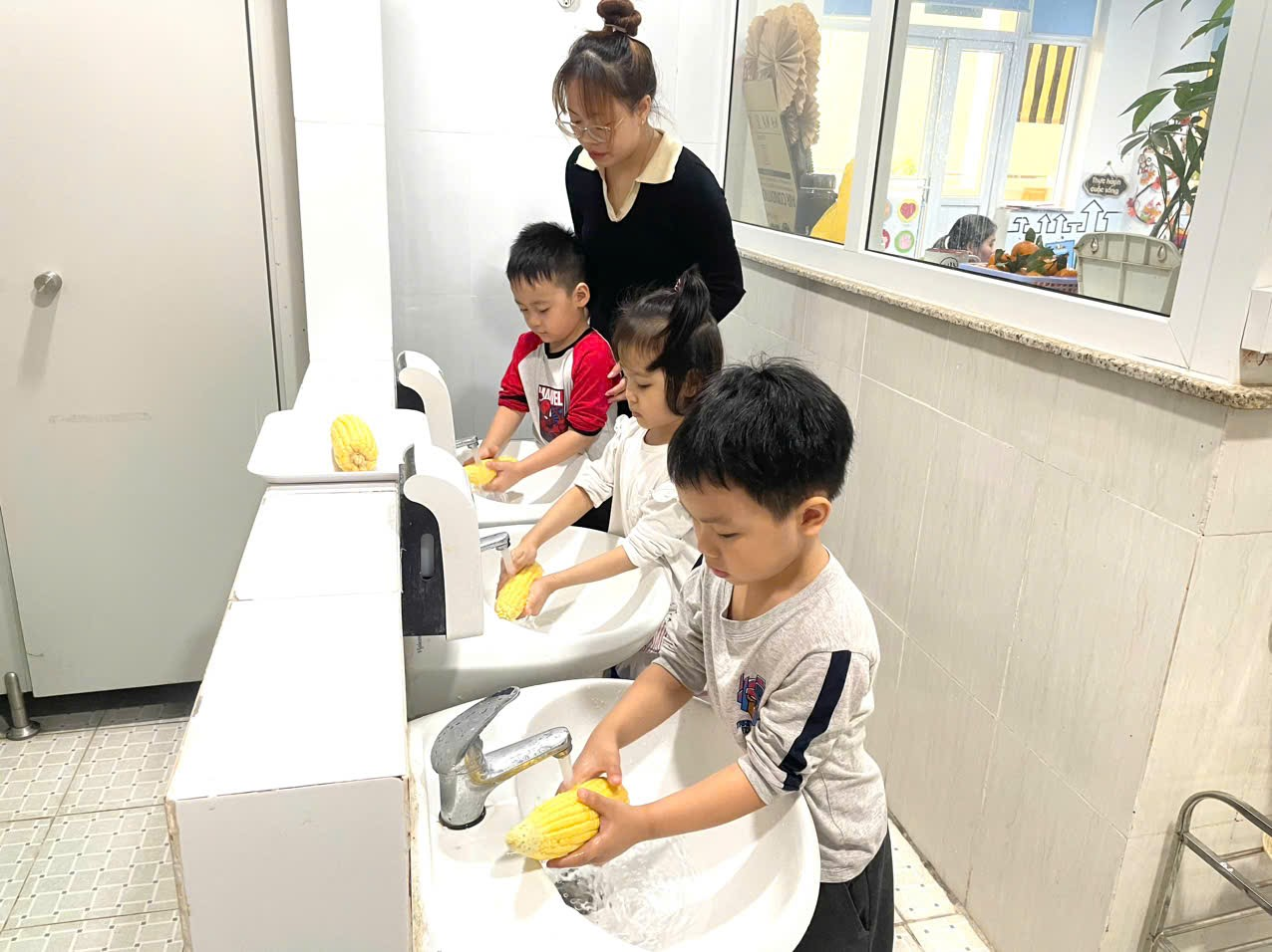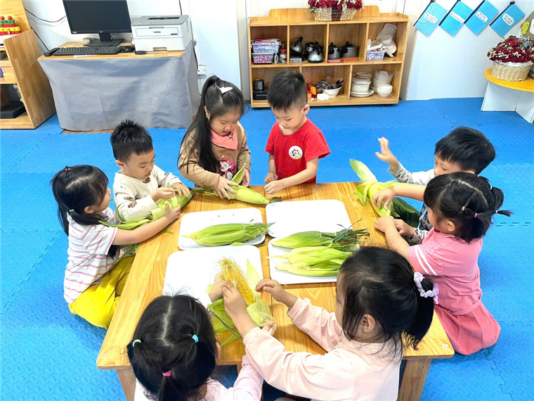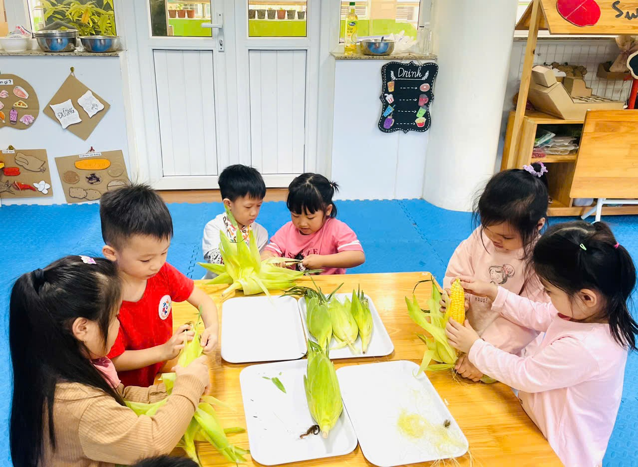 Cô giáo hướng dẫn các bạn bóc bẹ ngô, rửa ngô, tách ngô và pha bột làm bánh ngô.