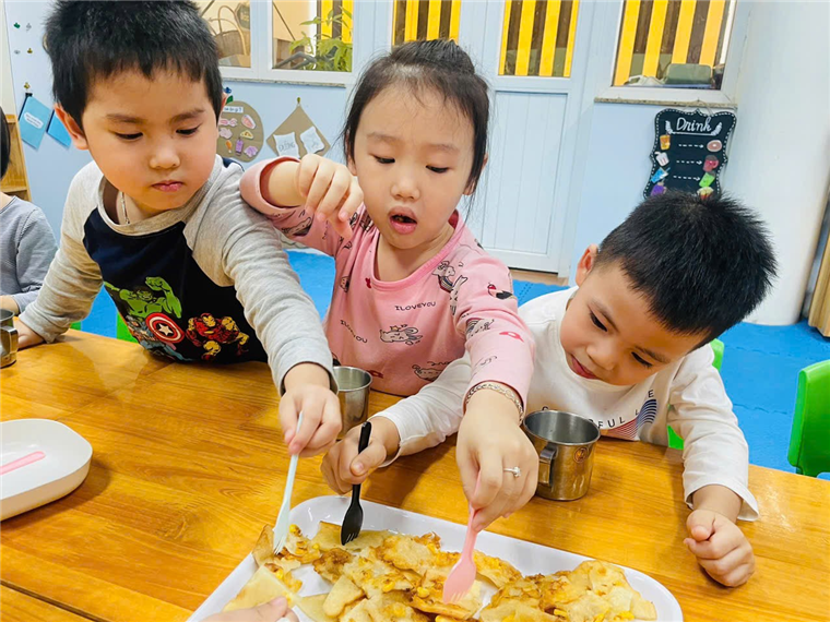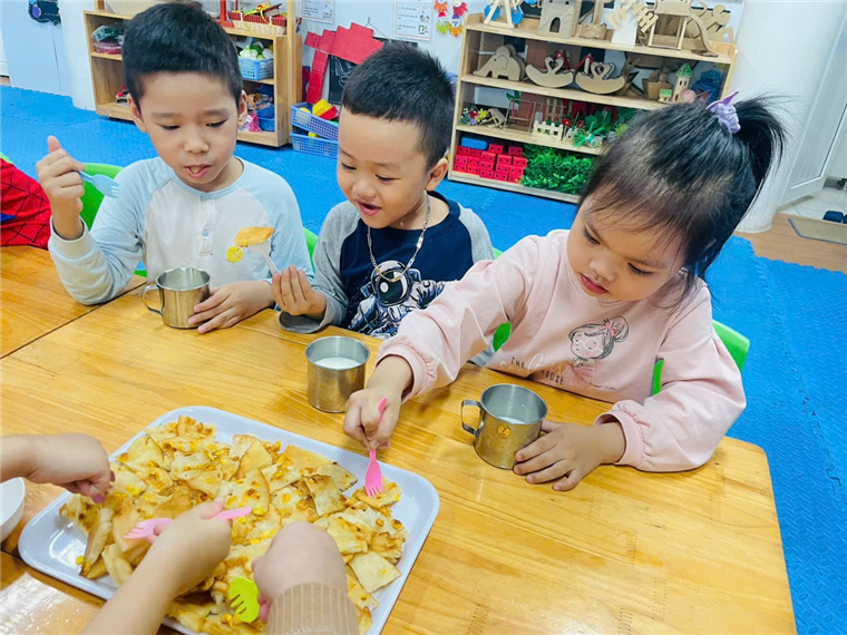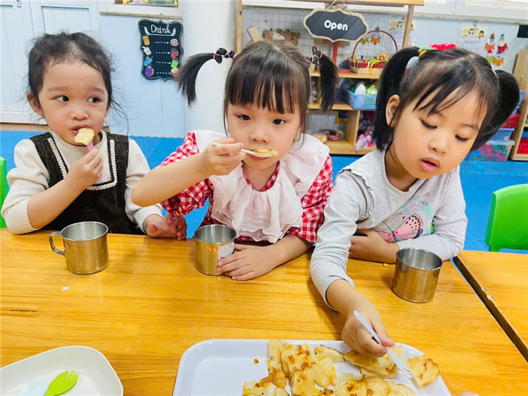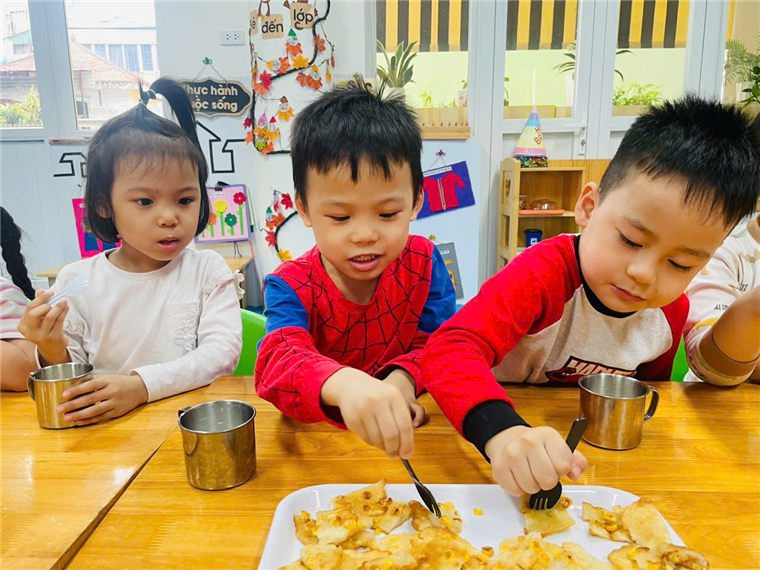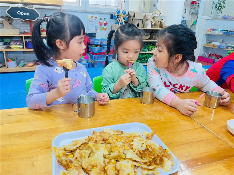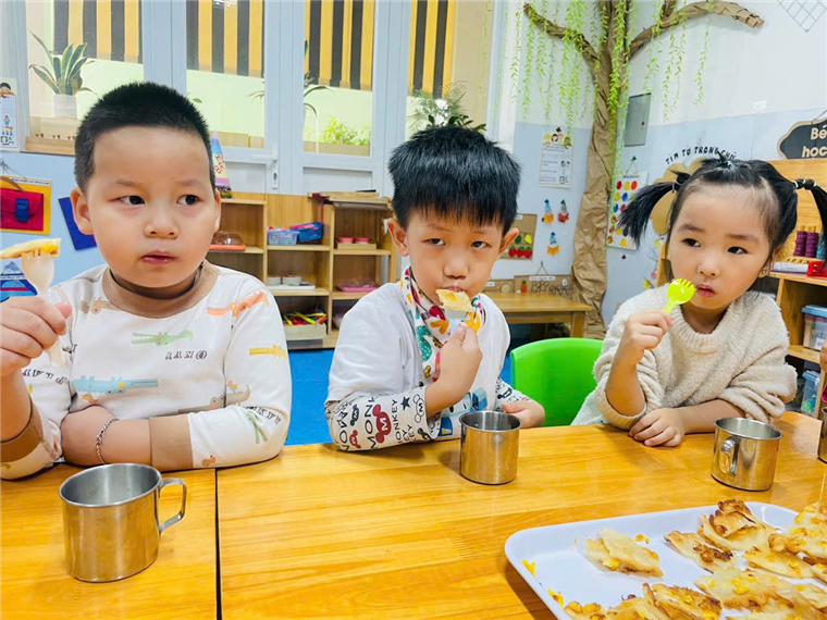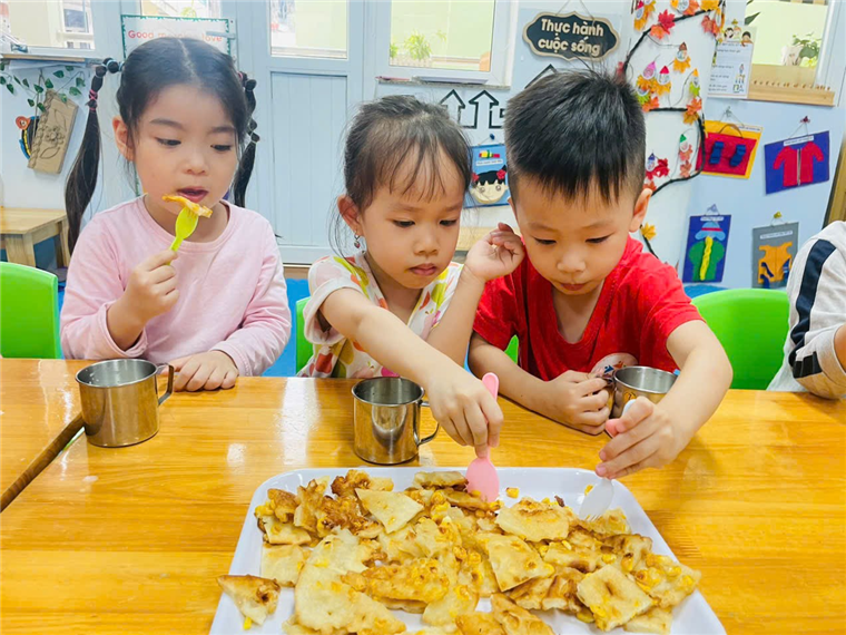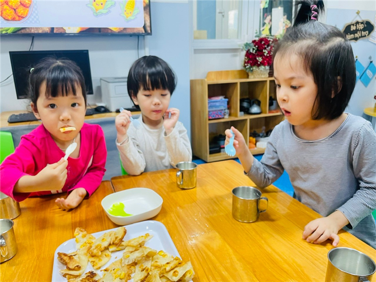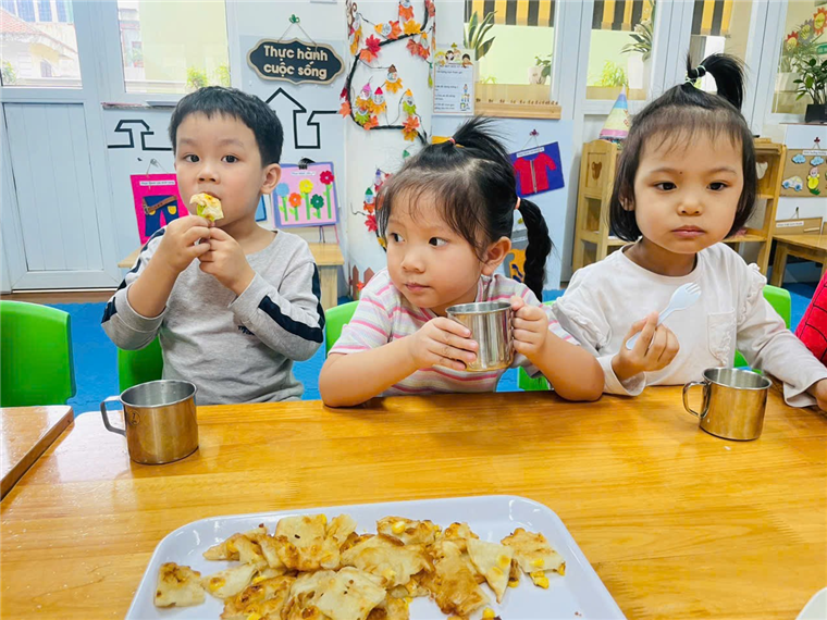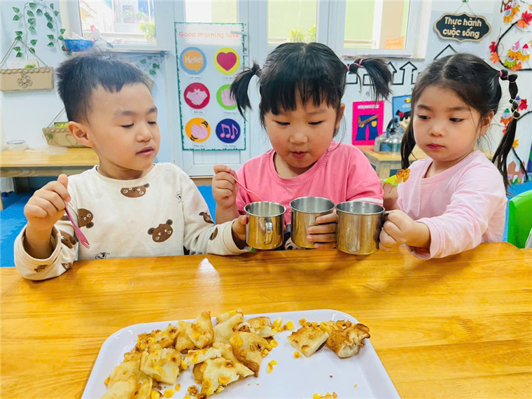 Các bé rất vui khi được thưởng thức những chiếc bánh ngô tự tay mình làm ra thơm ngon, béo ngậy.