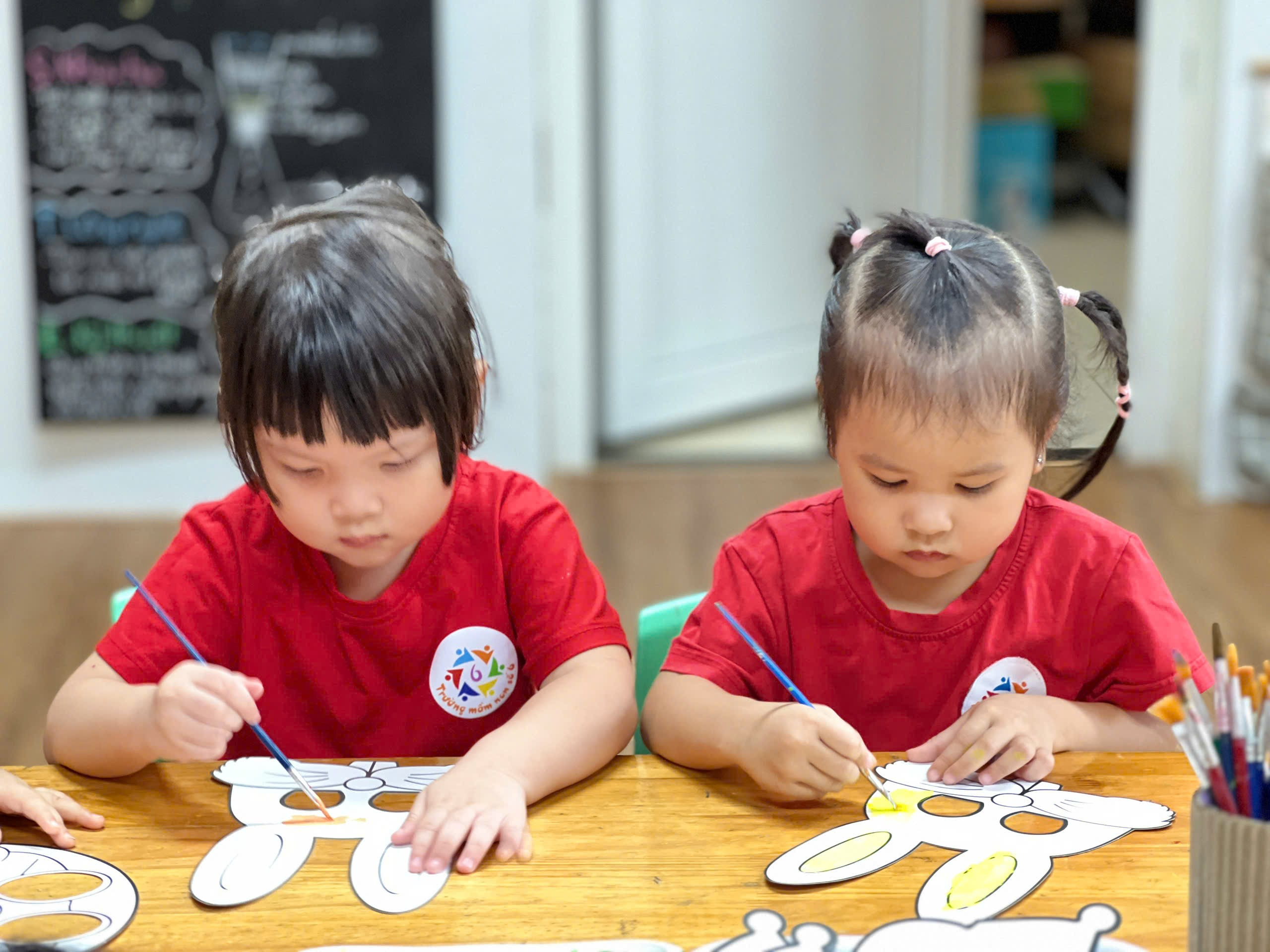 Các bé say sưa tô màu chiếc mặt nạ của mình