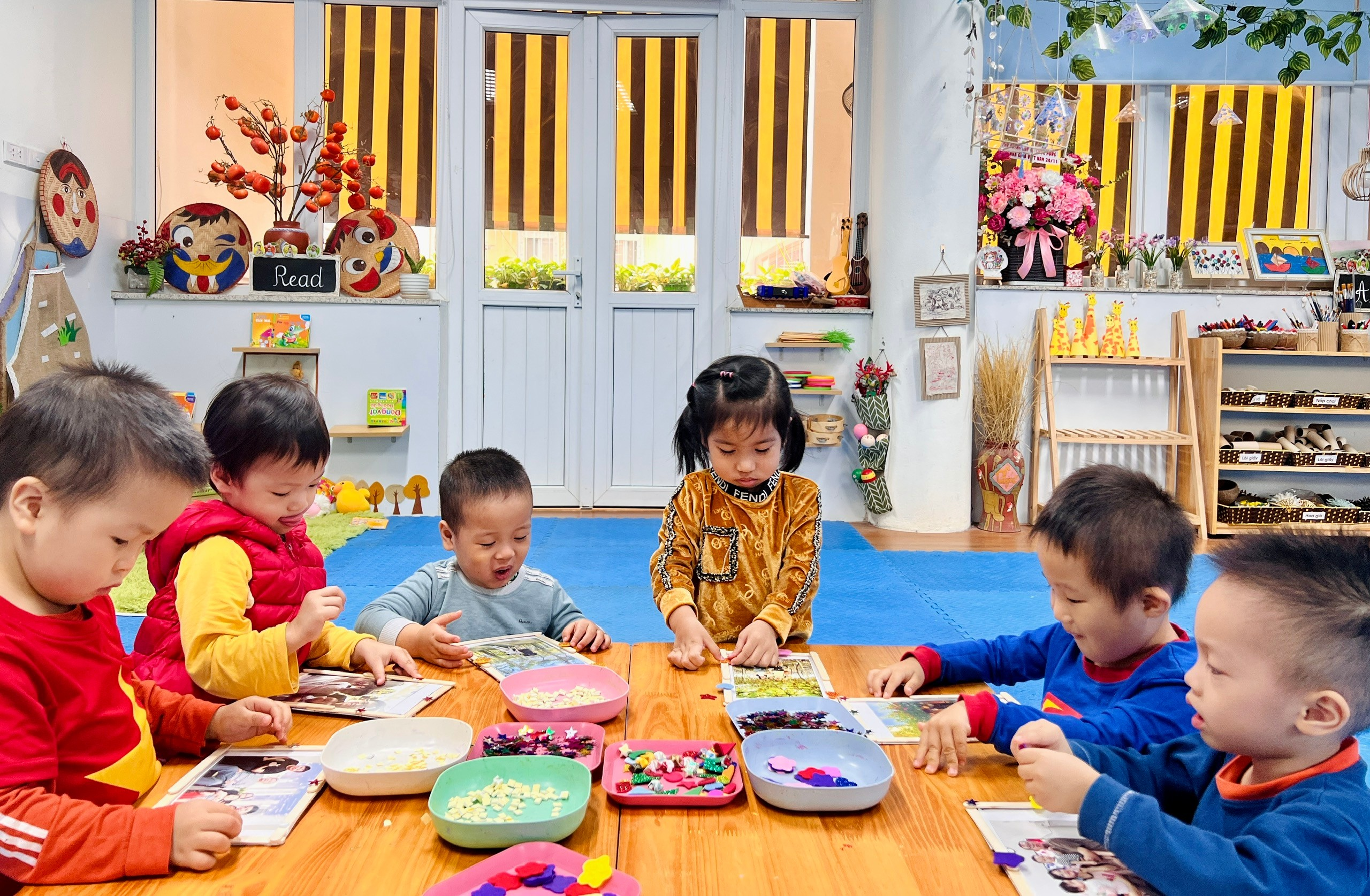 Từ những nguyên liệu đơn giản đó, các bé được tự do sáng tạo, đặt các hình theo ý tưởng riêng, tạo bố cục trước khi dán cố định lên khung ảnh bằng băng dính xốp an toàn.