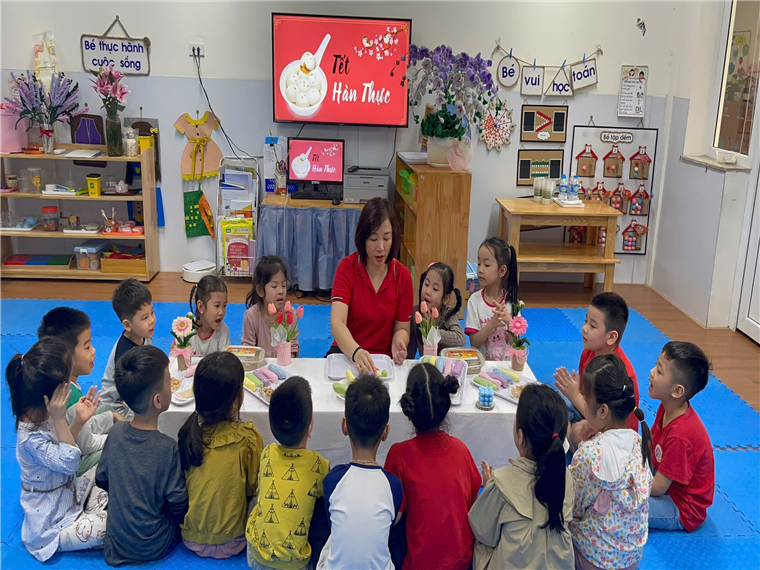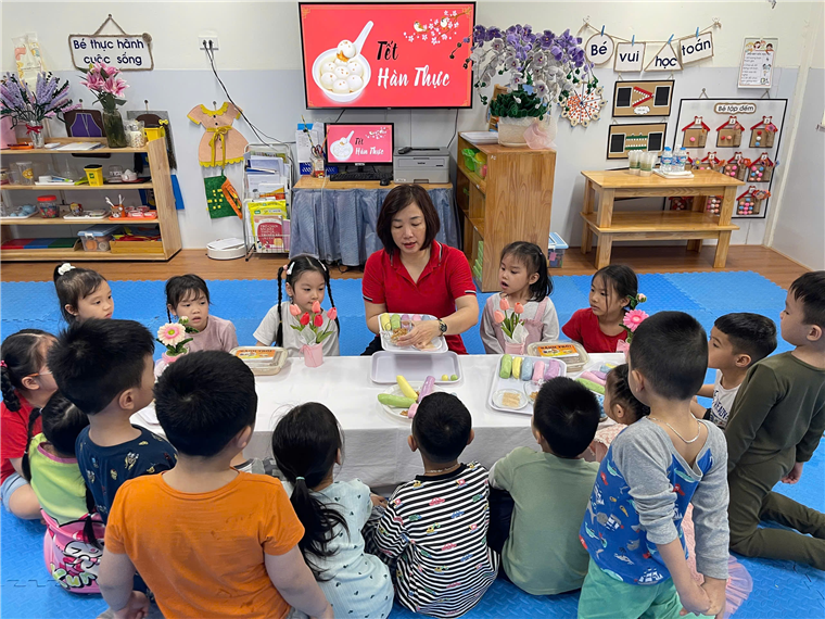 Cả lớp chăm chú lắng nghe cô giới thiệu các nguyên liệu làm bánh trôi