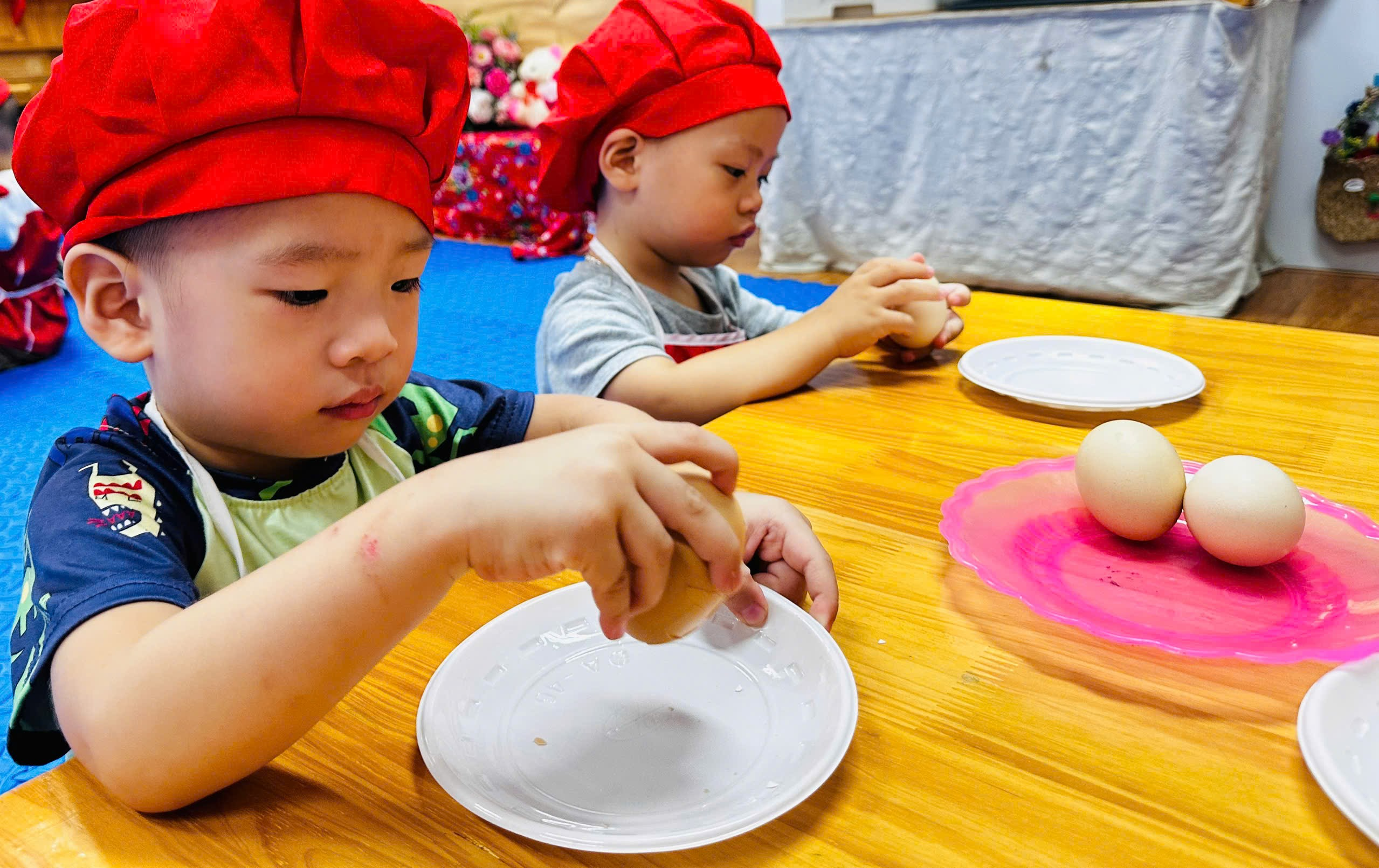 Chúng tớ được cô hướng dẫn cách bóc vỏ trứng đấy các bạn ạ!