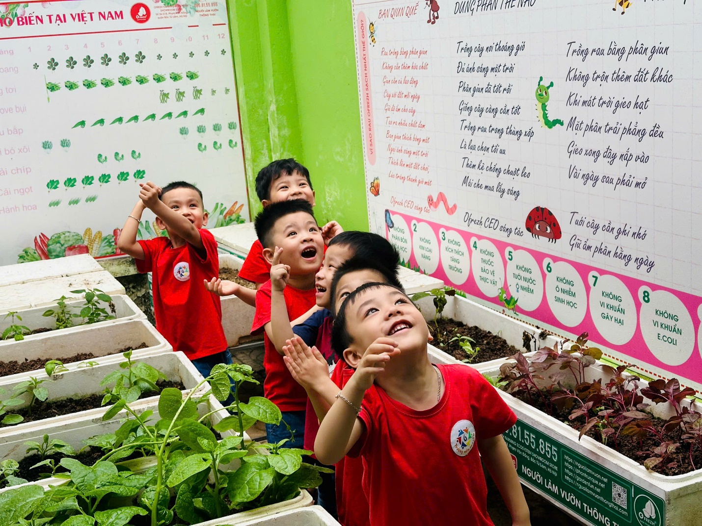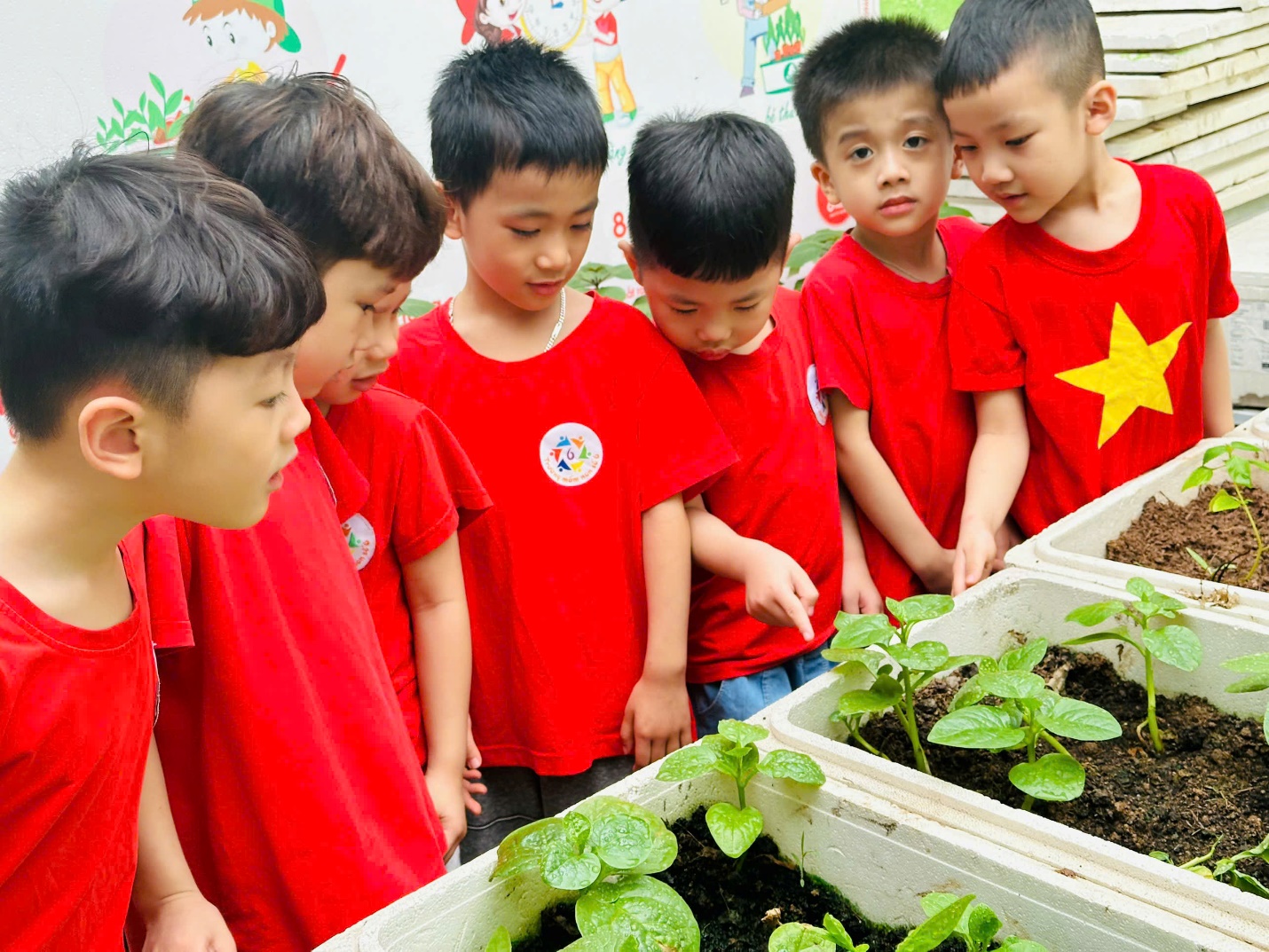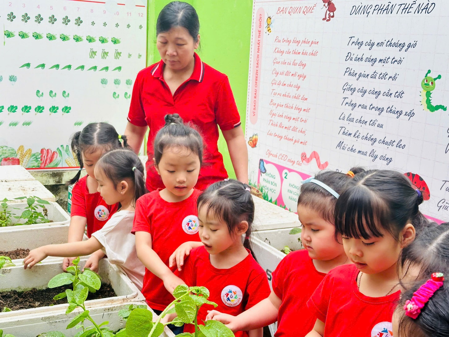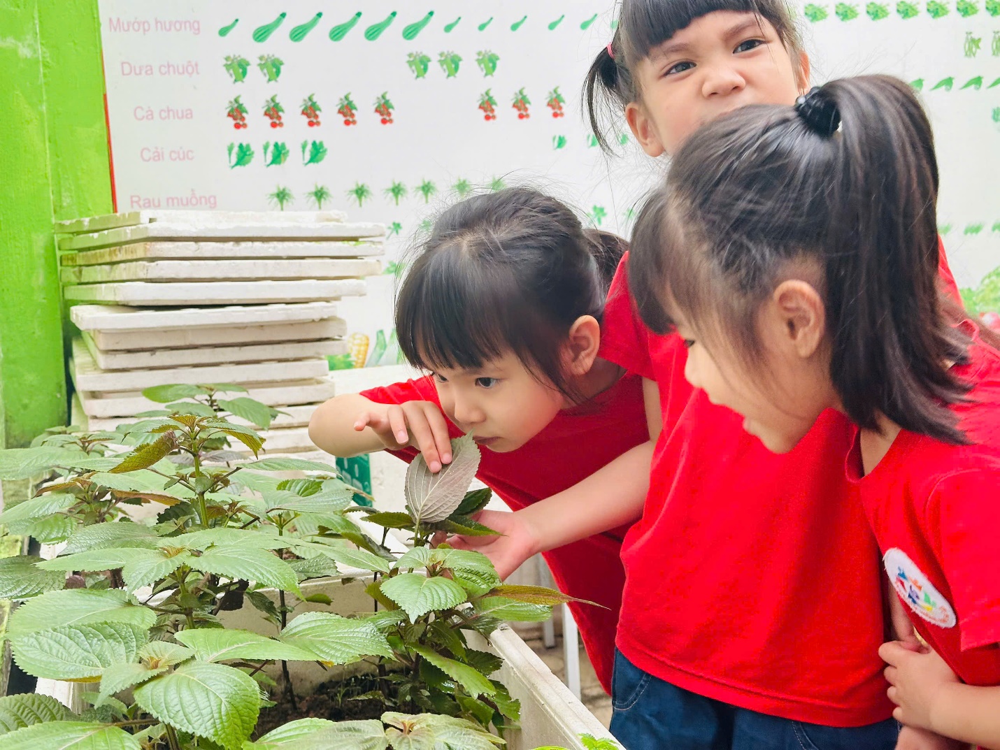Đầu tiên, các bé được đi tham quan vườn rau xanh của nhà trường. Khi đi thăm vườn rau, các bé được dạo chơi, hít thở không khí trong lành, hoà mình với thiên nhiên, môi trường bên ngoài và còn giúp các bé được quan sát, trải nghiệm thực tế về các loại rau xanh mà các bé ăn hàng ngày. Các bé đã biết tên gọi một số loại rau,trẻ đã hiểu được rau xanh có rất nhiều vitamin có lợi cho sức khỏe - giúp trẻ thích ăn thật nhiều rau, củ, quả để cơ thể khỏe mạnh và nhanh lớn.
