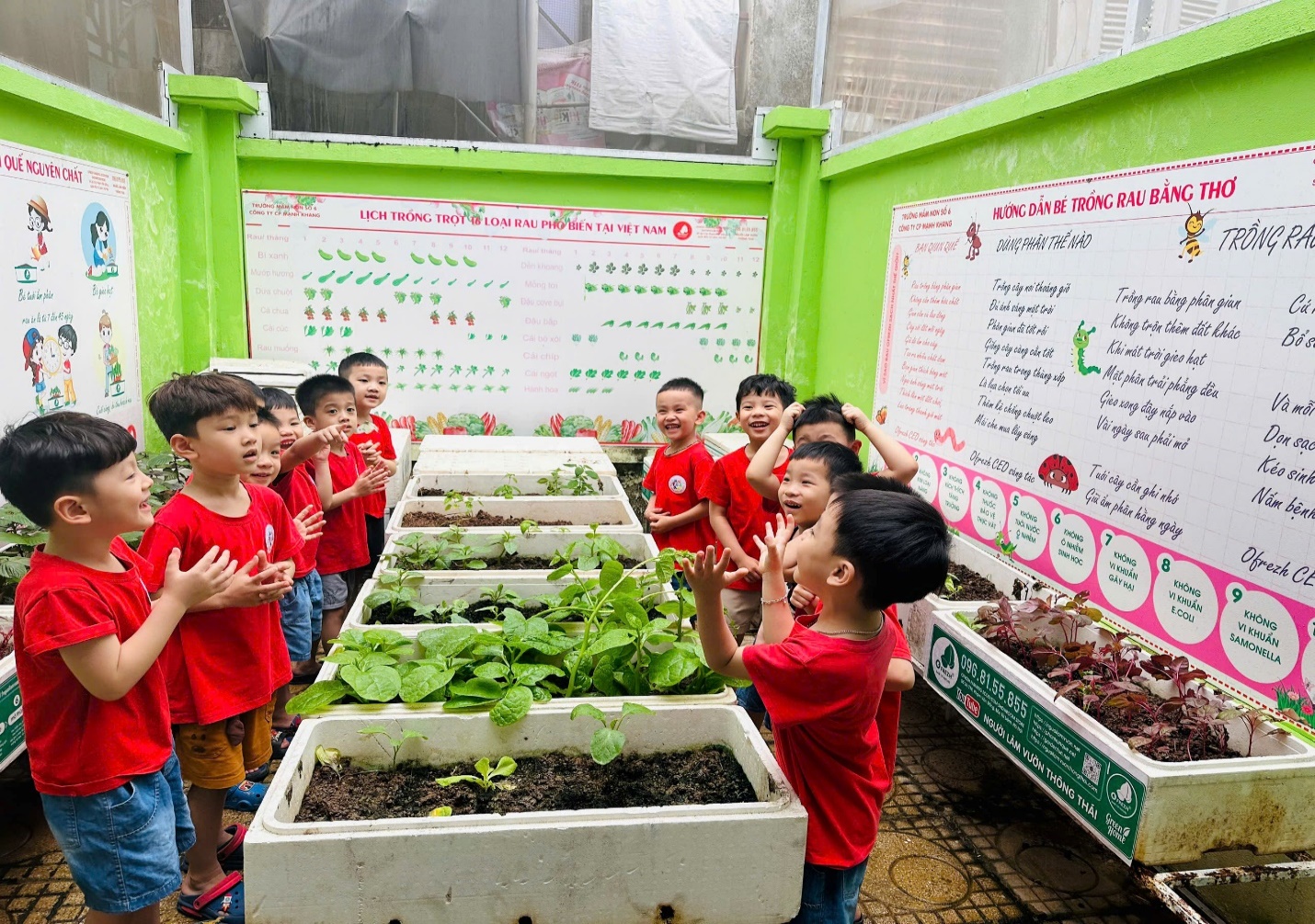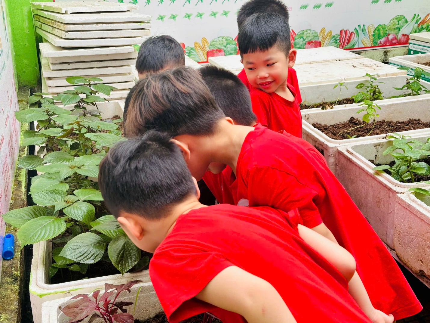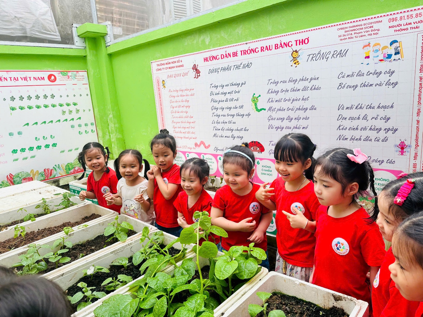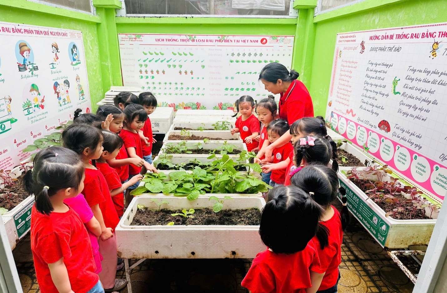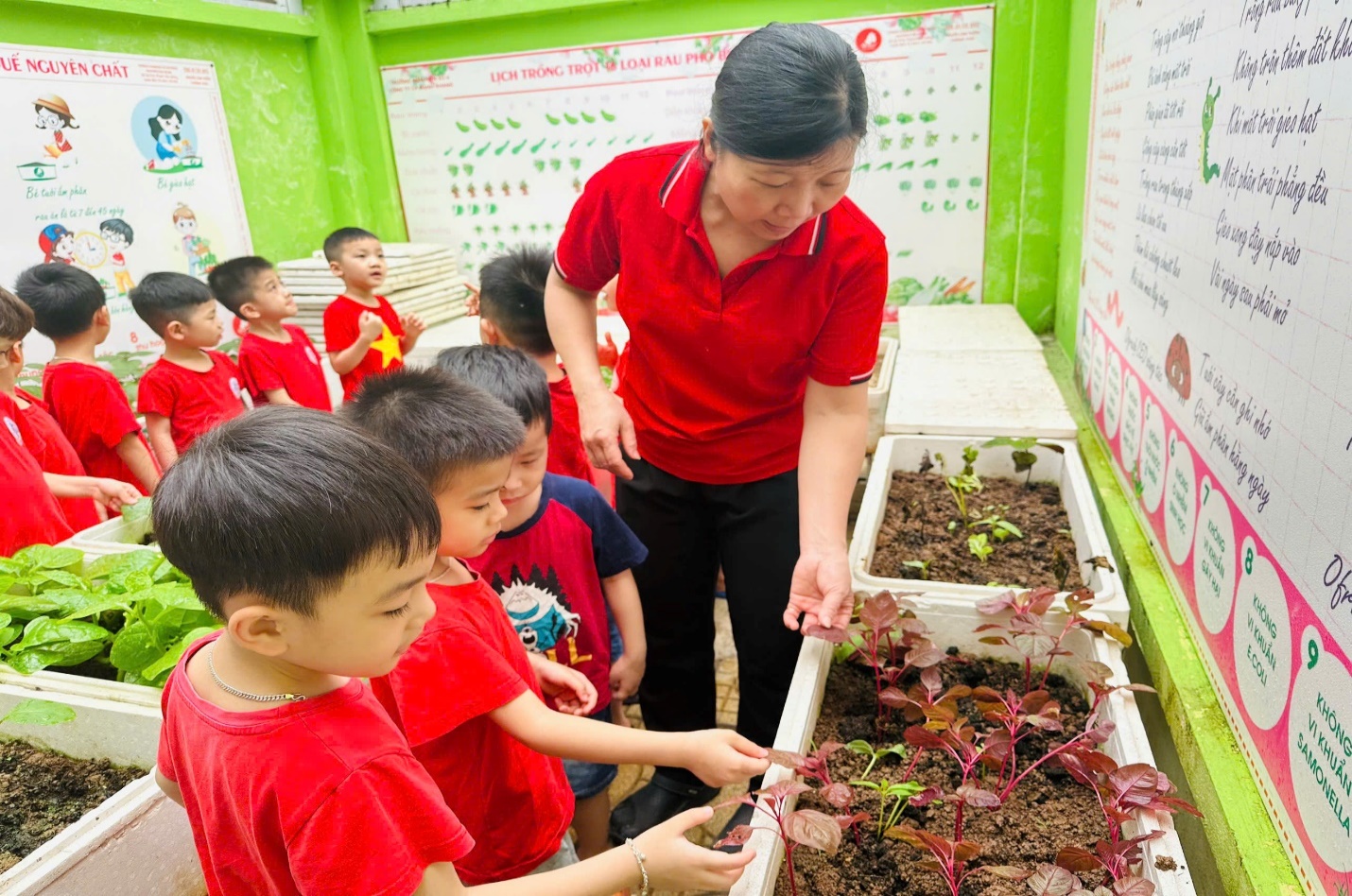 Đầu tiên, các bé được đi tham quan vườn rau xanh của nhà trường. Khi đi thăm vườn rau, các bé được dạo chơi, hít thở không khí trong lành, hoà mình với thiên nhiên, môi trường bên ngoài và còn giúp các bé được quan sát, trải nghiệm thực tế về các loại rau xanh mà các bé ăn hàng ngày. Các bé đã biết tên gọi một số loại rau,trẻ đã hiểu được rau xanh có rất nhiều vitamin có lợi cho sức khỏe - giúp trẻ thích ăn thật nhiều rau, củ, quả để cơ thể khỏe mạnh và nhanh lớn.