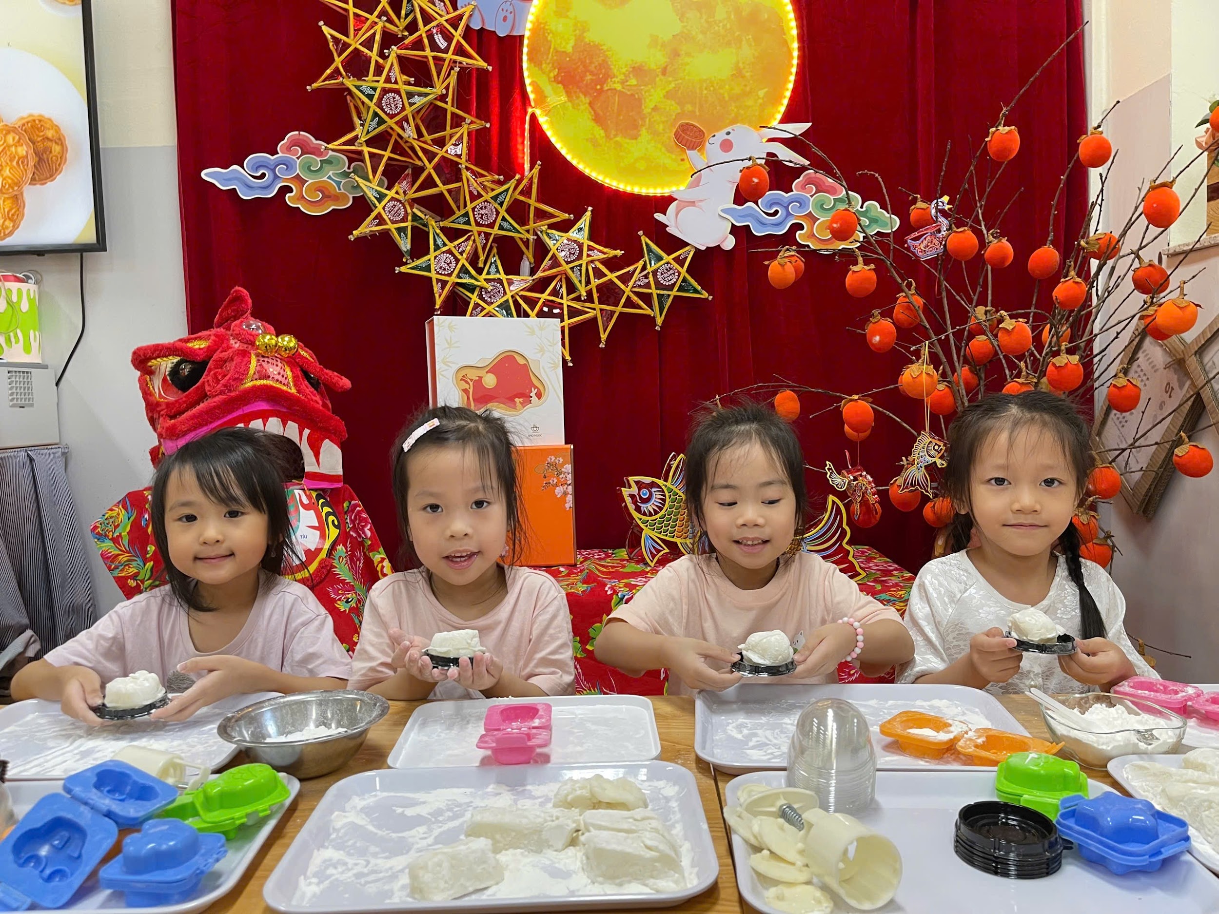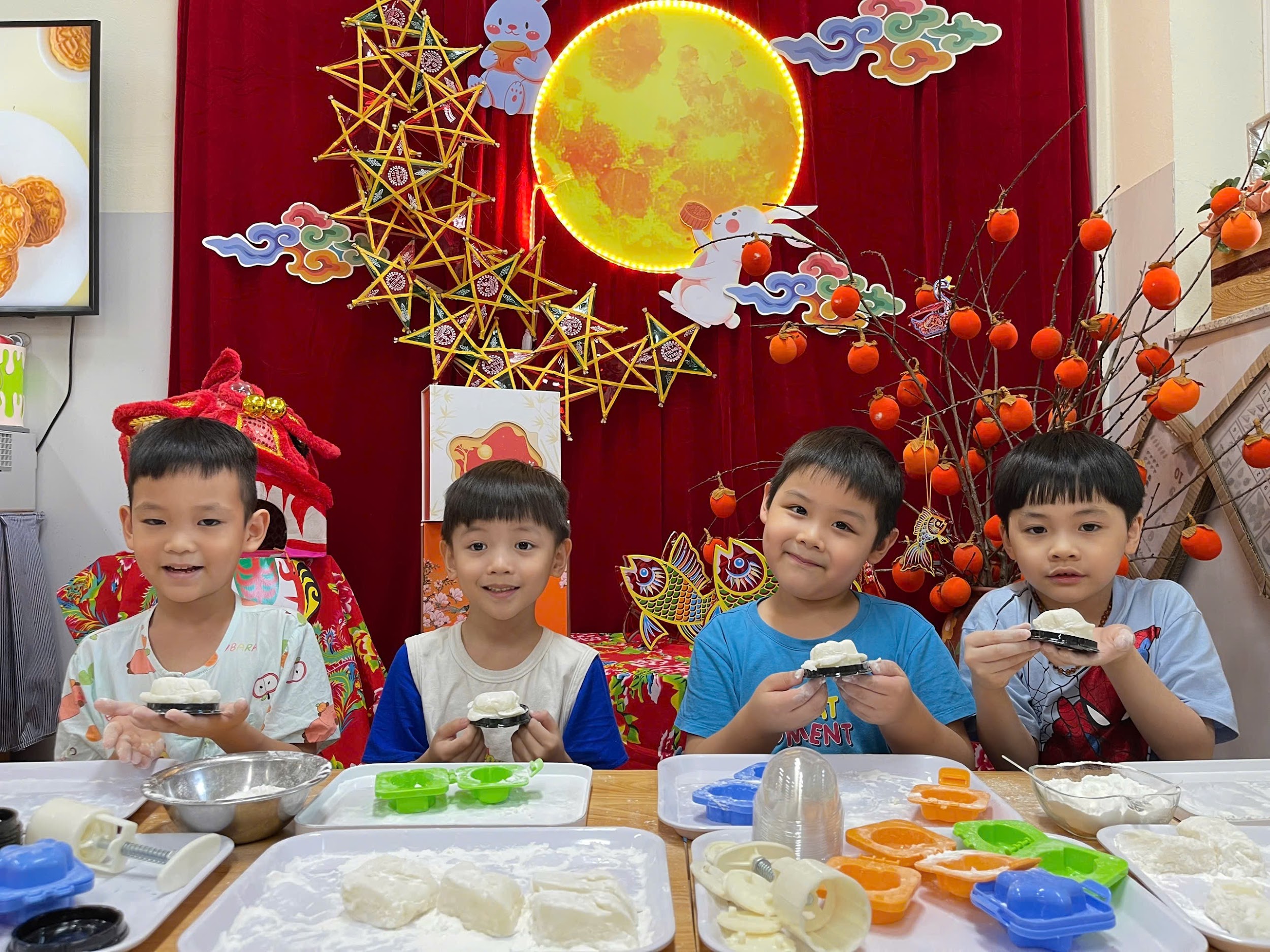 Tiếp nối niềm vui ấy là buổi trải nghiệm làm bánh dẻo Trung thu. Cả lớp rộn ràng tiếng cười, tiếng nói chuyện tíu tít khi cùng nhau nhào bột, nặn bánh, ép khuôn. Mỗi chiếc bánh, dù chưa thật tròn trịa, vẫn chứa đựng niềm vui và sự cố gắng của các con. Hoạt động không chỉ giúp trẻ rèn luyện kỹ năng vận động tinh, sự kiên trì, mà còn giúp các con hiểu thêm về ý nghĩa của Tết Trung thu – ngày đoàn viên, sẻ chia và yêu thương.