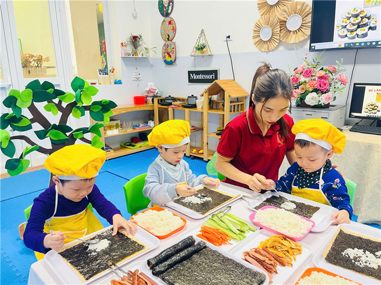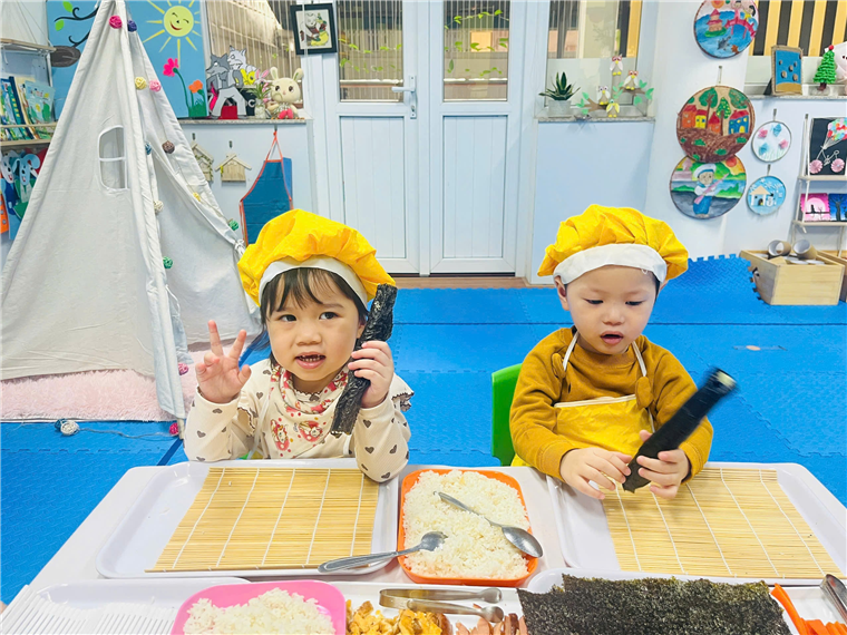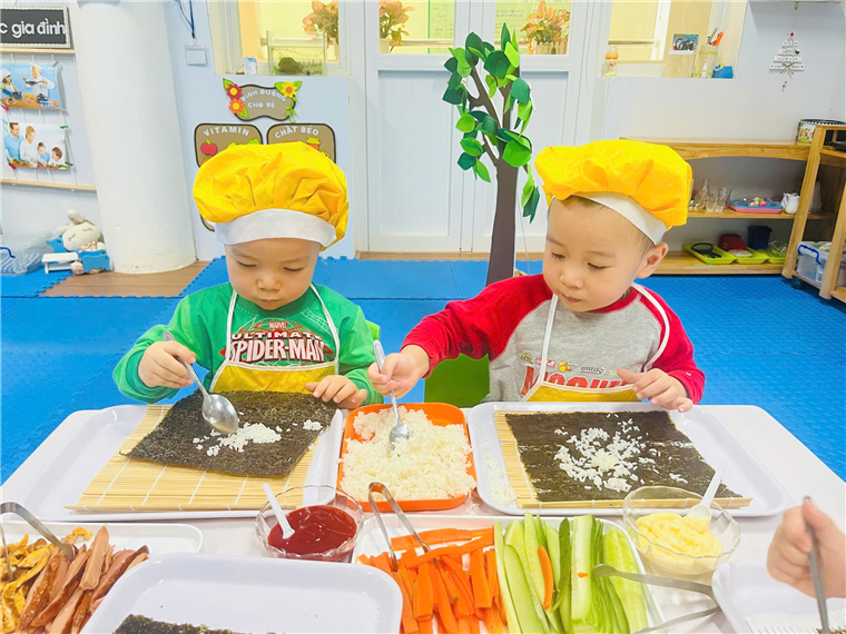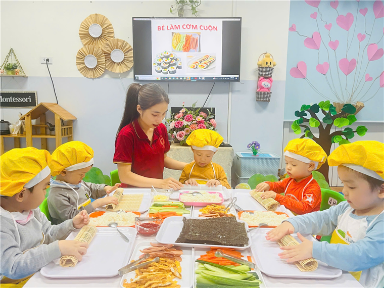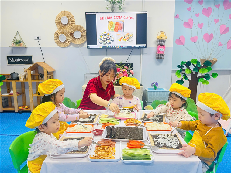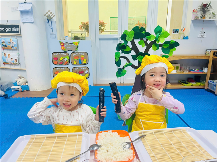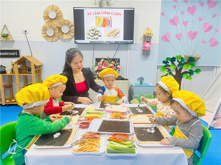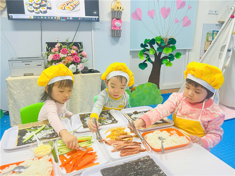Dưới sự hướng dẫn của cô giáo, đôi bàn tay bé nhỏ của các bé đã tự mình làm ra những cuộn cơm khéo léo khi sắp xếp từng nguyên vật liệu, nhiều màu sắc, đầy đủ chất dinh dưỡng. Sự thích thú của các bé hiện rõ trên từng gương mặt với những ánh mắt, nụ cười trên môi.