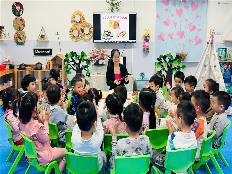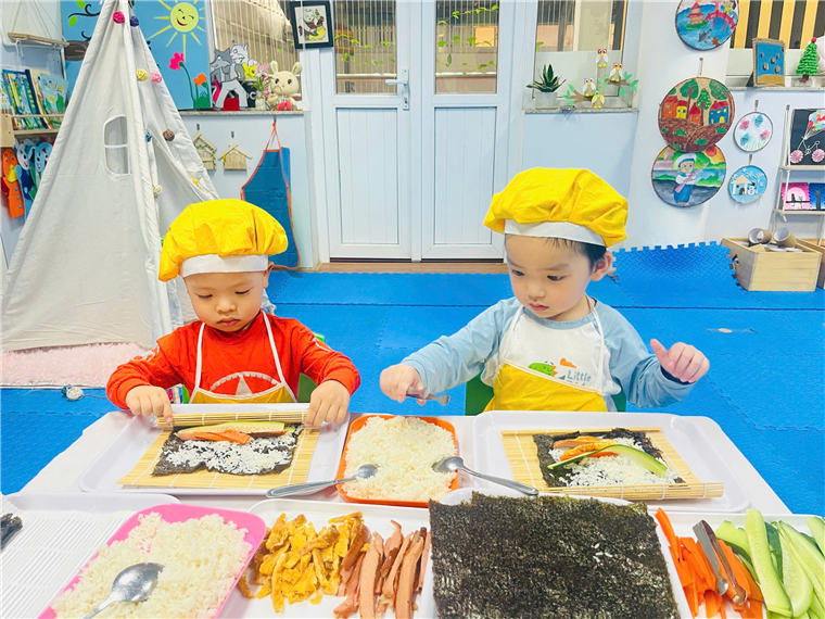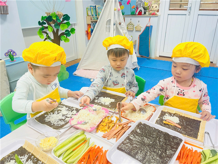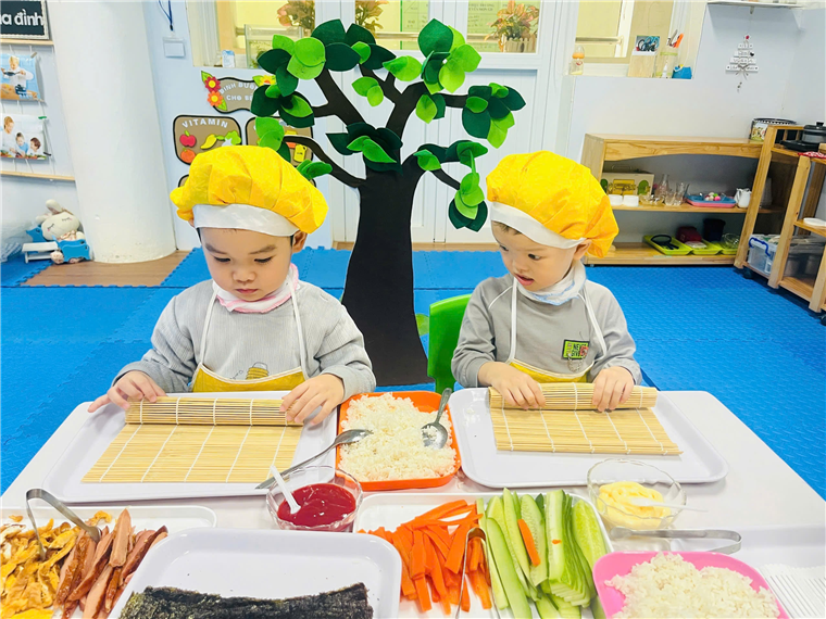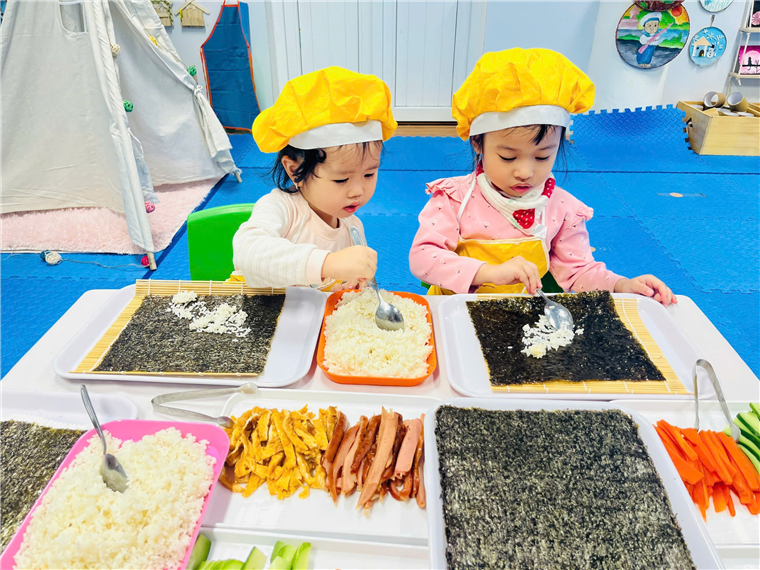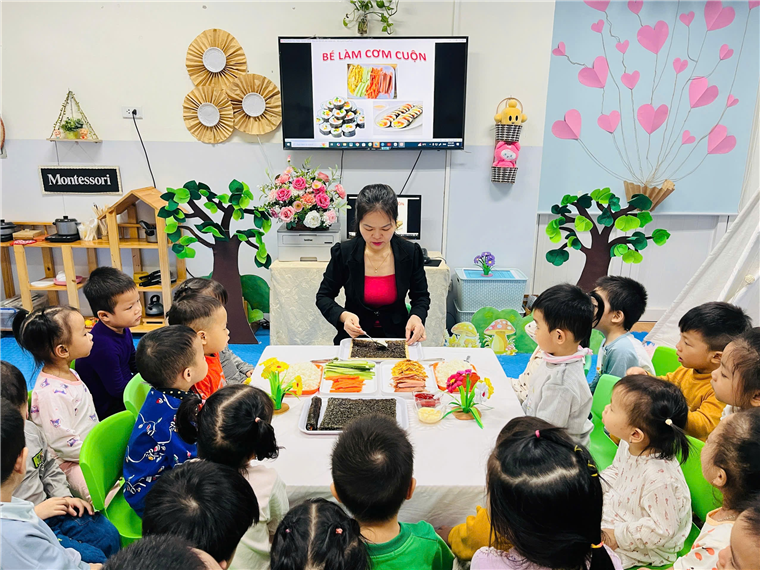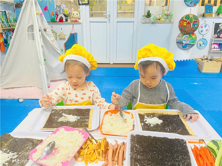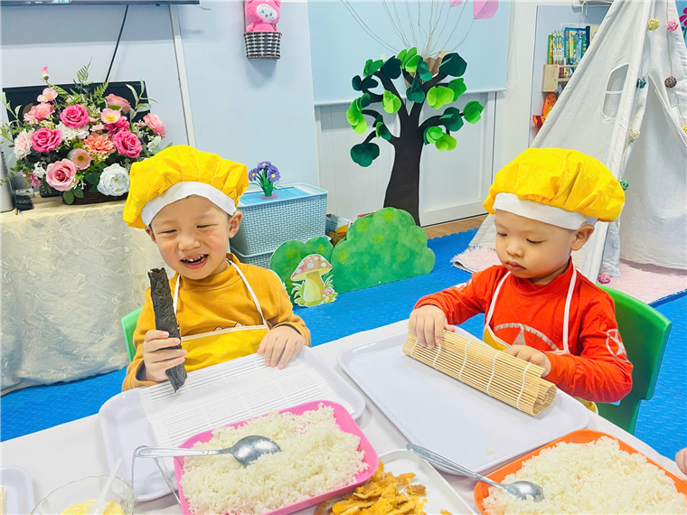 Dưới sự hướng dẫn của cô giáo, đôi bàn tay bé nhỏ của các bé đã tự mình làm ra những cuộn cơm khéo léo khi sắp xếp từng nguyên vật liệu, nhiều màu sắc, đầy đủ chất dinh dưỡng. Sự thích thú của các bé hiện rõ trên từng gương mặt với những ánh mắt, nụ cười trên môi.