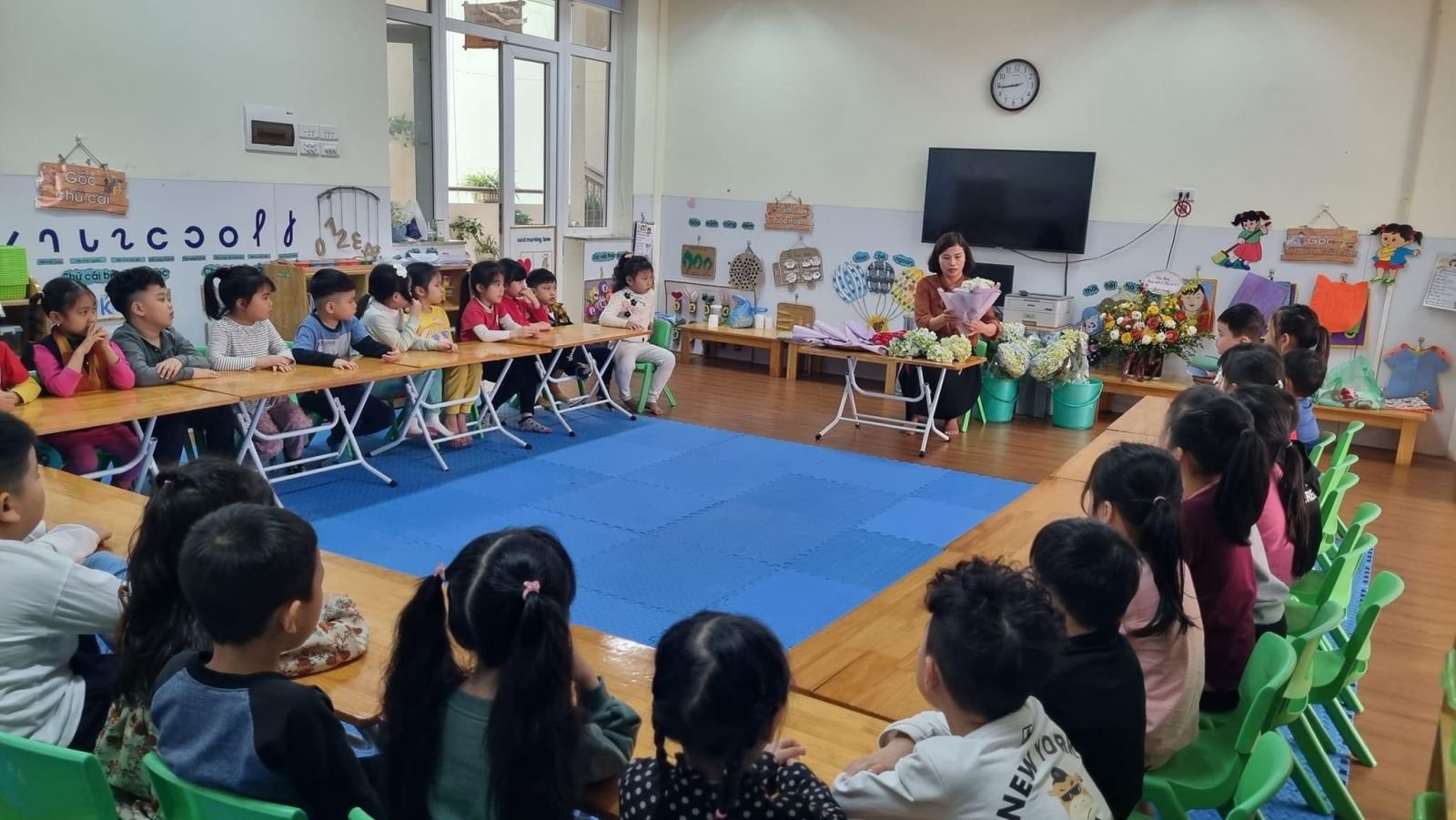 Các cô giáo hướng dẫn các bé cách chọn hoa, giấy gói và cách gói hoa.