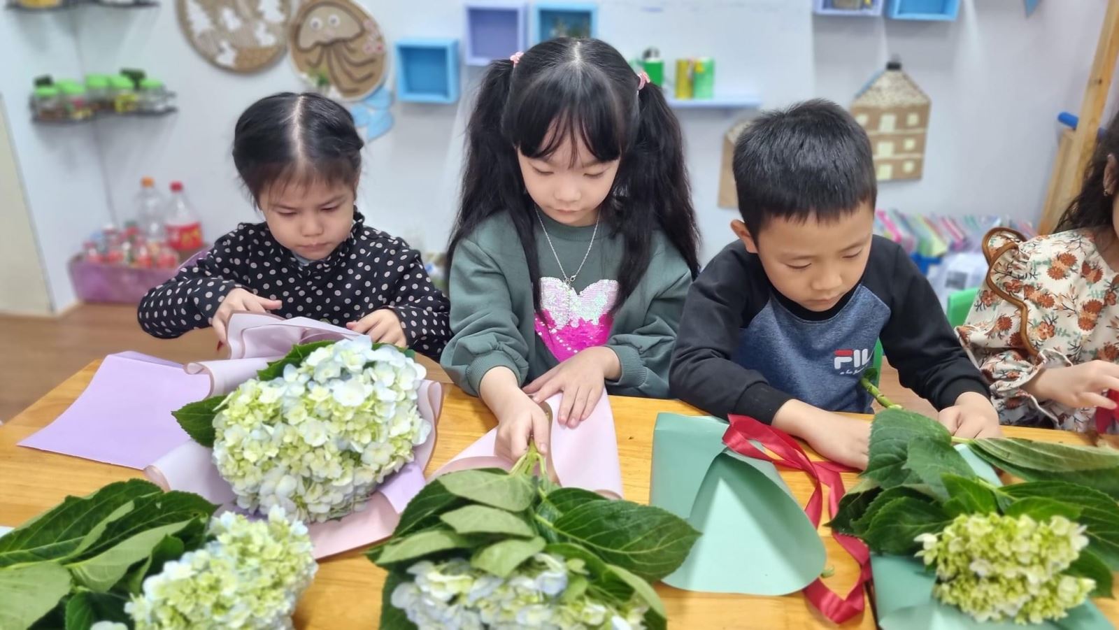 Qua những nguyên liệu mà các cô đã chuẩn bị như: Hoa, giấy màu, dây ruy băng, giấy nhũ, lưới gói hoa…các bé lớp A1 rất vui và hào hứng thể hiện sự khéo léo của đôi bàn tay để gói những bông hoa tươi thắm mang về tặng mẹ. Có thể những sản phẩm mà các con làm ra chưa hoàn hảo nhưng đó là tình cảm, sự yêu thương, trân trọng của các con gửi đến người mẹ của mình.