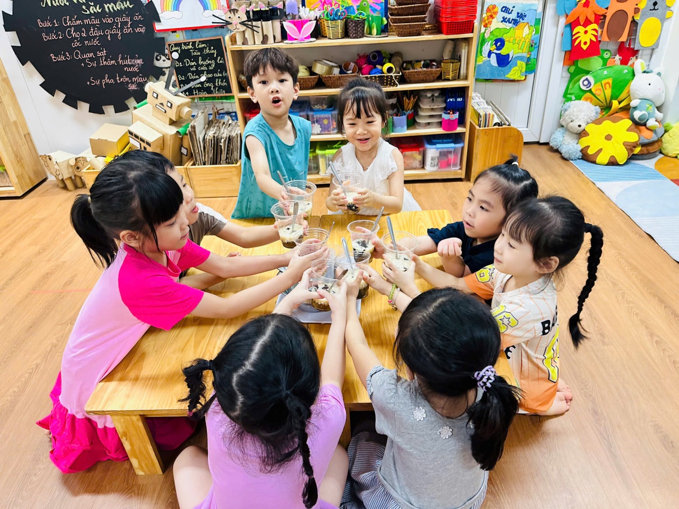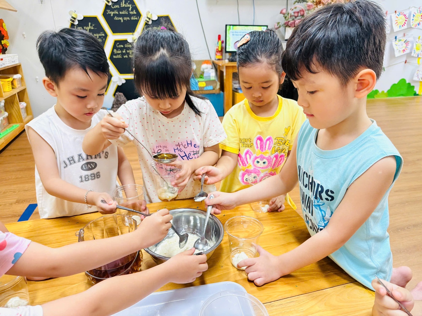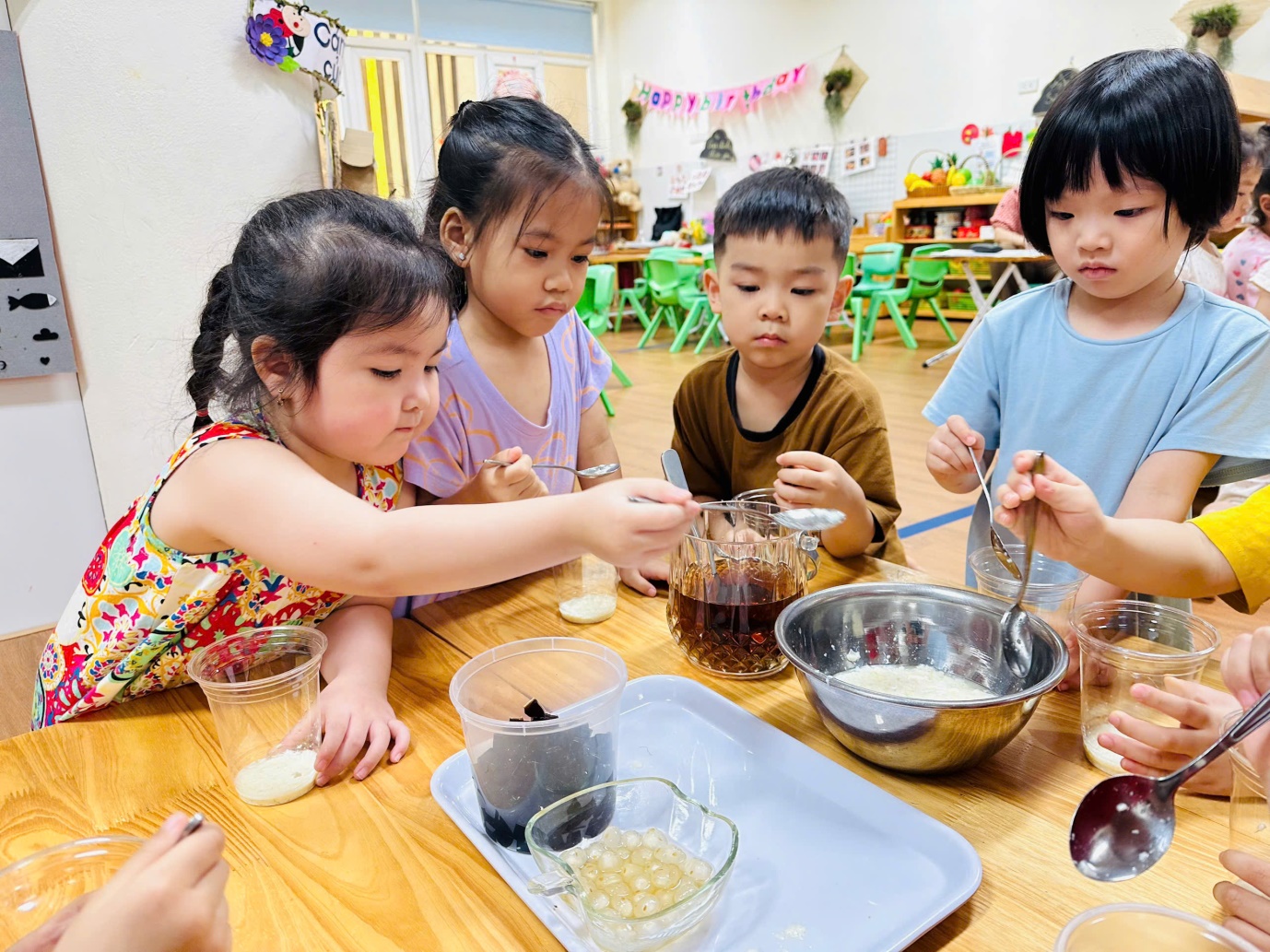 Đặc biệt những ngày hè nắng nóng, được ăn một cốc tào phớ sẽ giúp giải nhiệt cơ thể, vì vậy, các bạn nhỏ lớp MGN B1 đã được cô giáo hướng dẫn pha chế món tào phớ trân châu hấp dẫn.