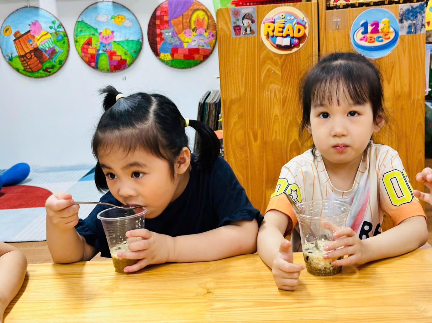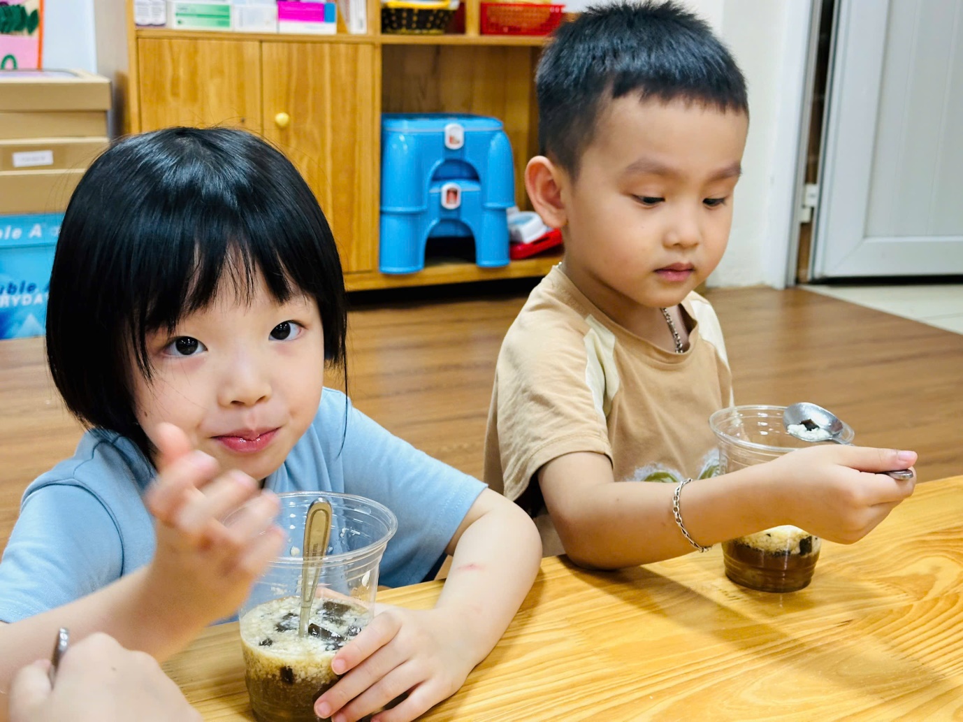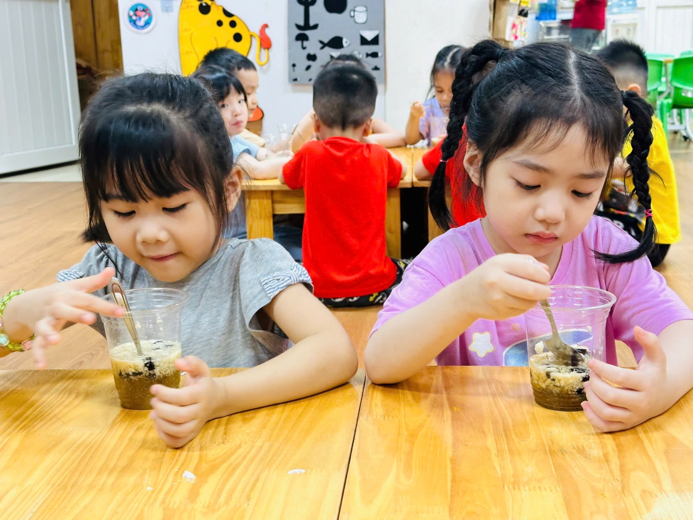 Các bạn nhỏ vô cùng hào hứng và thích thú khi được thực hiện và thưởng thức cốc tào phớ mát ngọt. Mời bố mẹ cùng ngắm một số hình ảnh của các con nhé!