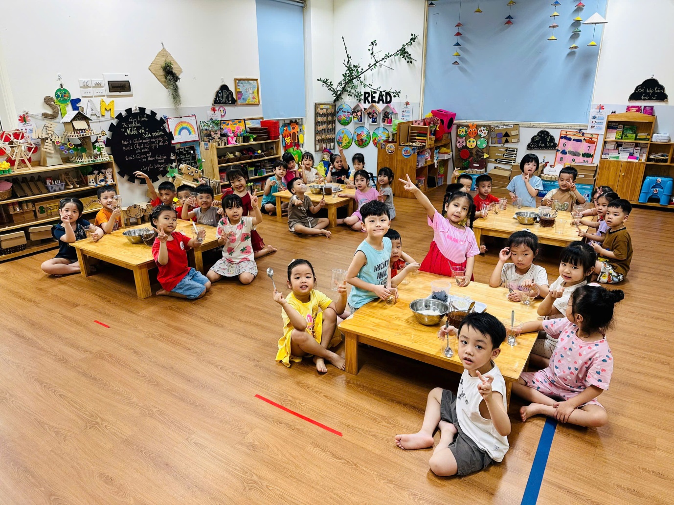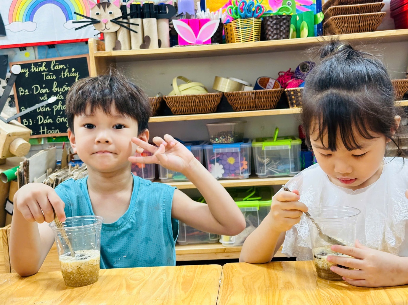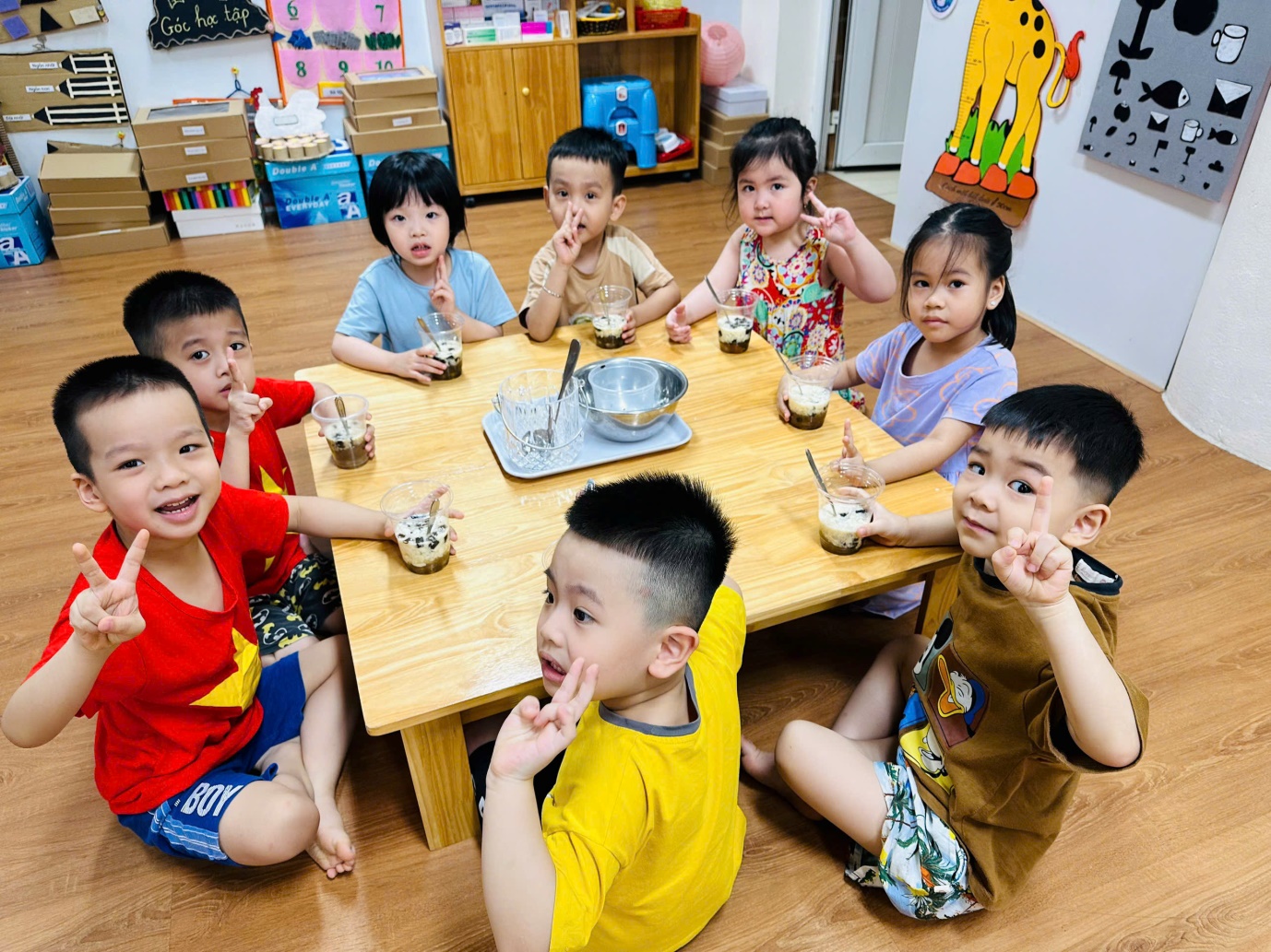 Các bạn nhỏ vô cùng hào hứng và thích thú khi được thực hiện và thưởng thức cốc tào phớ mát ngọt. Mời bố mẹ cùng ngắm một số hình ảnh của các con nhé!