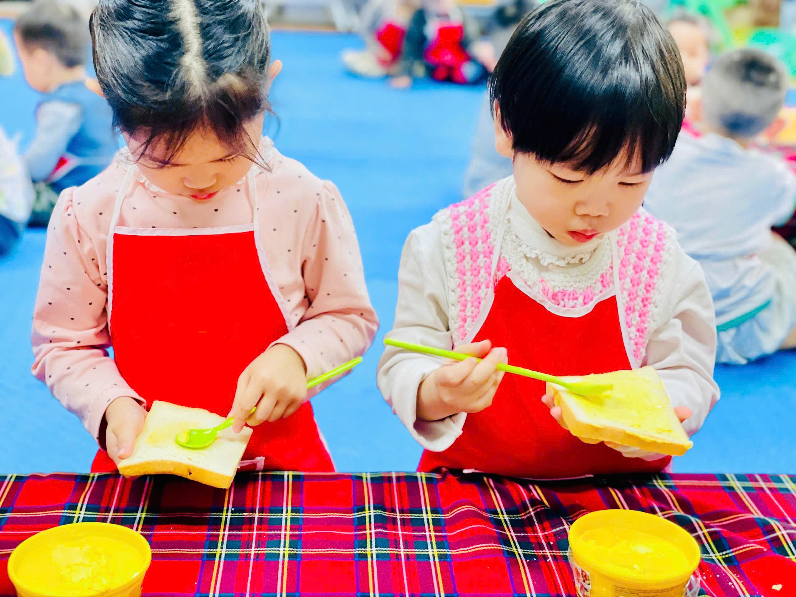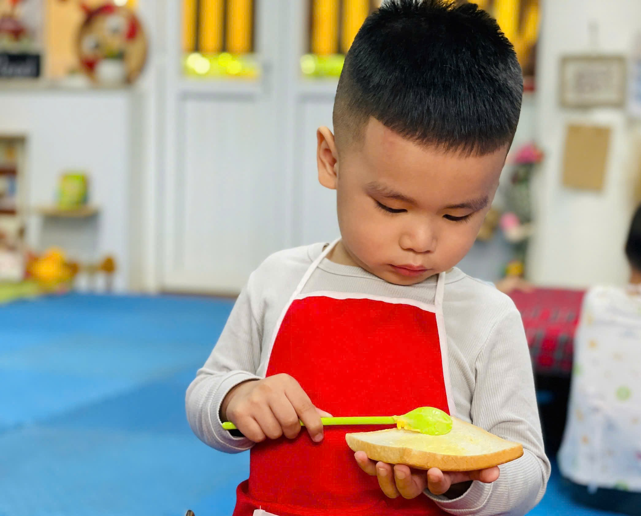 Dưới sự hướng dẫn của các cô, các bé được tự tay phết bơ, rắc đường và được cô giúp nướng những lát bánh mì thơm ngon. Bạn nào cũng rất háo hức, chăm chú quan sát và khéo léo thực hiện từng bước một, rồi lại được thưởng thức ngay sản phẩm thơm ngon mà mình tự làm.