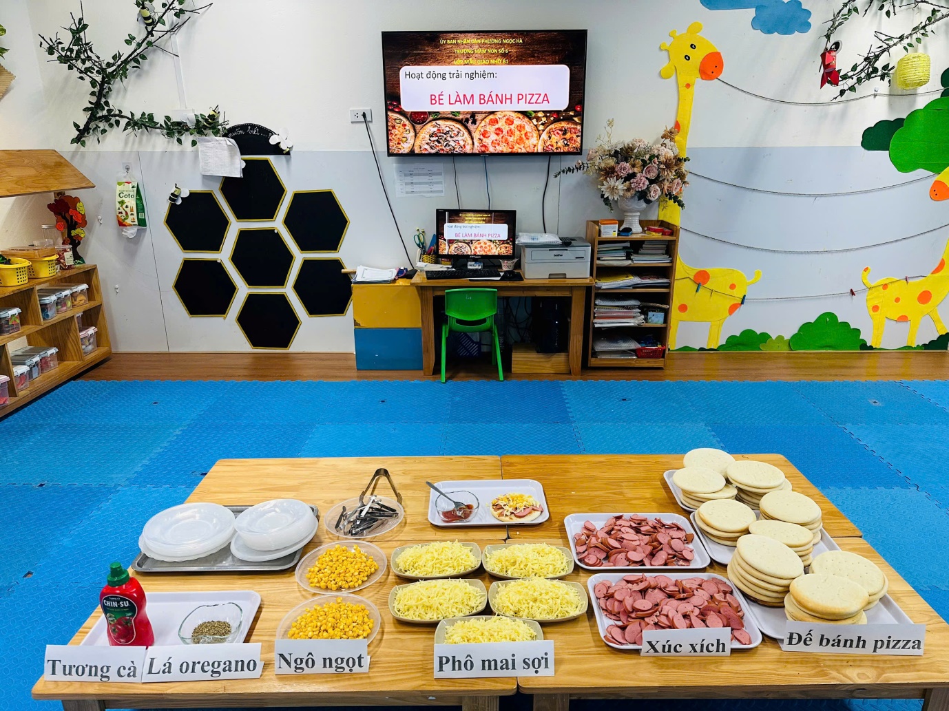 Đầu tiên, các bạn nhỏ rất thích thú khi được cùng nhau tìm hiểu các loại nguyên liệu làm bánh như: đế bánh, xúc xích, ngô ngọt, tương cà chua và phomai. Các bạn nhỏ được cô giáo giới thiệu từng loại nguyên liệu, cách sơ chế và các bước thực hiện một chiếc bánh pizza hoàn chỉnh.