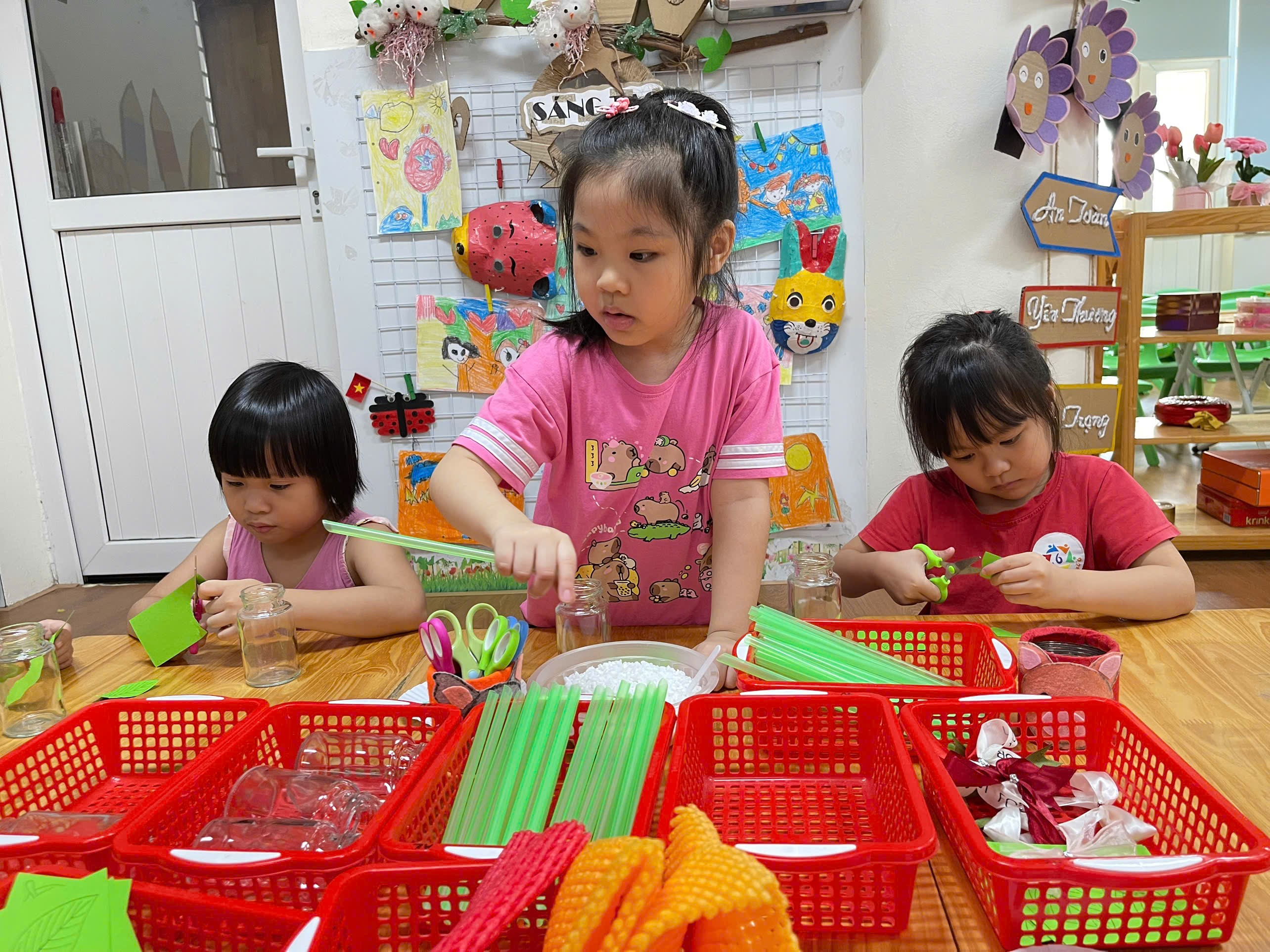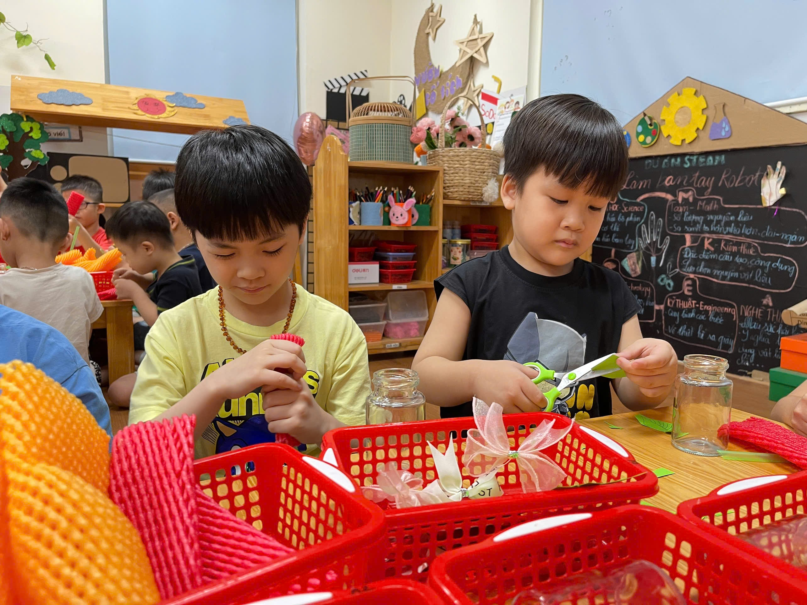 Trẻ bắt tay vào làm những bông hoa xinh xắn