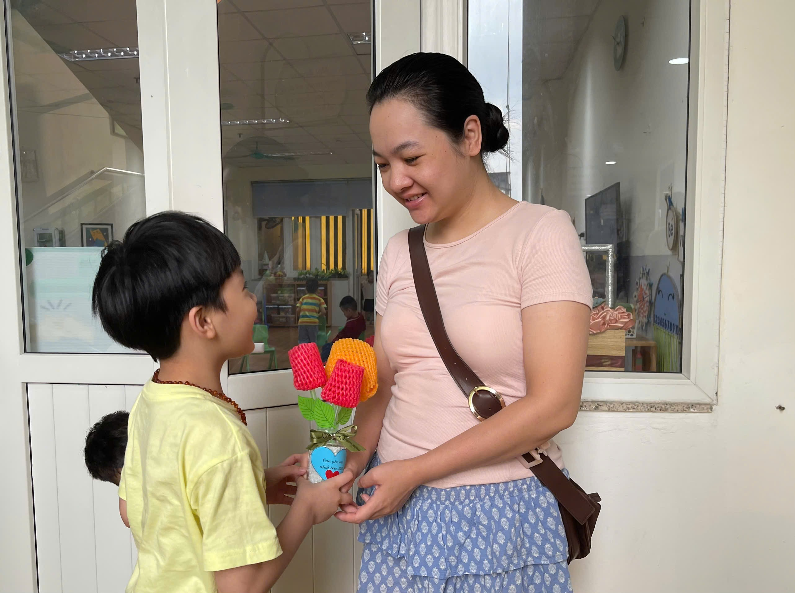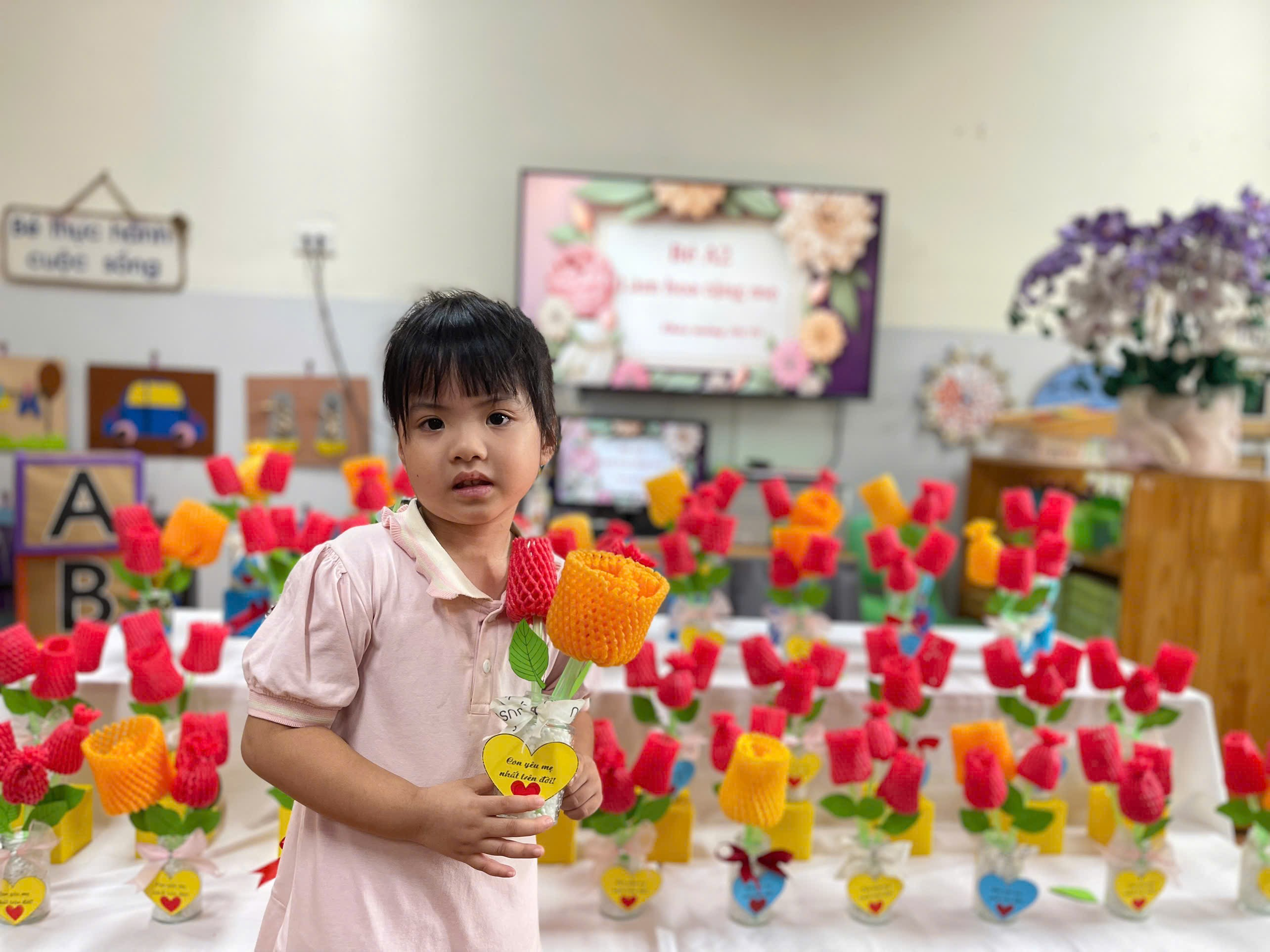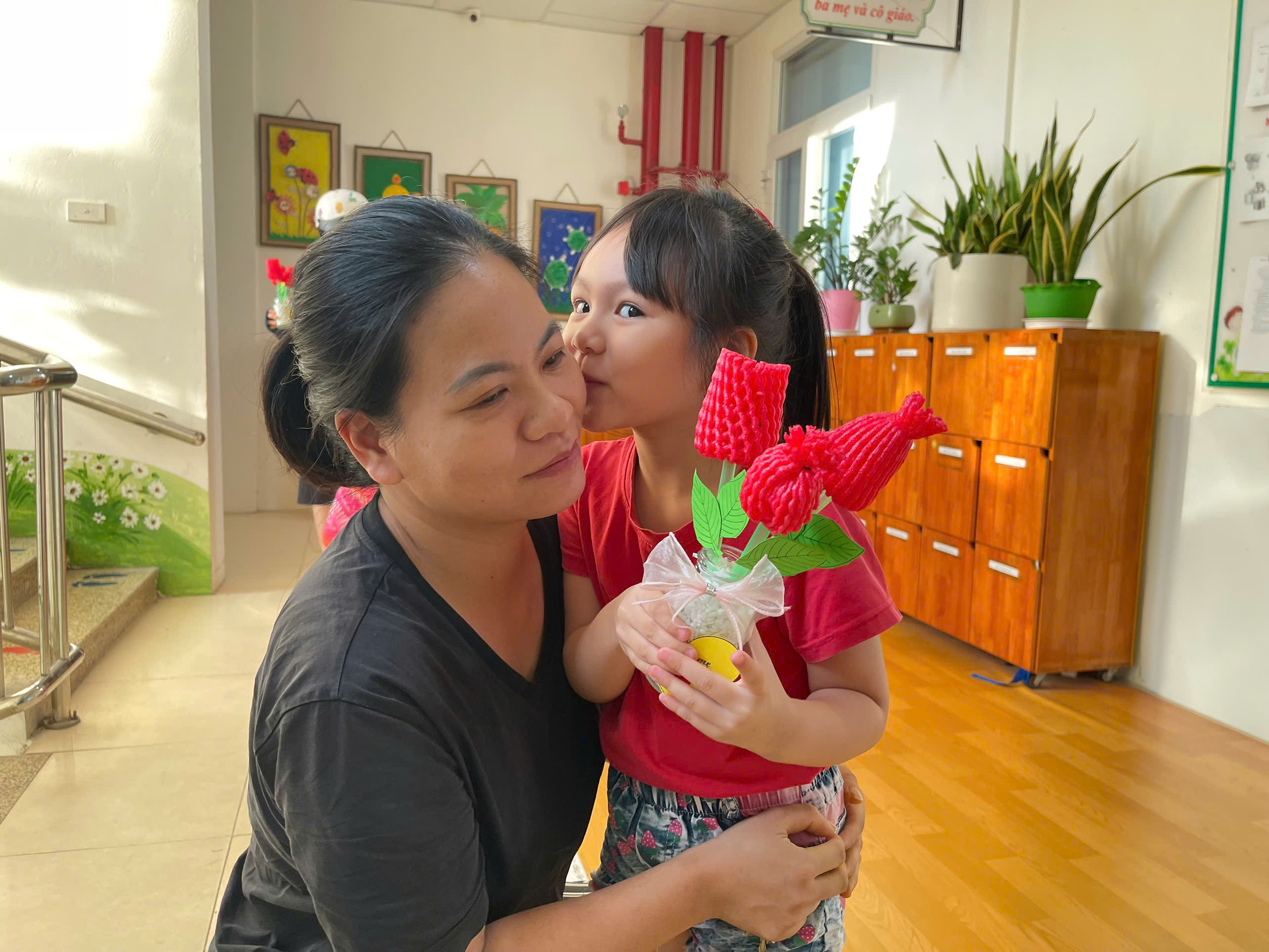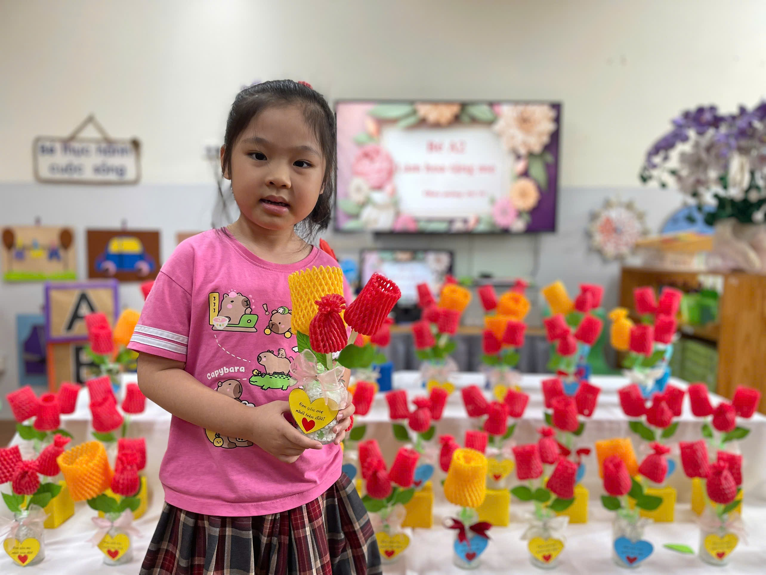 Từng chiếc lá, cánh hoa đều do chính đôi tay nhỏ bé của các con cắt dán, tỉ mỉ tạo nên những bông hoa xinh xắn, được cắm khéo léo vào lọ thuỷ tinh trong veo, thêm chiếc nơ nhỏ xinh – tất cả tạo nên món quà giản dị mà tràn đầy yêu thương.