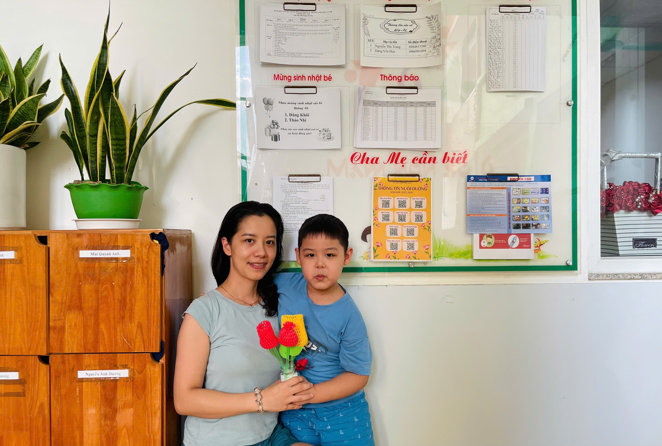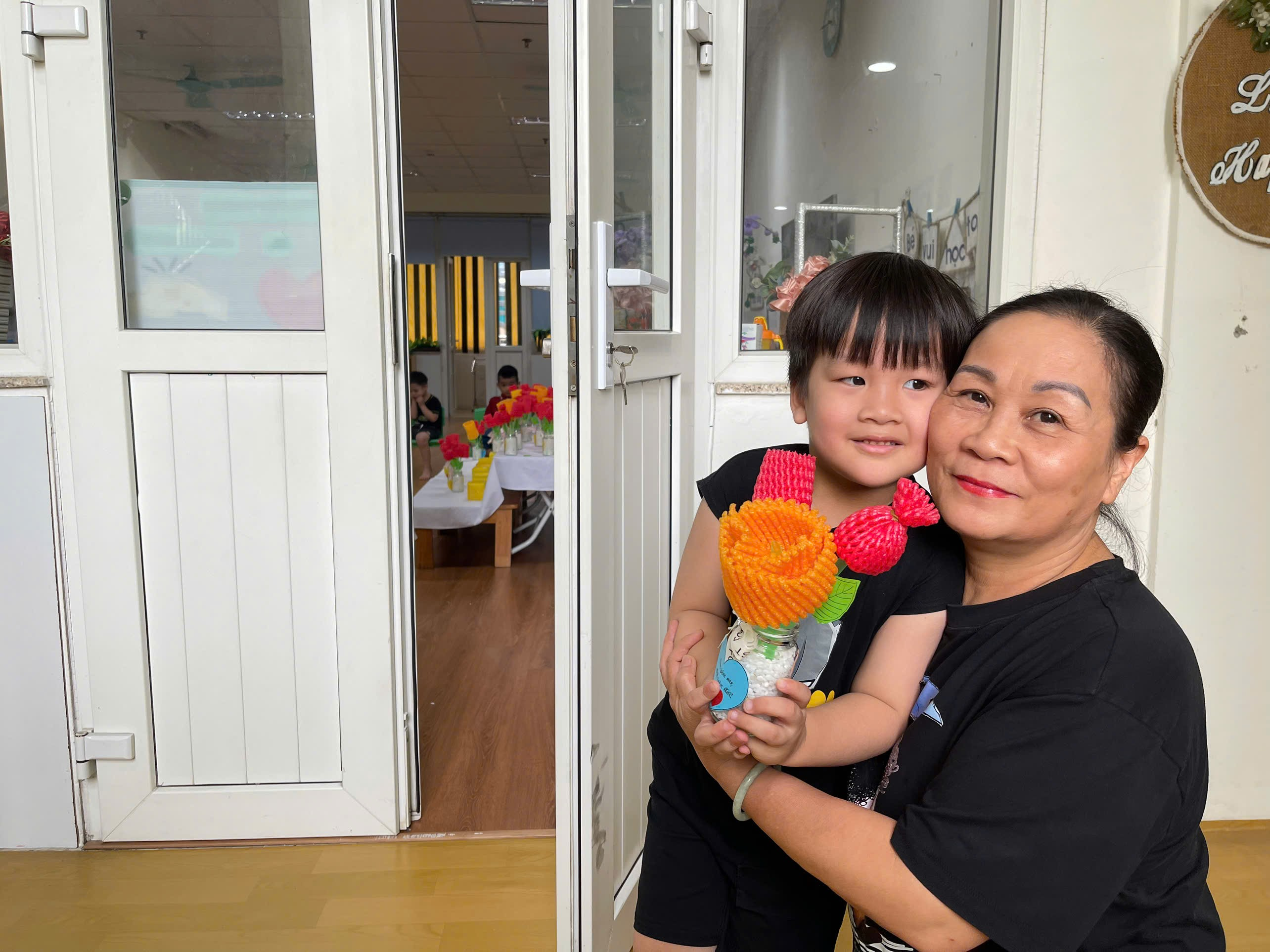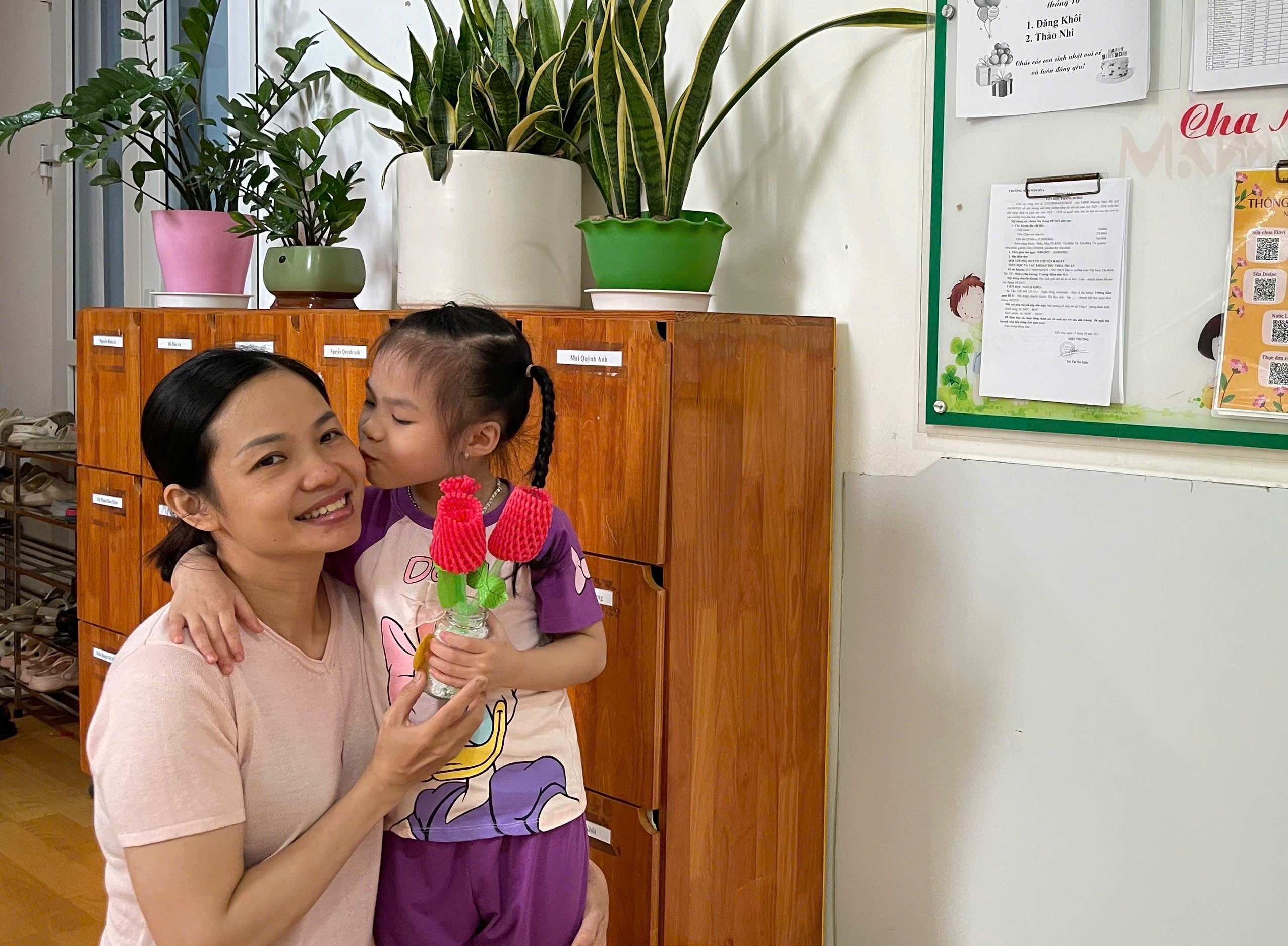 Từng chiếc lá, cánh hoa đều do chính đôi tay nhỏ bé của các con cắt dán, tỉ mỉ tạo nên những bông hoa xinh xắn, được cắm khéo léo vào lọ thuỷ tinh trong veo, thêm chiếc nơ nhỏ xinh – tất cả tạo nên món quà giản dị mà tràn đầy yêu thương.