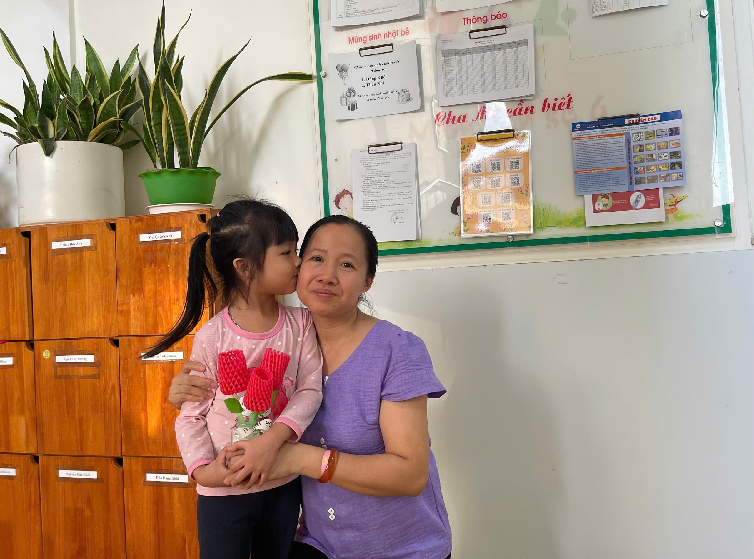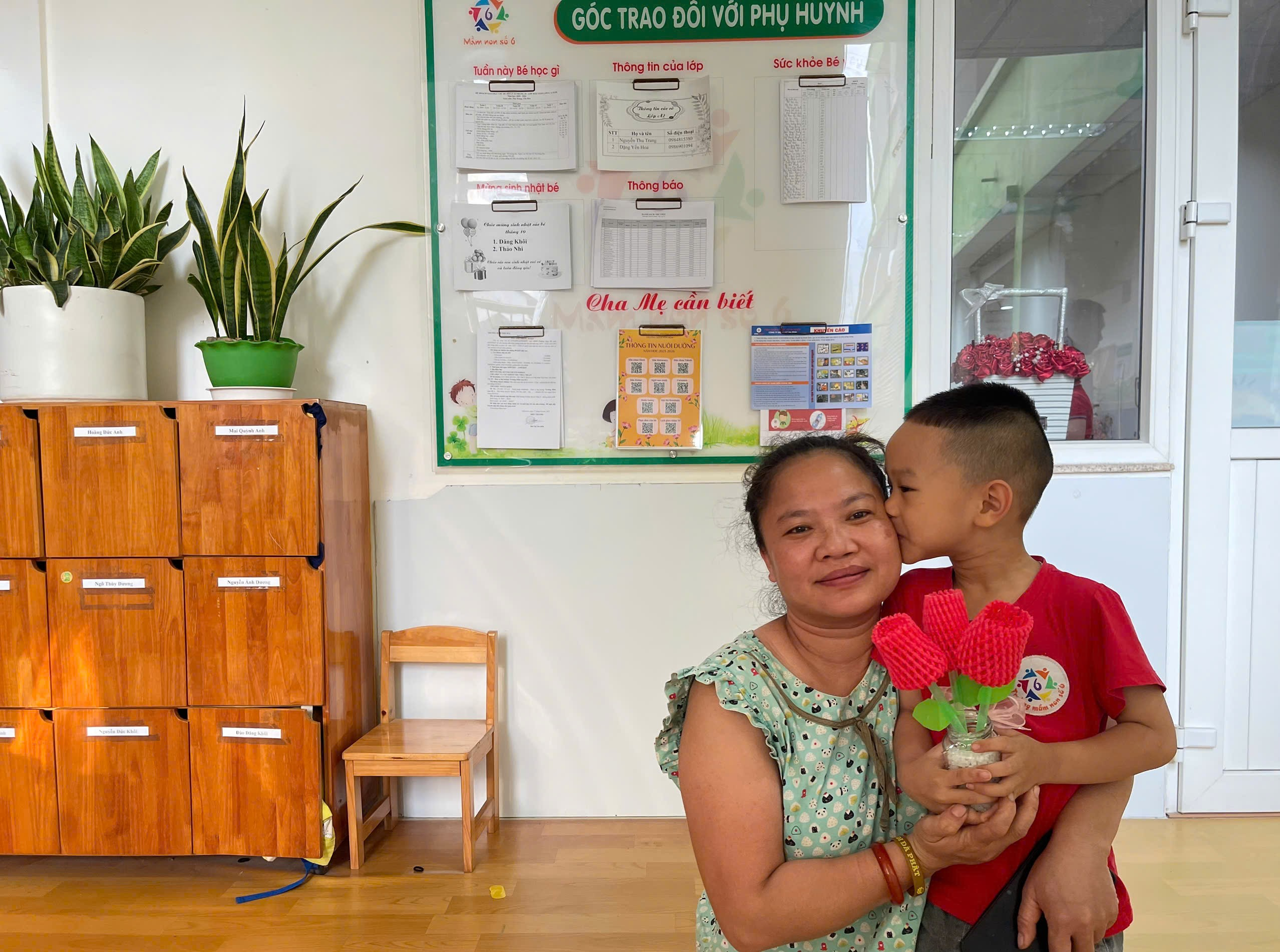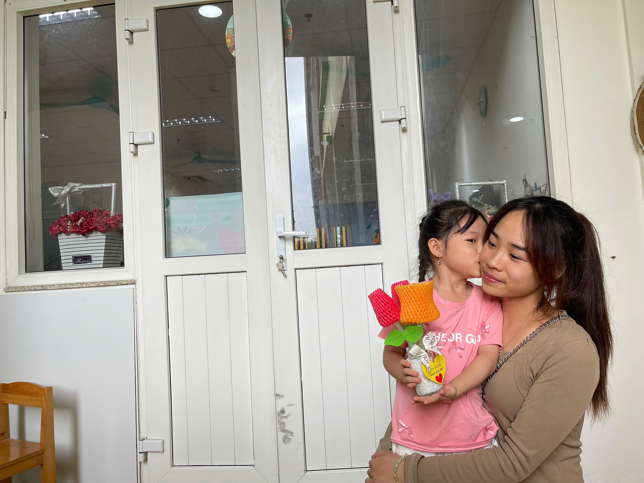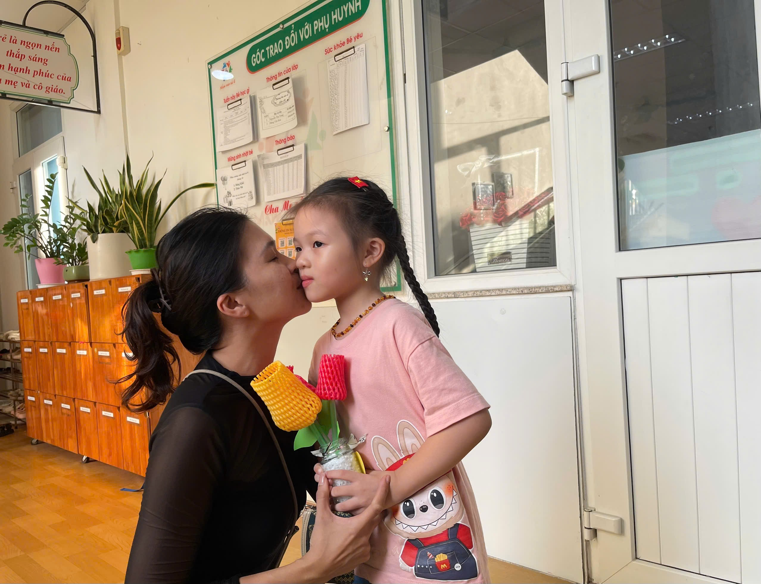 Từng chiếc lá, cánh hoa đều do chính đôi tay nhỏ bé của các con cắt dán, tỉ mỉ tạo nên những bông hoa xinh xắn, được cắm khéo léo vào lọ thuỷ tinh trong veo, thêm chiếc nơ nhỏ xinh – tất cả tạo nên món quà giản dị mà tràn đầy yêu thương.