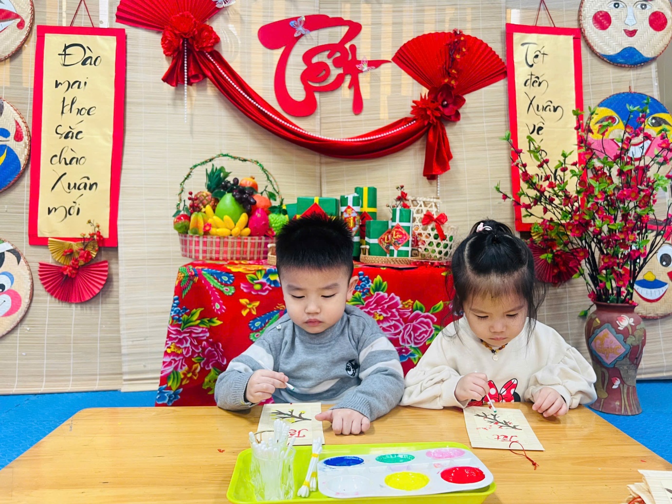 Từ những nguyên vật liệu đơn giản như tăm bông, giấy, màu nước. Các bạn nhỏ lớp MGB C2 đã khéo léo tạo nên những nhành hoa hoa đào rực rỡ sắc màu.