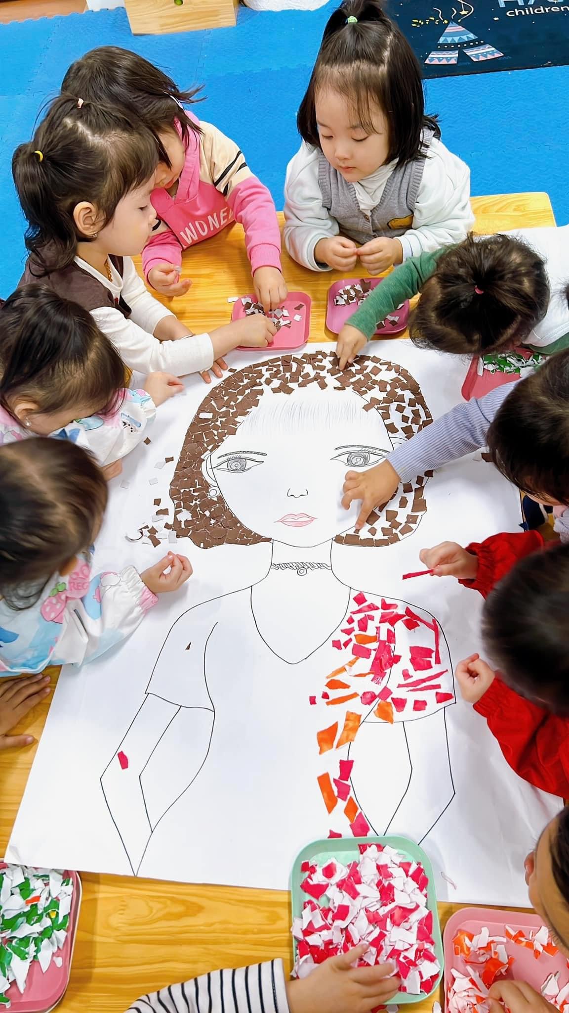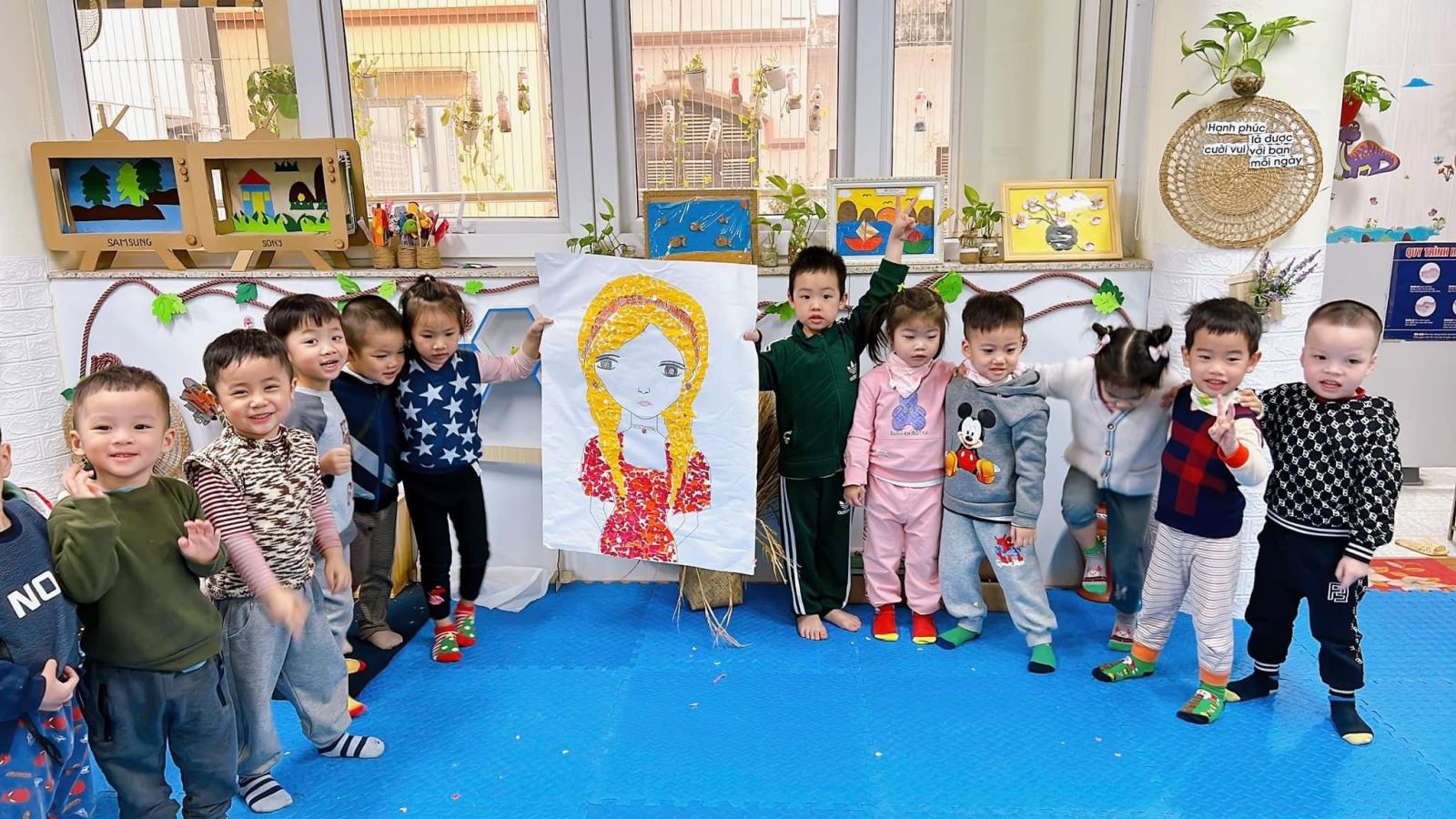 Các bé phối hợp nhóm để tạo bức tranh chân dung cô giáo.